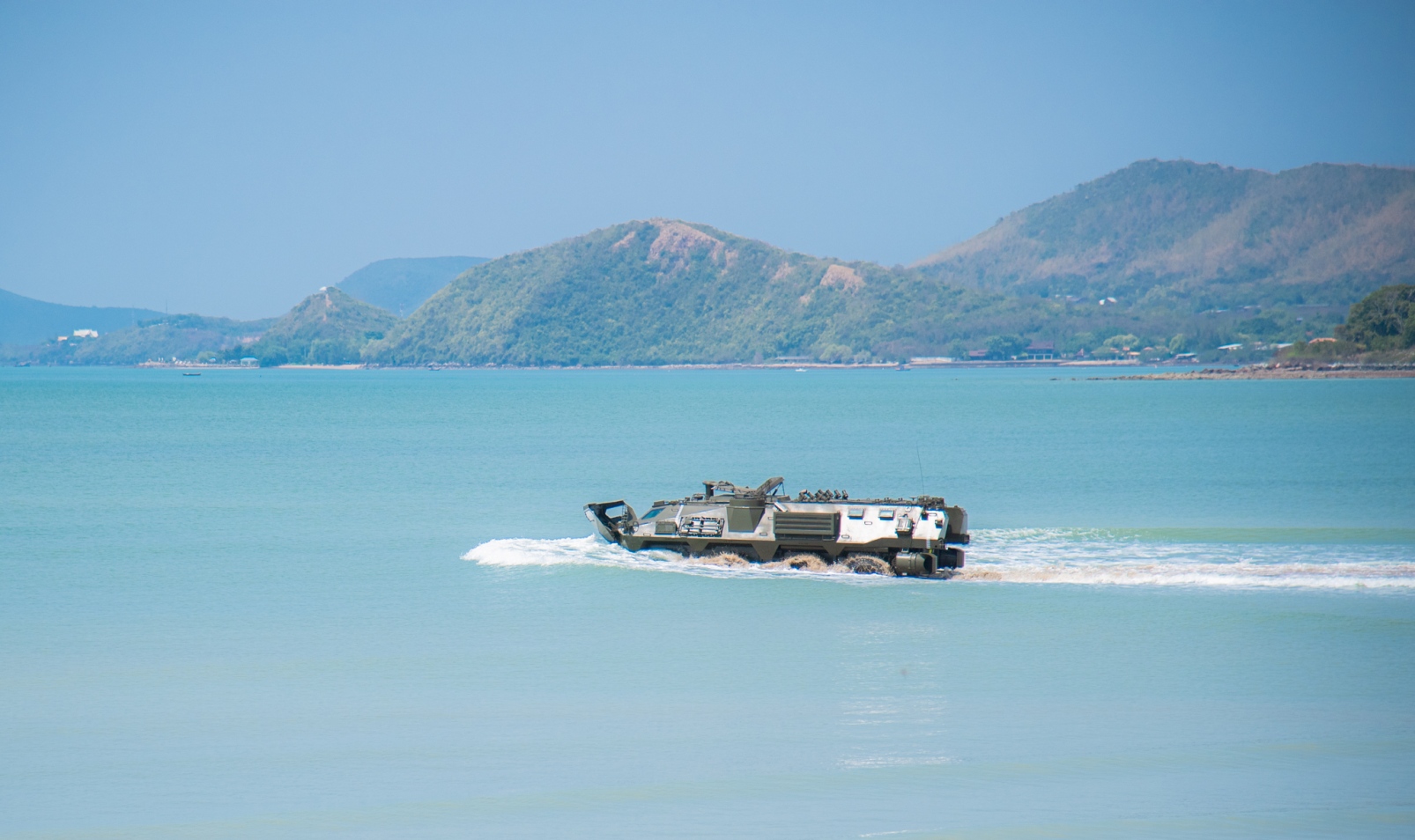 태국 해병대, 태국 해군, 국방기술연구소(DTI)가 참가한 가운데 8x8 차륜형 수륙양용장갑차(AAPC)의 공해상 시험이 태국 Chonburi 주 Sattahip 지구 Plutaluang 하위 지구에서 왕립 태국 해병대 사단 예하 강습 상륙대대의 주도하에 수행중인 모습들