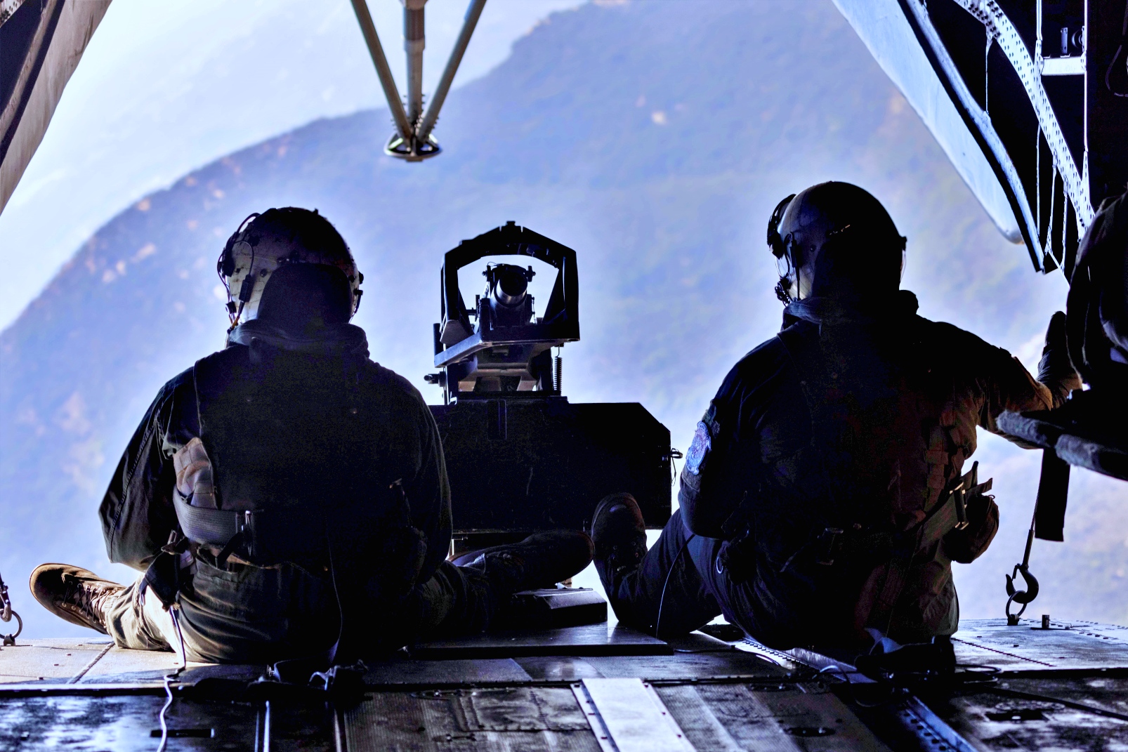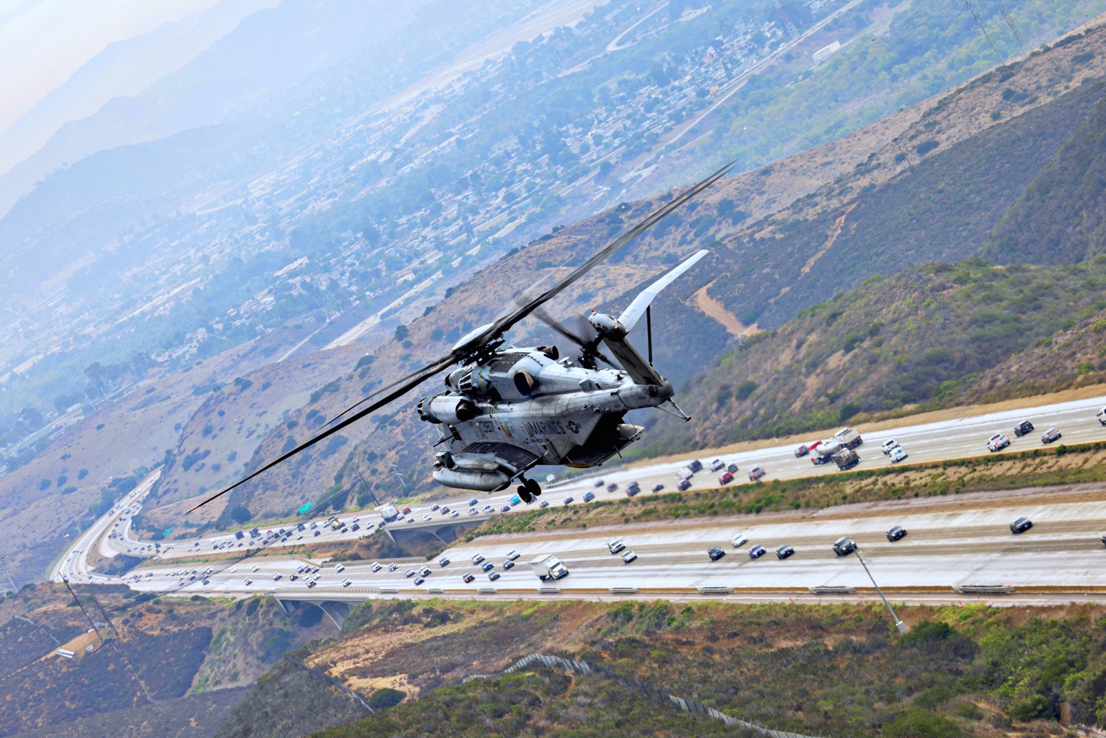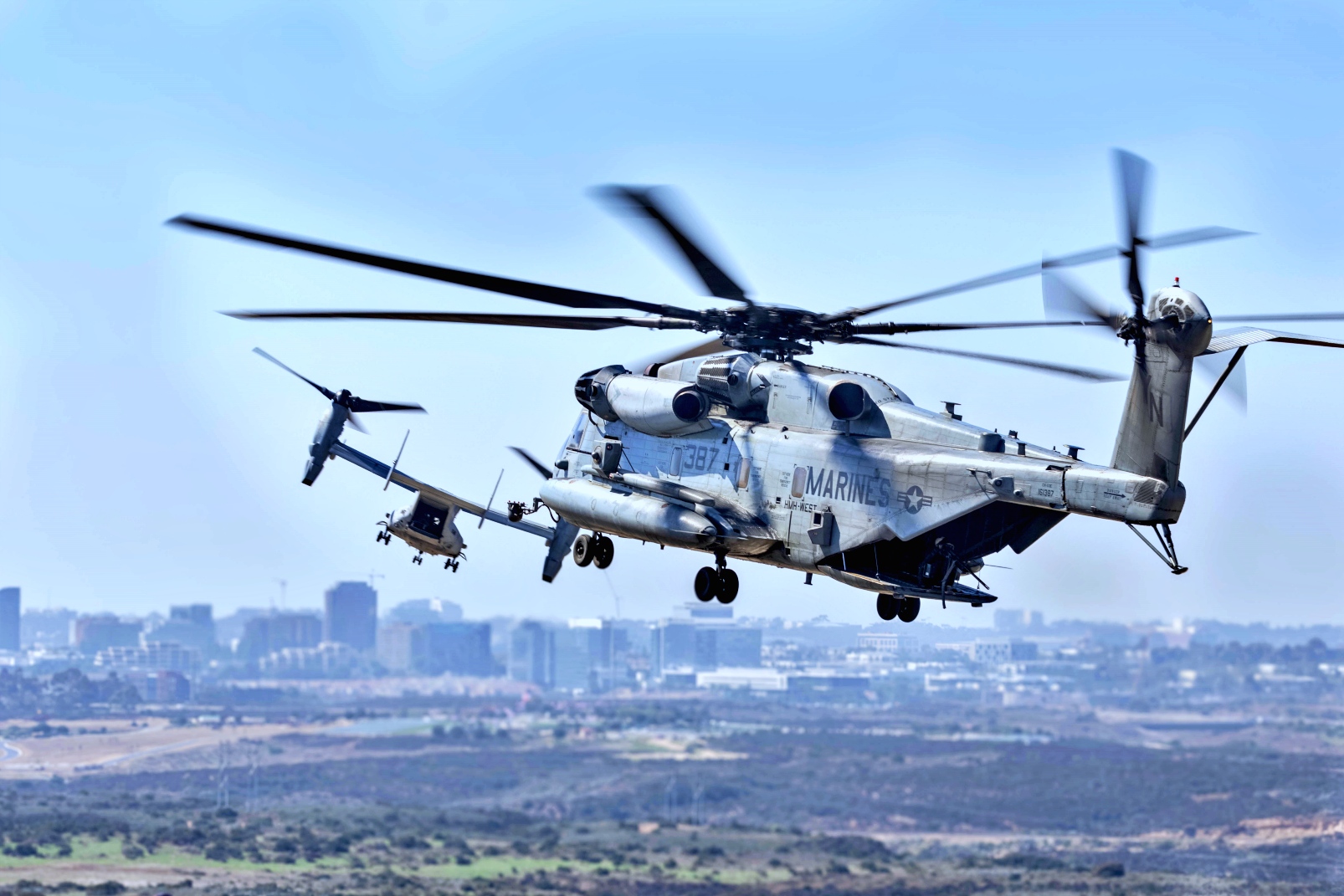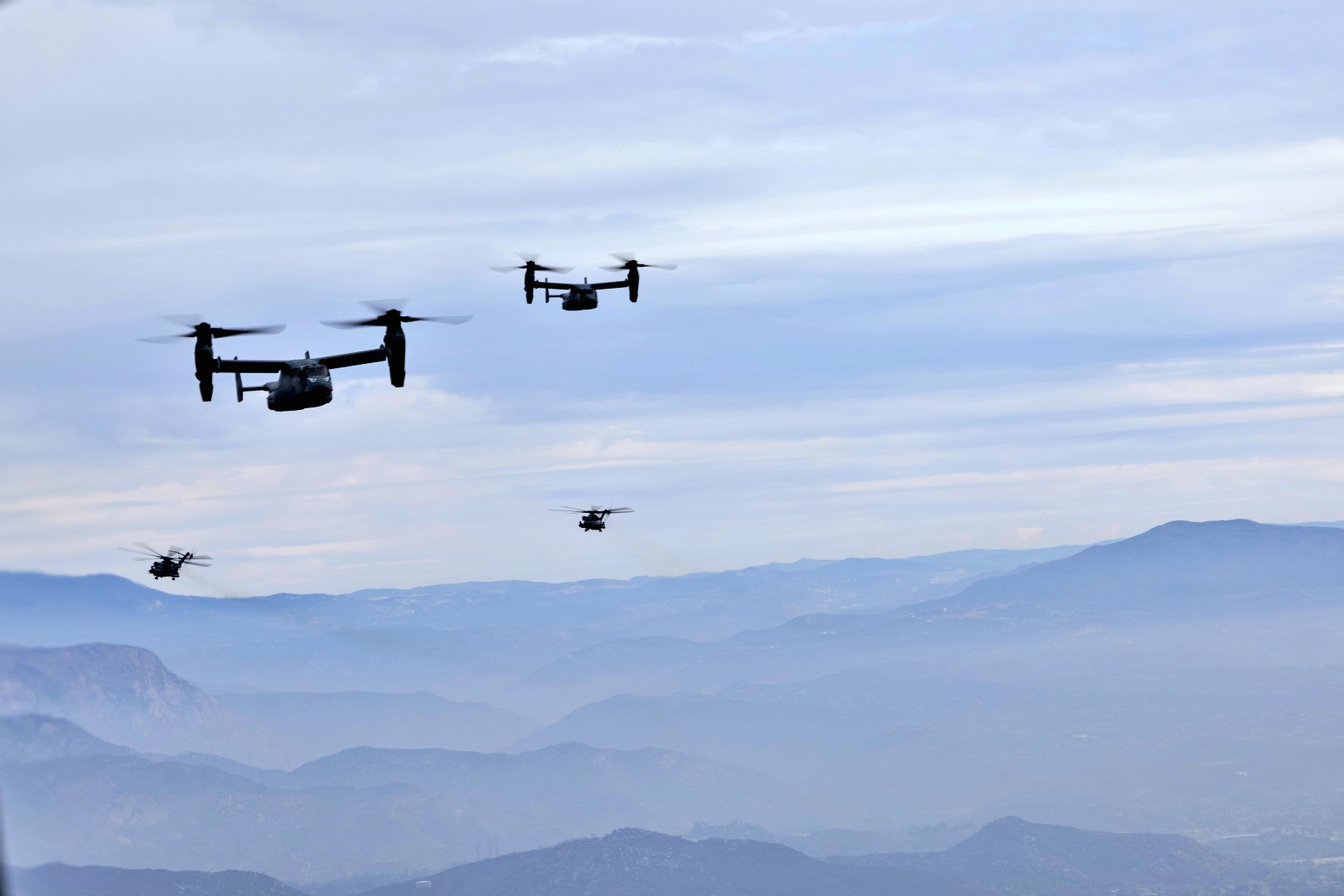 2023년 9월 22일 부터 24일까지 열린 2023 Marine Corps Air Station Miramar Airshow의 해병공지작전부대(MAGTF) 시연 중 미국 해병대 MV-22B Osprey, AH-1Z Viper, UH-1Y Venom 와 CH-53E Super Stallion 헬기가 시범을 펼치고 있다.