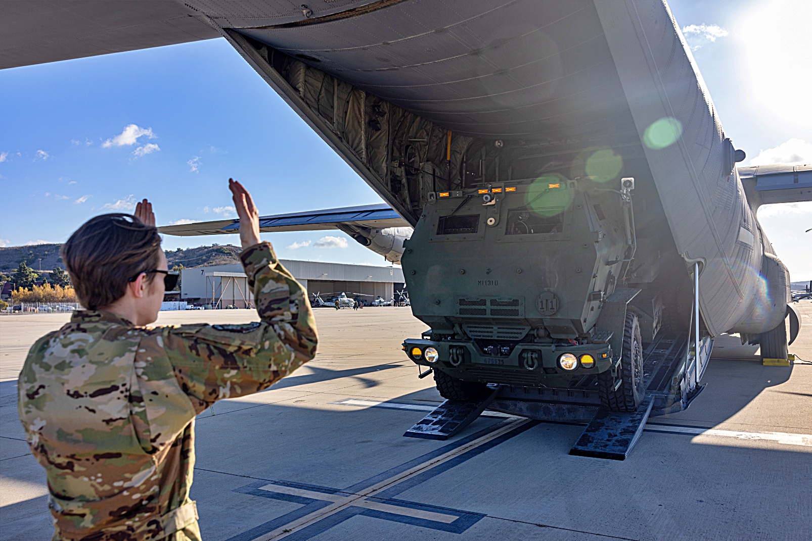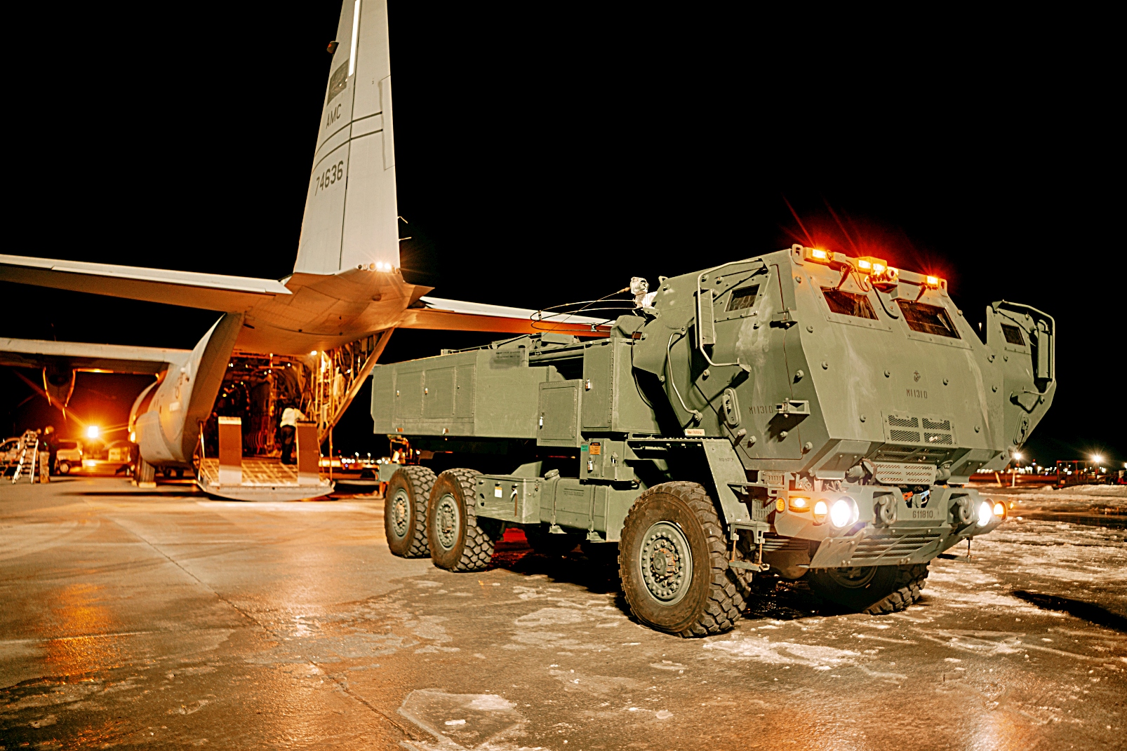 2025년 1월 17일, 알래스카 Elmendorf-Richardson 합동 기지에서 HIMARS 신속 침투 훈련(HIRAIN : HIMARS rapid infiltration training)중 제1해병사단 제11해병연대 1대대 소속 미 해병들이 제19항공기동단 소속의 공군 C-130 Hercules 수송기에 M142 고기동 포병 로켓 시스템 (High Mobility Artillery Rocket System)을 적재하고 하역했다.