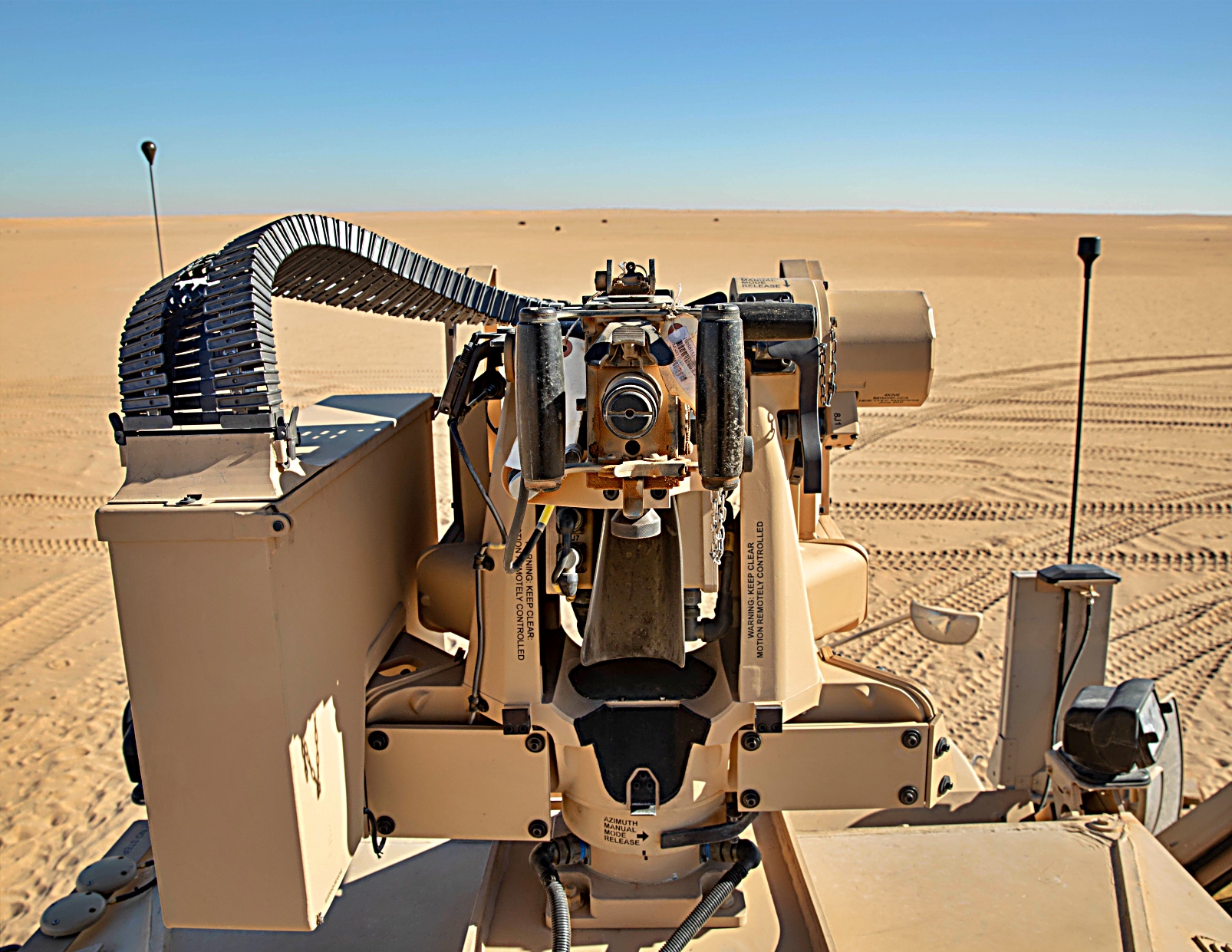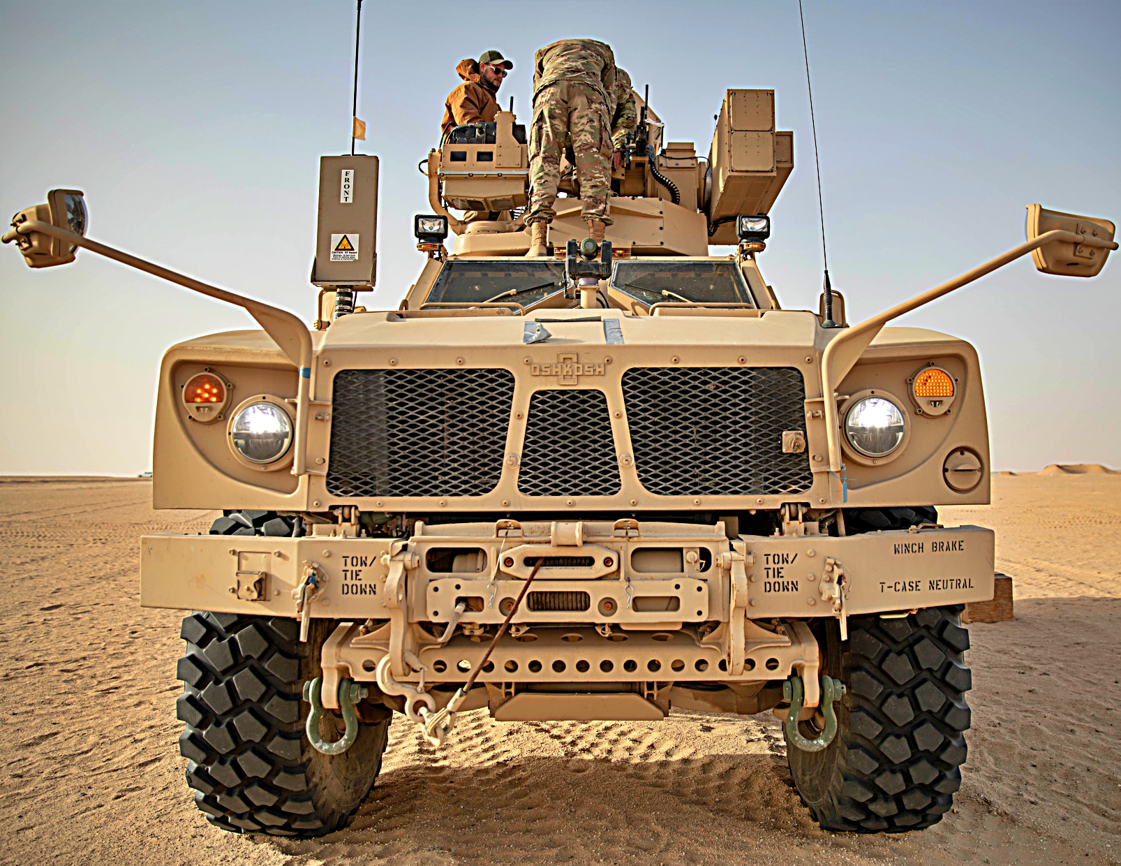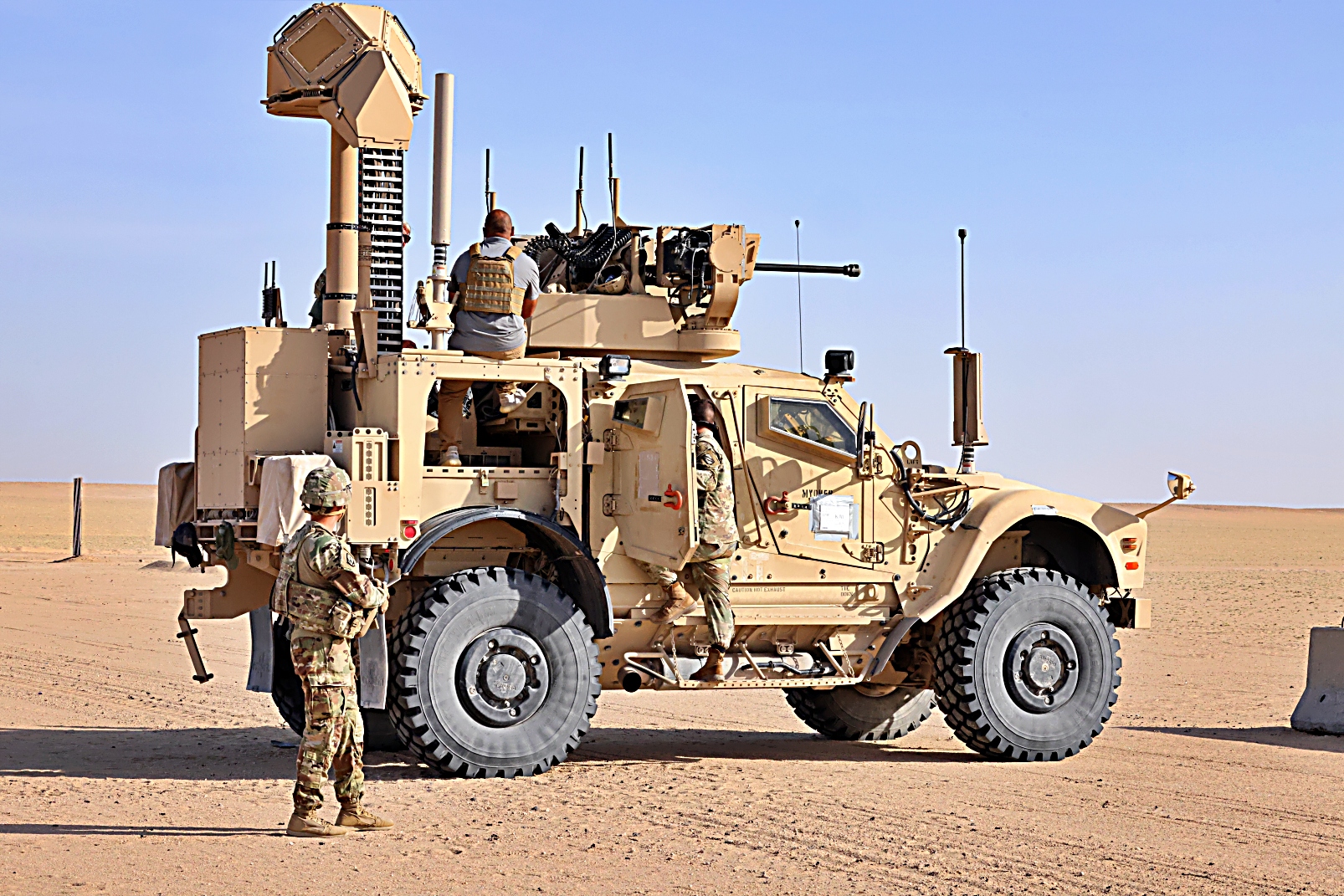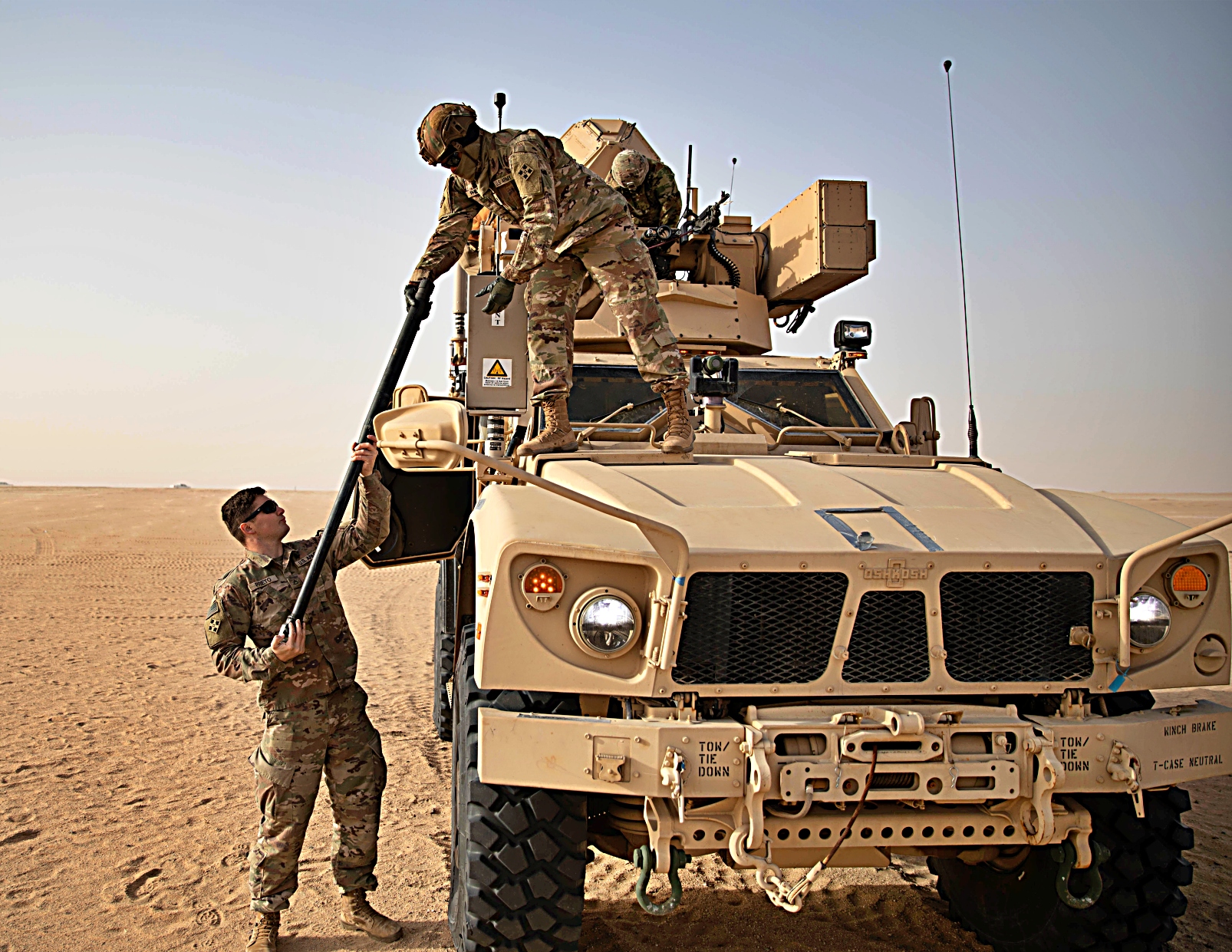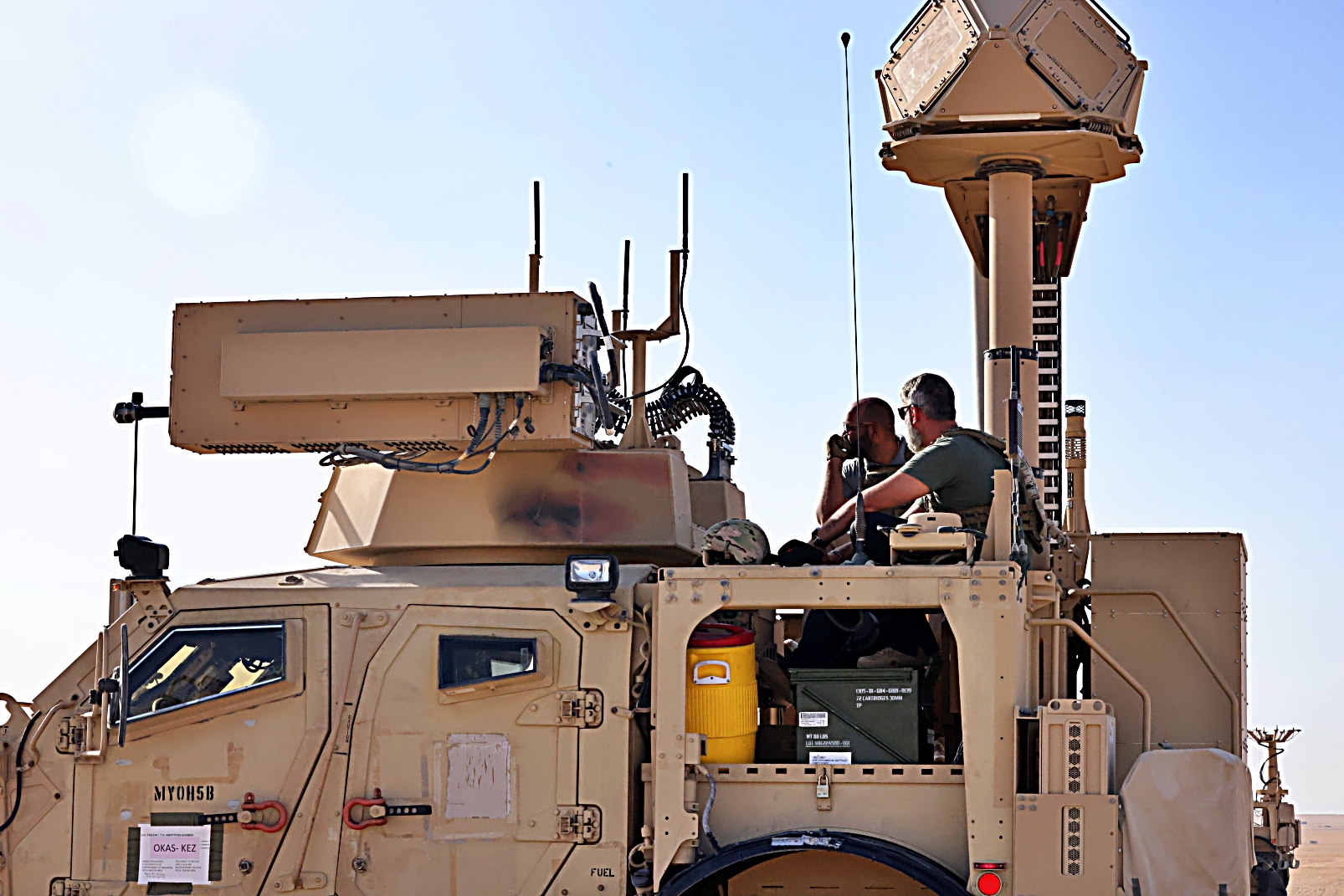 쿠웨이트, 미군 및 연합군을 위한 훈련 및 연습장을 제공하는 쿠웨이트 지역지원단(ASP-K)이 관리하는 쿠웨이트 북서부 Udairi Range에서 미 육군 병사들이 2023년 7월 30일 저고도 저속 소형 무인 항공기 통합 격퇴 시스템(M-LIDS)과 30mm 대드론 포탑을 평가하고 있다. 지뢰 및 매복 공격에 강한 전지형 차량 두 대에 탑재되는 M-LIDS는 미 육군이 개발한 이동형 무인 항공기 격퇴 시스템이다.