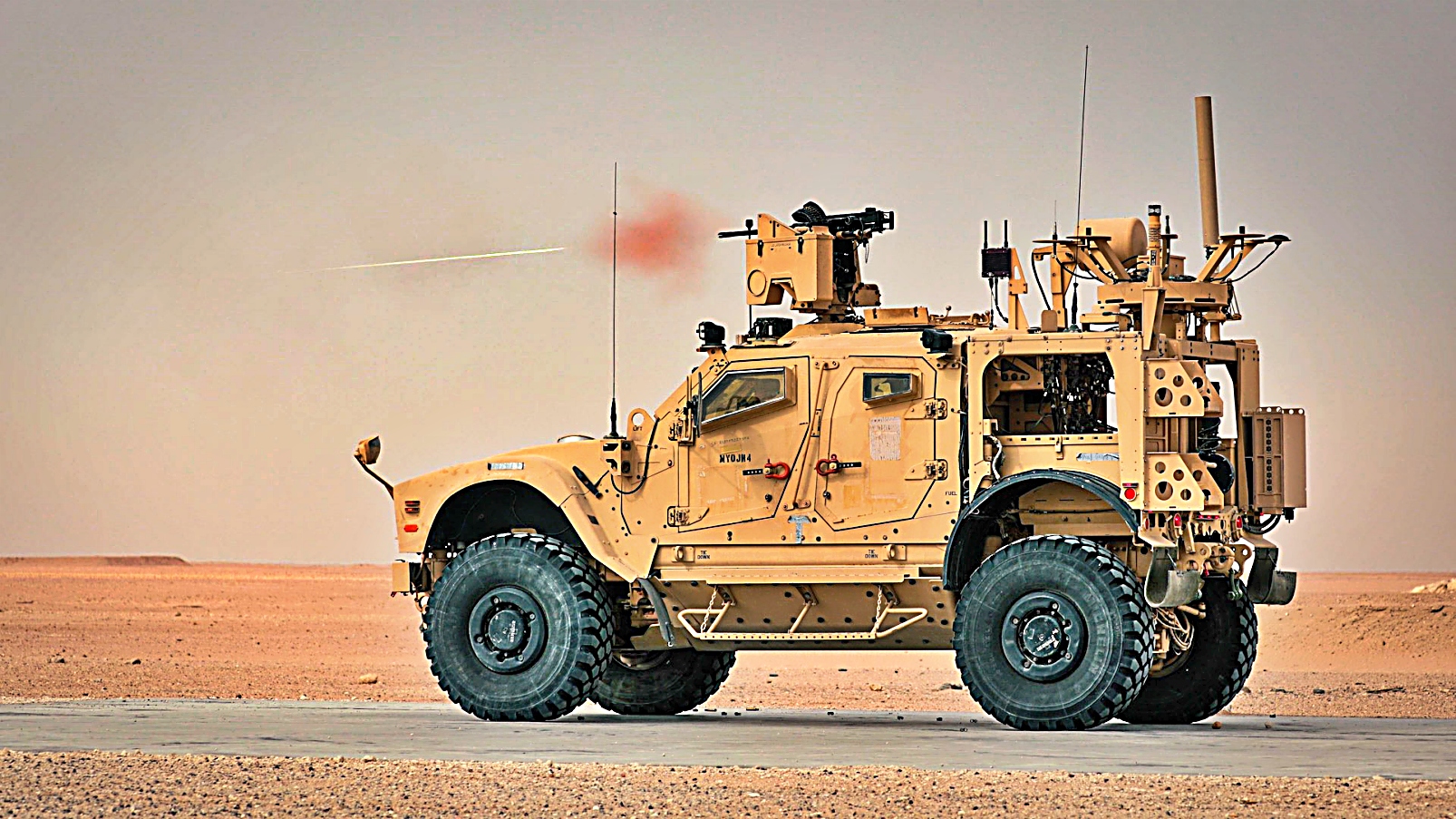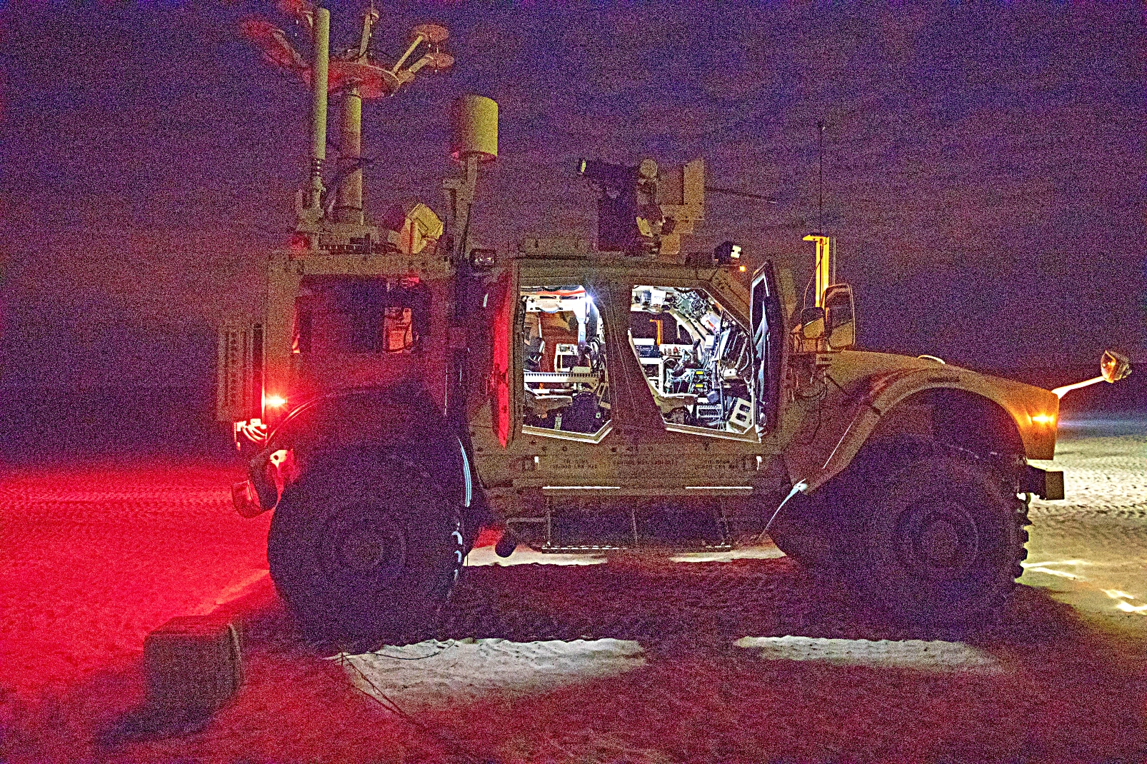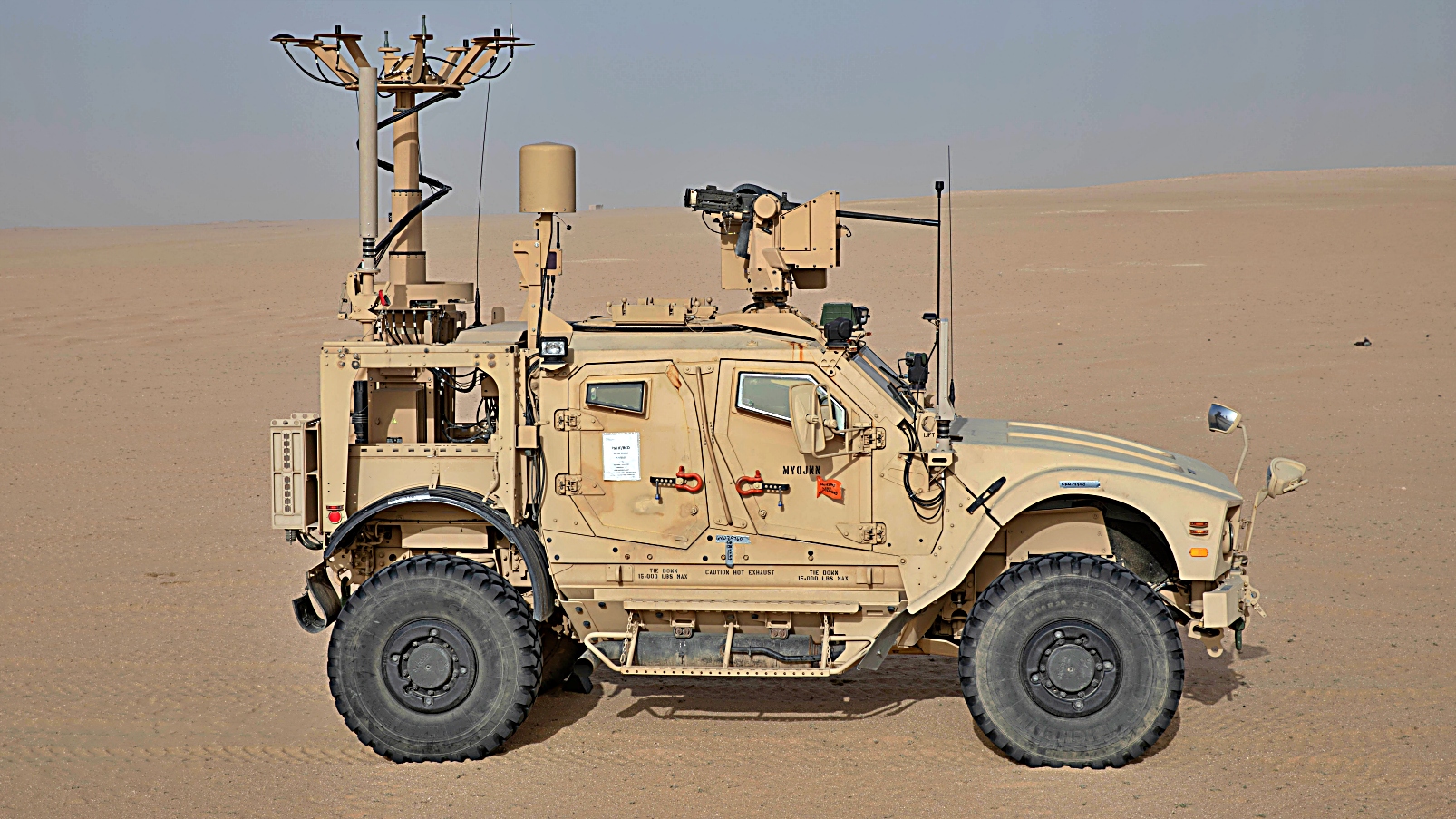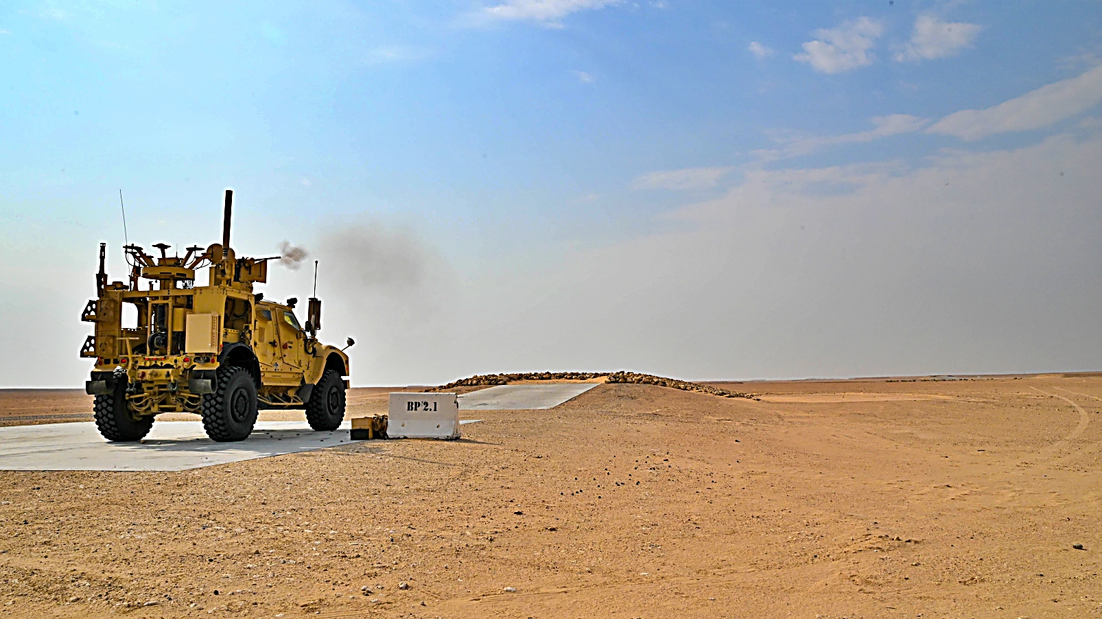2023년 7월 30일 지뢰 및 매복 공격에 강한 전지형 차량(MRAP)에 탑재된 전자기전 시스템인 ( electromagnetic warfare system) M-LIDS가 쿠웨이트 북서부의 Udairi Range에서 시험 중이다.