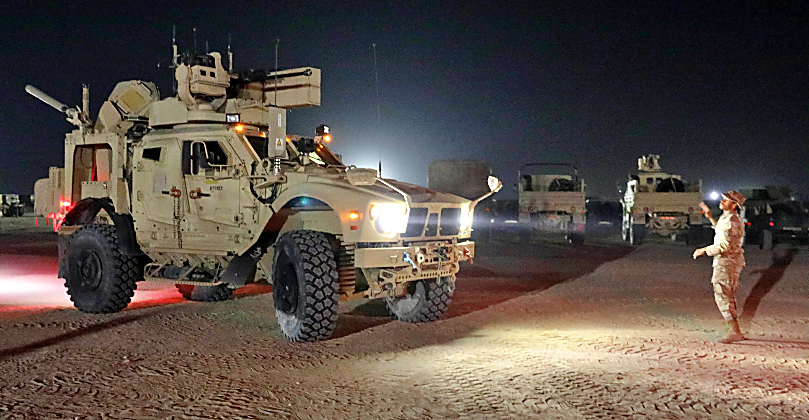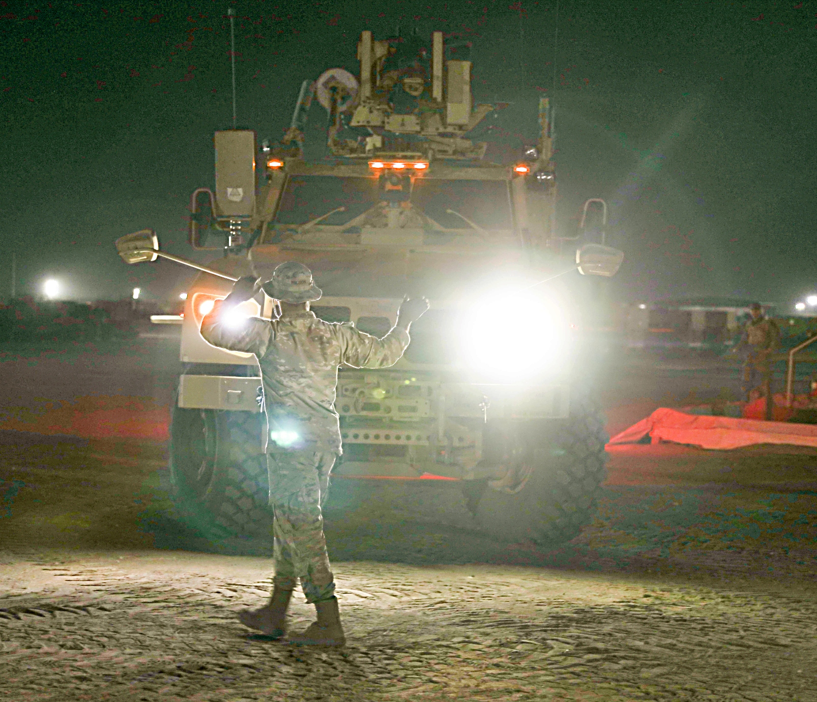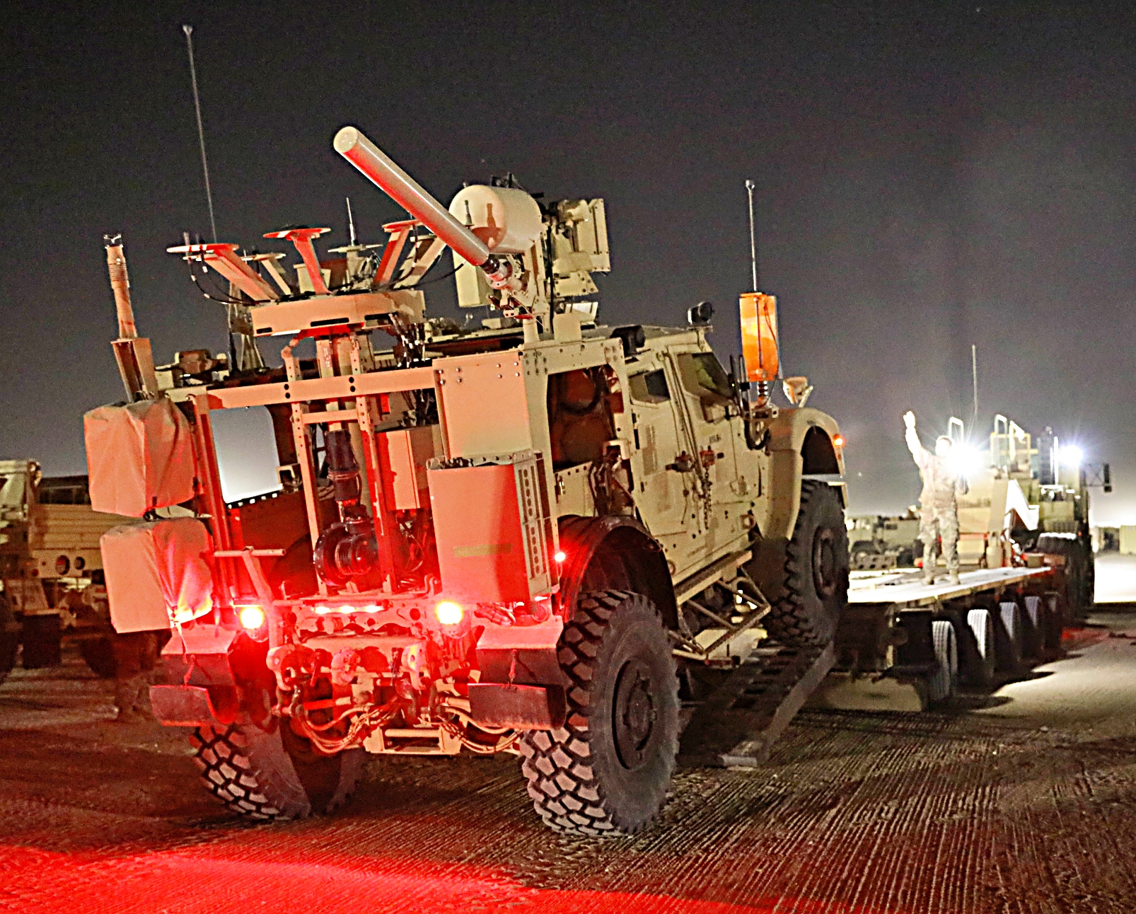 2023년 10월 27일 Task Force Reaper 소속 병사들이 중부사령부 작전지역인 쿠웨이트 Camp Buehring에서 제142사단 군수지원대대 소속 병사들과 함께 이동식 저고도, 저속, 소형 무인 항공기 통합 방어 시스템(MLIDS)을 중장비 수송 트럭에 적재하기 전 위치로 유도하고 있다. Task Force Reaper는 Operation Spartan Shield 지원을 위해 배치됐다.