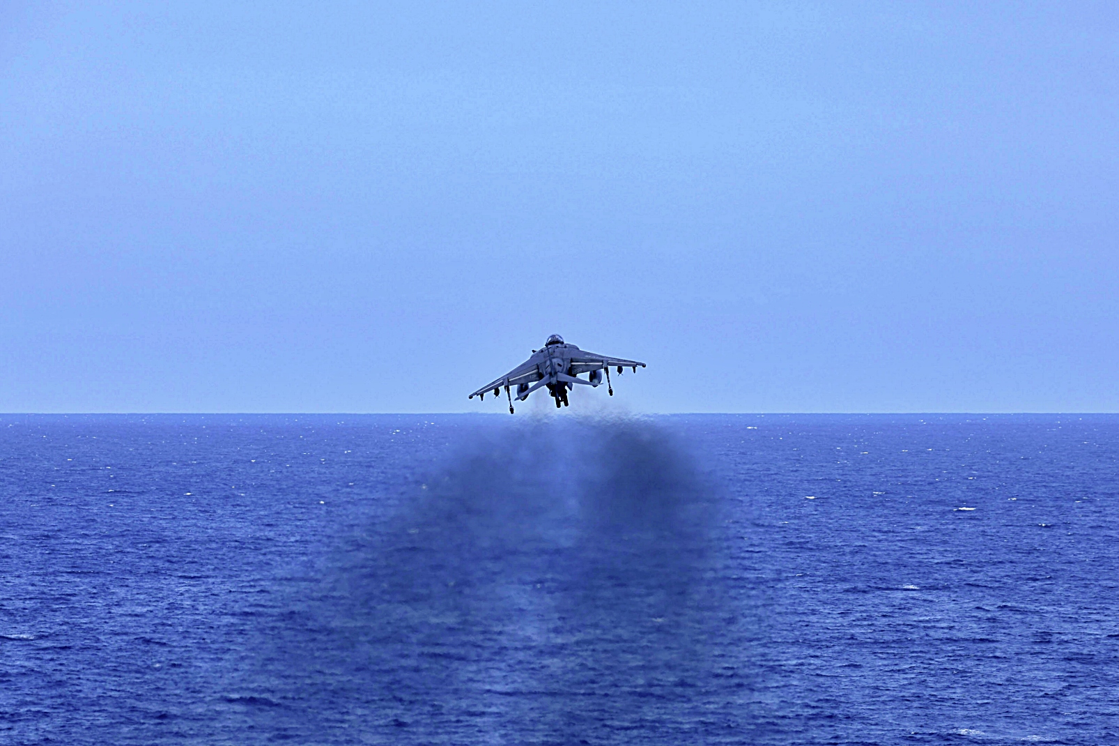 2025년 5월 20일 미 해군 강습상륙함 USS Iwo Jima (LHD 7)함에 배속된 해병대원들이 “Bulldogs”로 알려진 VMA-223 해병 공격 비행대대에 소속된 AV-8B Harrier II 공격기의 비행작전을 지원하고 있다.