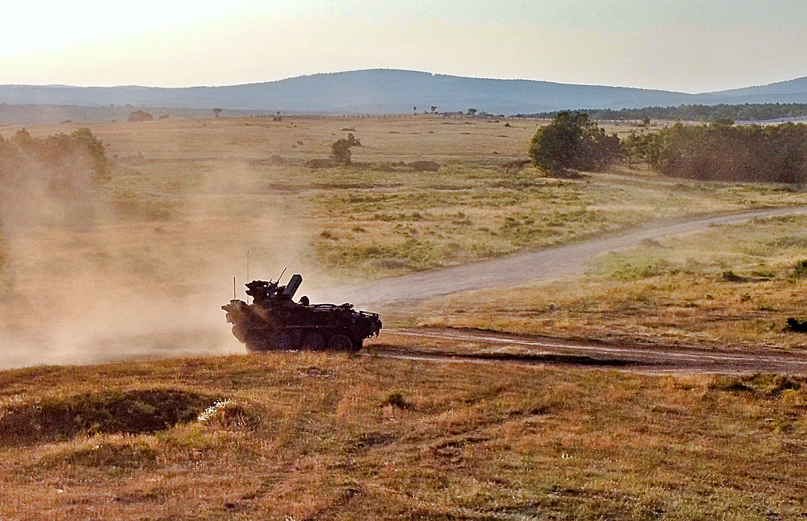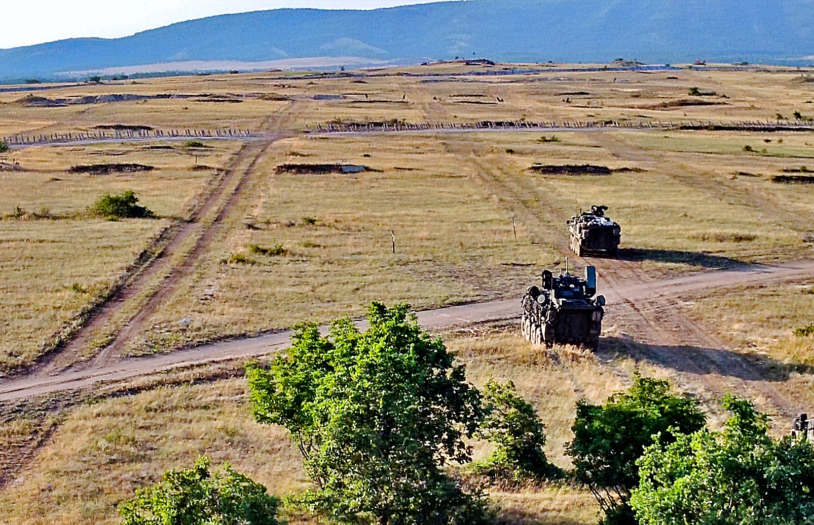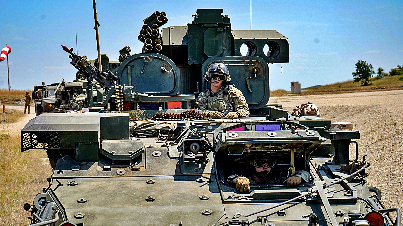 2025년 6월 19일 미국 육군 제52방공포병여단 제4방공포병연대 제5대대 Bravo 포대 병사들이 헝가리 Osku 근처의 헝가리 사격장에서 방공 포병 Stryker A1 변형 차량인 Stryker SGT Stout 대공장갑차를 운용하며 목표물을 공격하고 공중 공간을 확보하고 있다. 동시에 제2기병연대 제4대대 소속 기동 부대가 지상 목표물을 공격하고 있다.