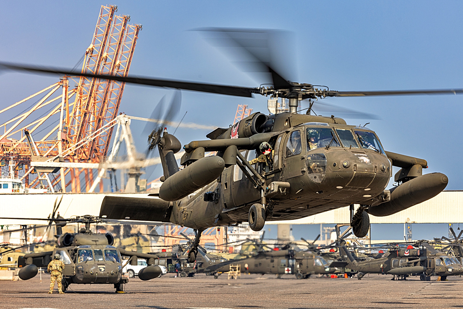 미 육군 101 공중 강습 항공여단 예하 101 전투항공여단의 AH-64E Apache 공격헬기, UH-60M Black Hawk 다용도 수송헬기 및 CH-47F Chinook 중수송헬기들이 지난 1월 22일 쿠웨이트 Port of Shuaiba 항에 하역된 후 작전지를 향해 이륙하고 있다.