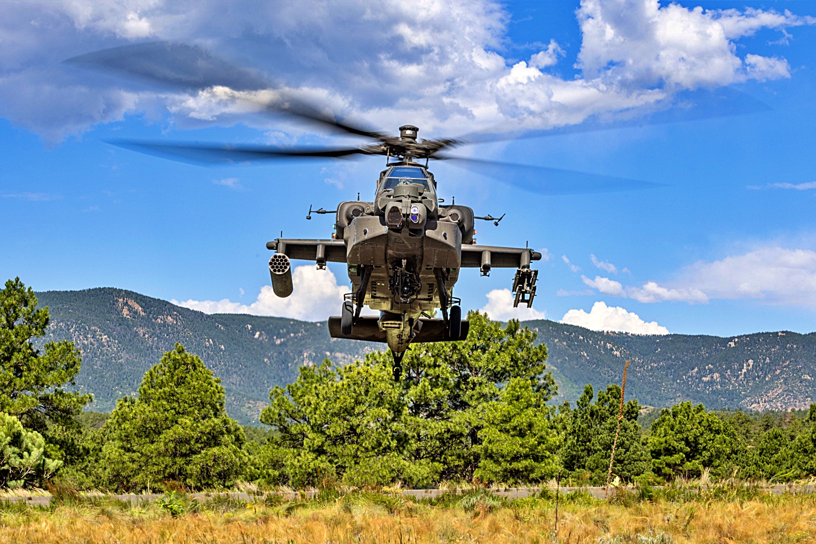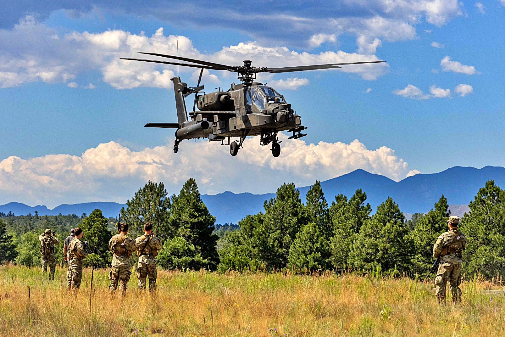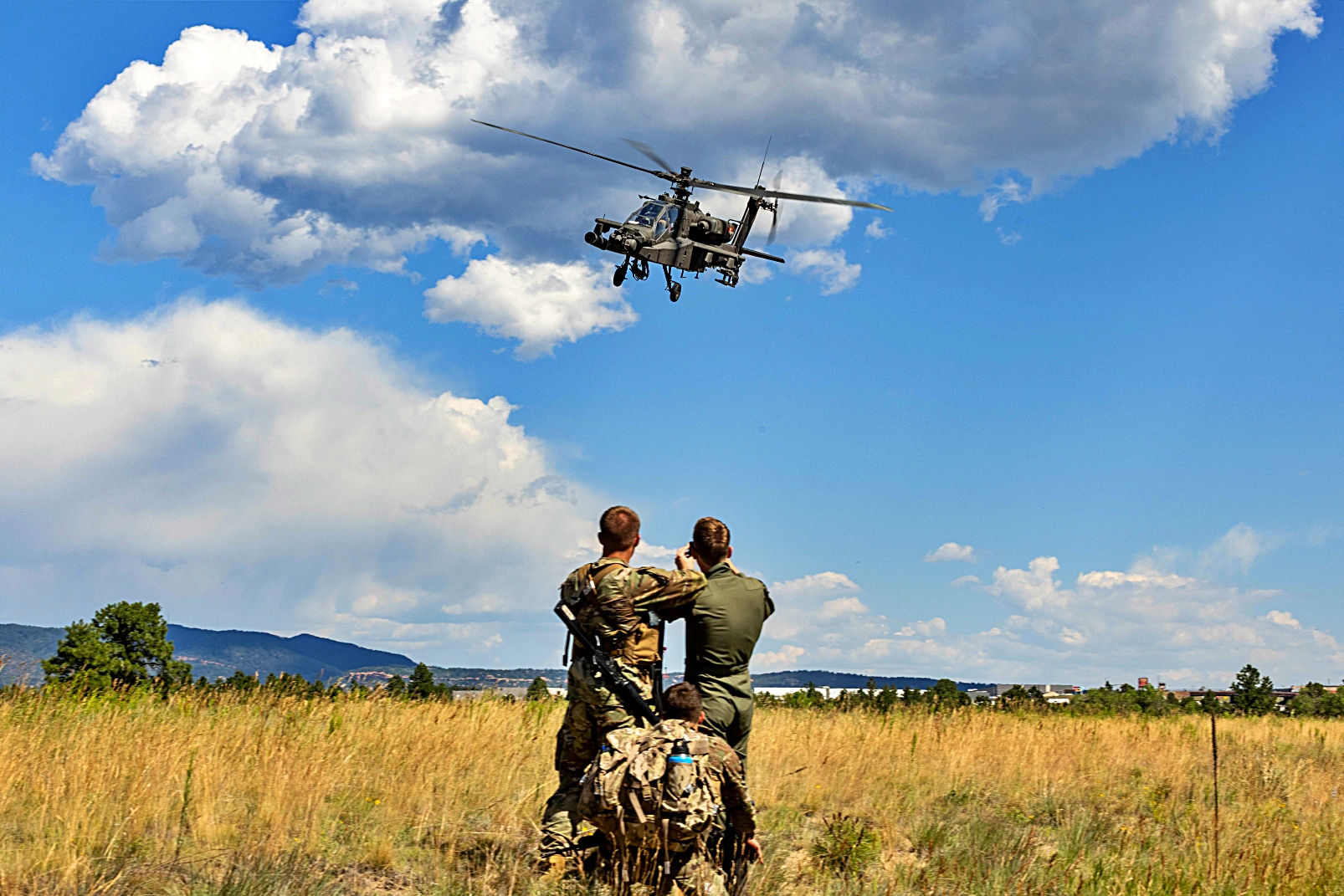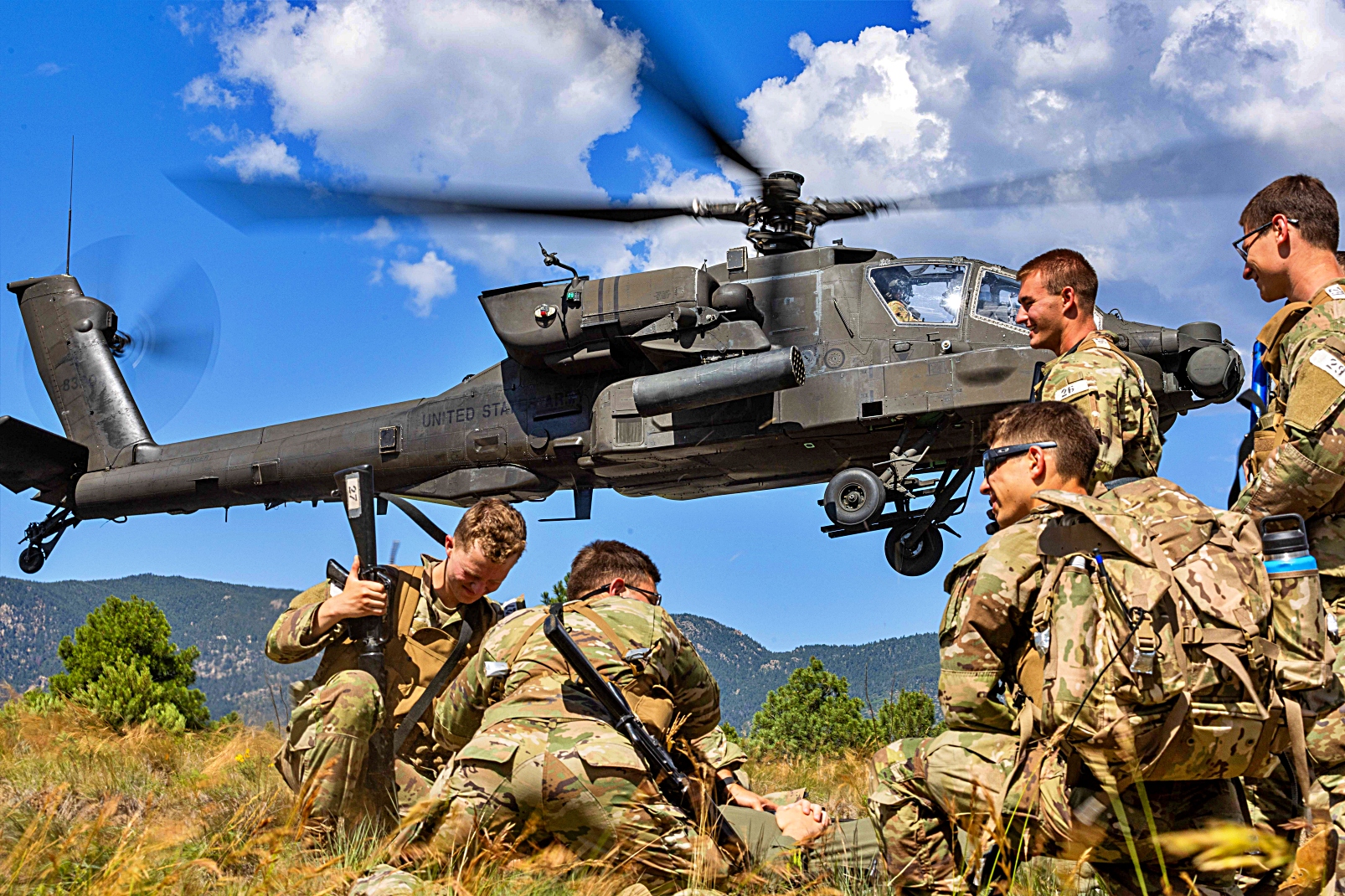 2025년 7월 8일 콜로라도주 Colorado Springs에 위치한 사관학교의 보조 비행장에서 진행된 훈련 복구 임무 중 미국 육군 아파치 헬리콥터가 미국 공군사관학교와 AFROTC 후보생들을 지원하고 있다. 이번 훈련에는 여름 Azimuth 우주 프로그램과 특수전 작전 과정(SWOC) 참가자들이 참여해 공군사관학교와 ROTC 후보생들에게 우주 작전과 특수전 관련 다주간의 교육을 제공했다.