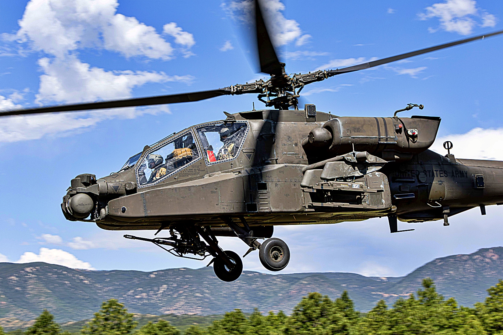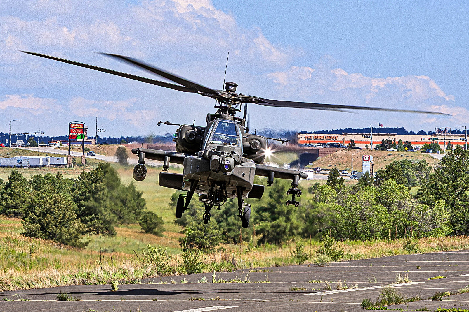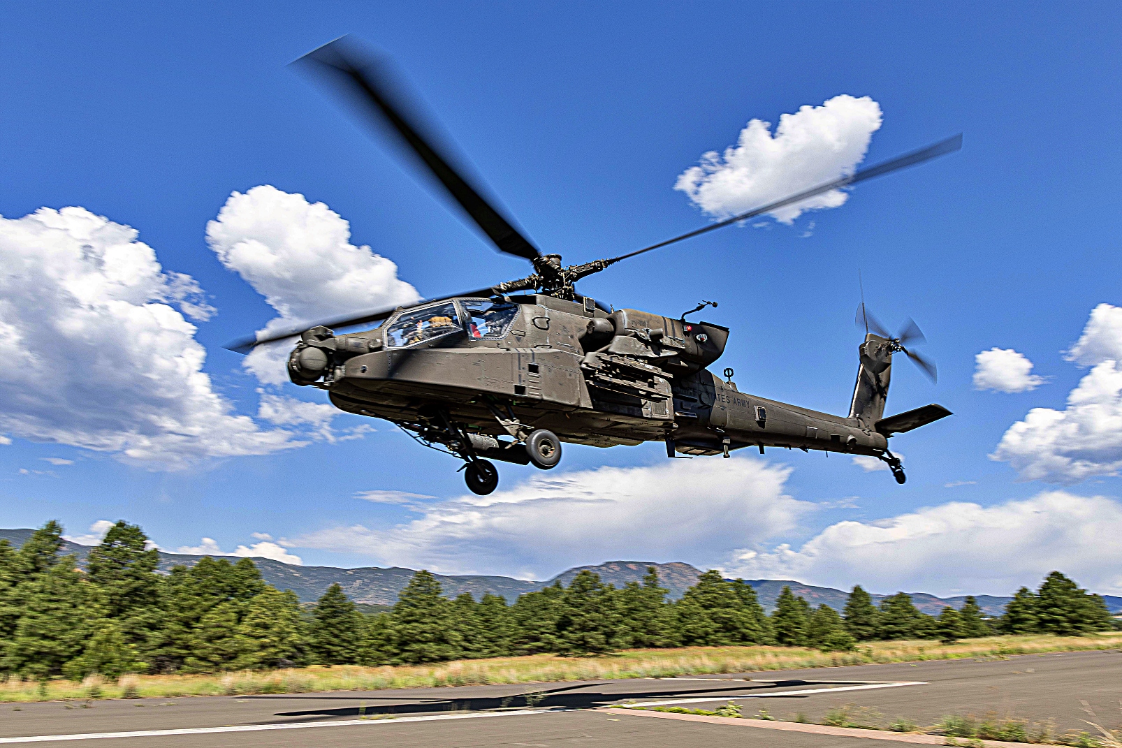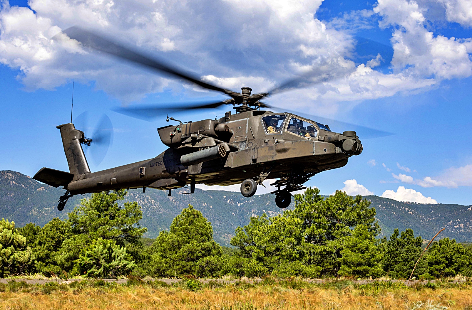 2025년 7월 8일 콜로라도주 Colorado Springs에 위치한 사관학교의 보조 비행장에서 진행된 훈련 복구 임무 중 미국 육군 아파치 헬리콥터가 미국 공군사관학교와 AFROTC 후보생들을 지원하고 있다. 이번 훈련에는 여름 Azimuth 우주 프로그램과 특수전 작전 과정(SWOC) 참가자들이 참여해 공군사관학교와 ROTC 후보생들에게 우주 작전과 특수전 관련 다주간의 교육을 제공했다.