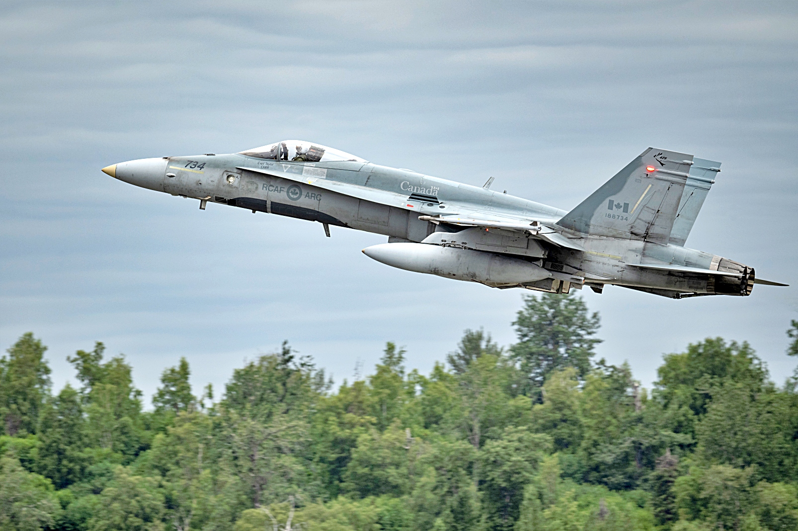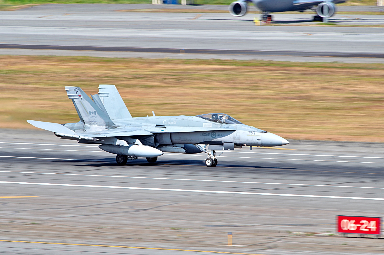 북미 항공우주 방어사령부(NORAD) 소속 캐나다공군 CF-18 Hornet 전투기가 2025년 7월 9일 알래스카 Elmendorf-Richardson 합동기지에서 Adak 상공으로 훈련 임무를 위해 이륙하고 있다. Adak 상공에 전개한 CF-18은 미 공군 F-16 Fighting Falcon 전투기와 훈련 임무를 수행 중인 북미 항공우주 방어사령부(NORAD)의 KC-135 Stratotanker를 추적하며 임무 비행을 실시했다.