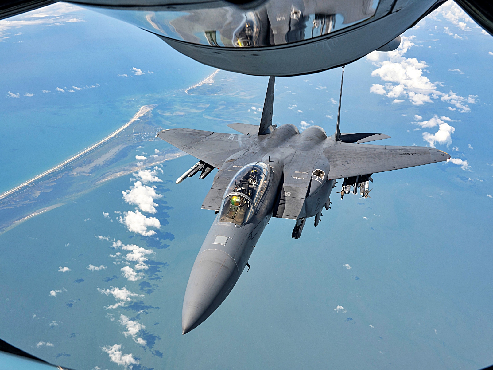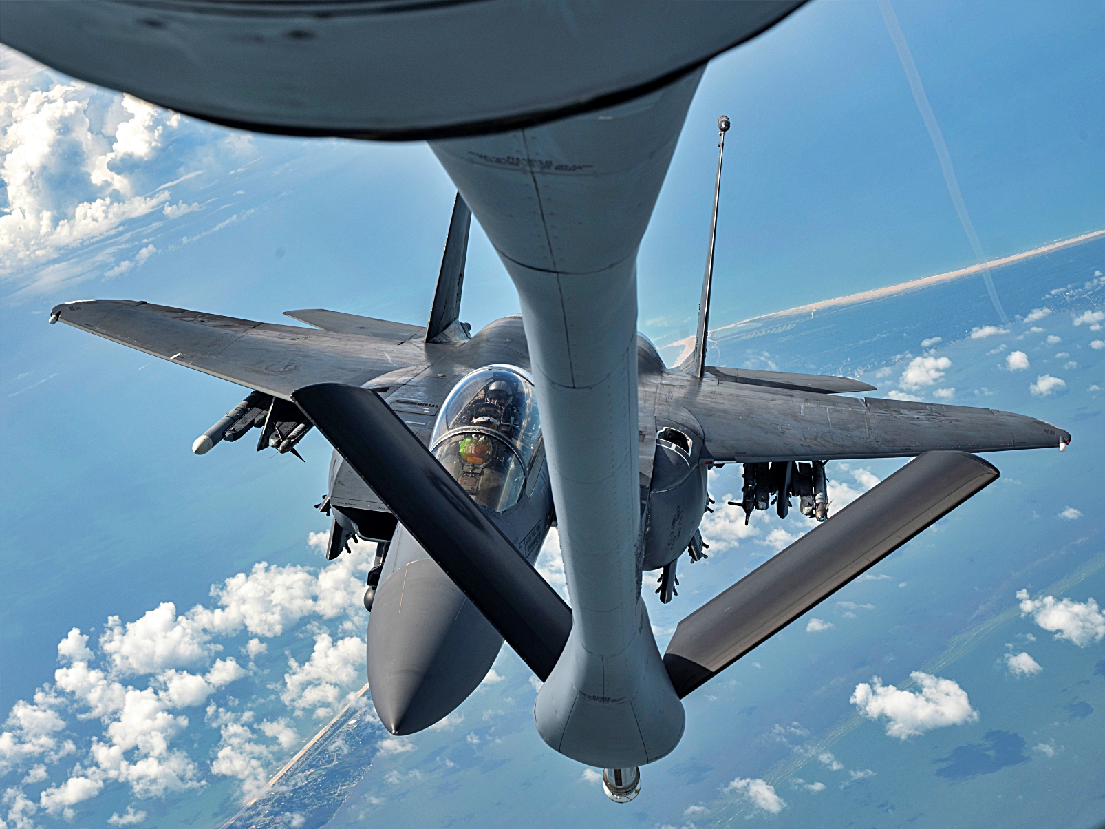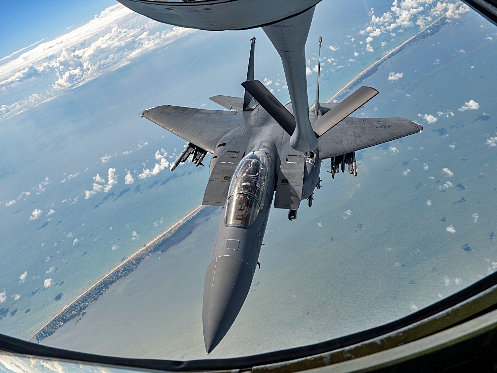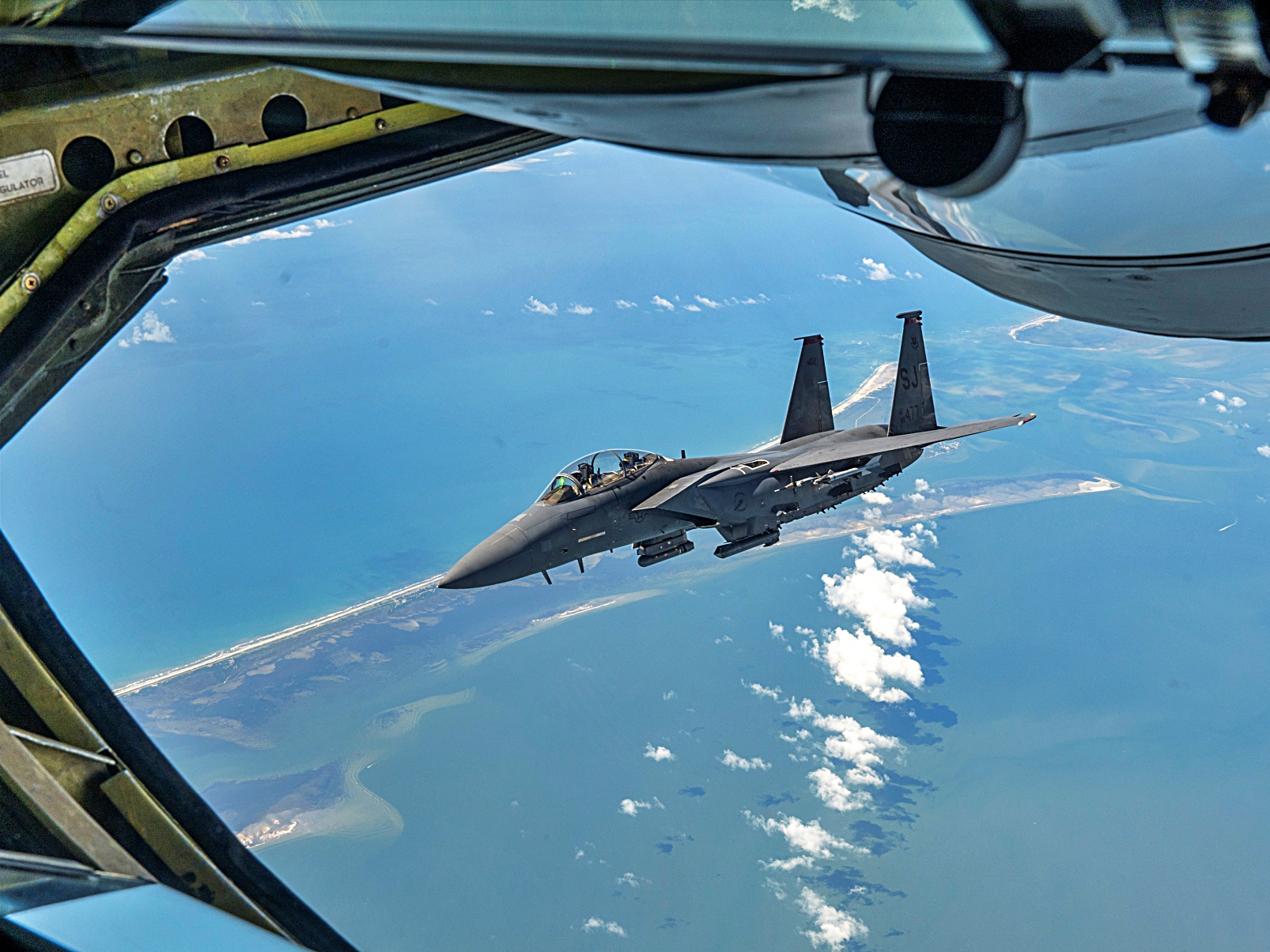 메릴랜드주 Andrews합동기지에 배치되어 있는 미 예비공군 제459공중급유비행단 756공중급유비행대 소속 KC-135R Stratotanker가 2025년 7월 9일 미국 남동부 상공에서 노스캐롤라이나주 Seymour Johnson 공군기지에 배치되어 있는 제4전투비행단 소속 F-15E Strike Eagle에 공중급유를 실시하고 있다. KC-135는 미국 공군의 핵심 공중 급유 플랫폼으로, 공군, 해군, 해병대 및 동맹국들의 전 세계적 작전 범위를 확장시켜준다.