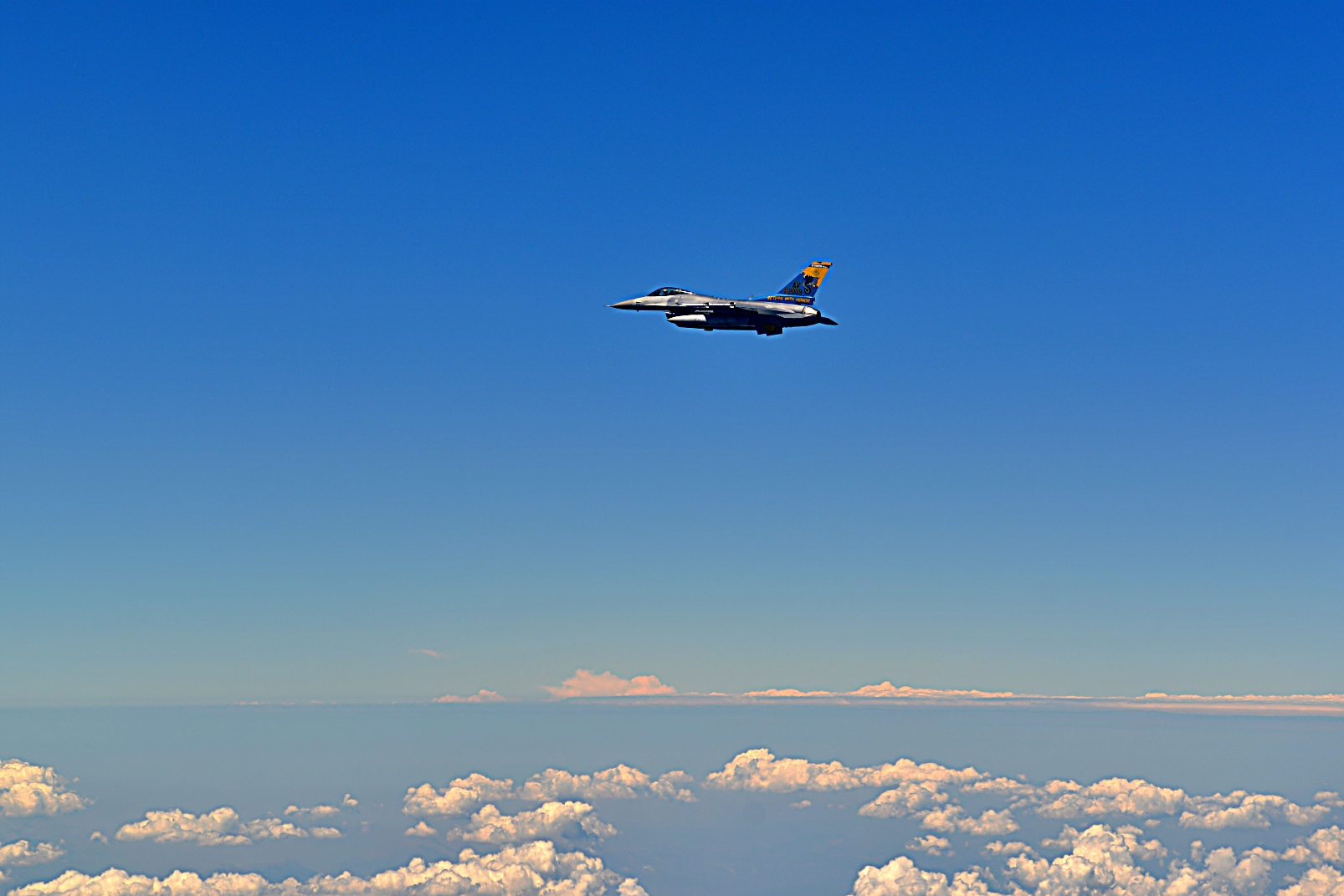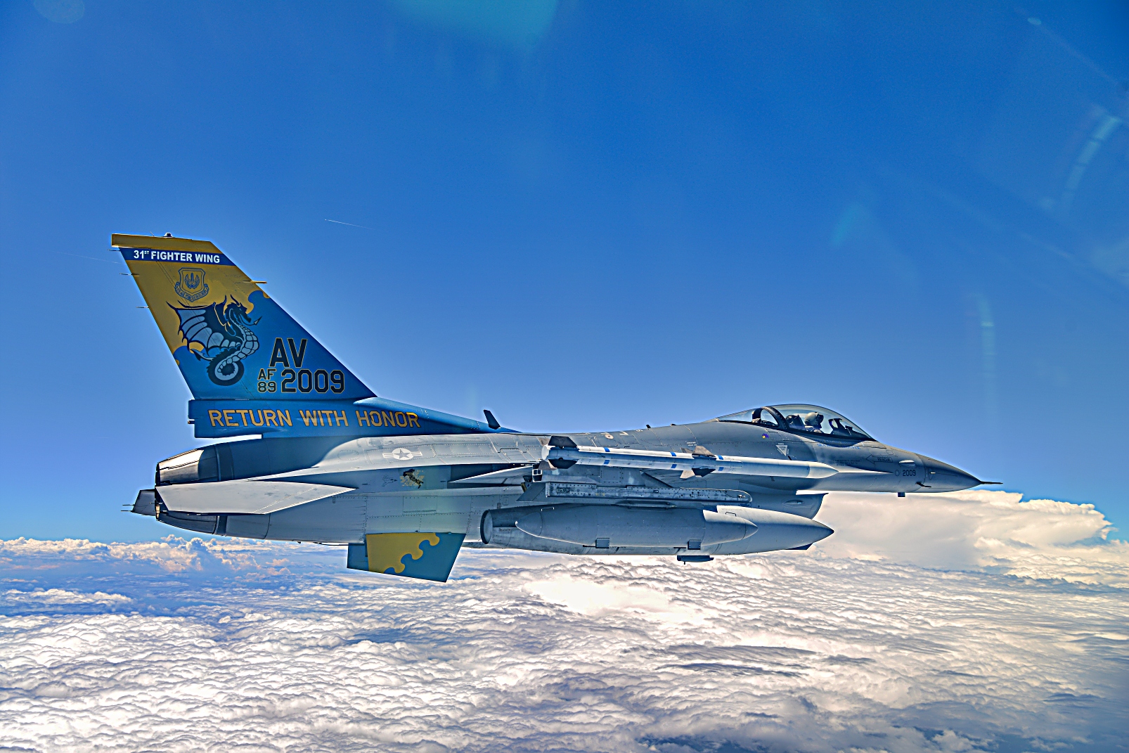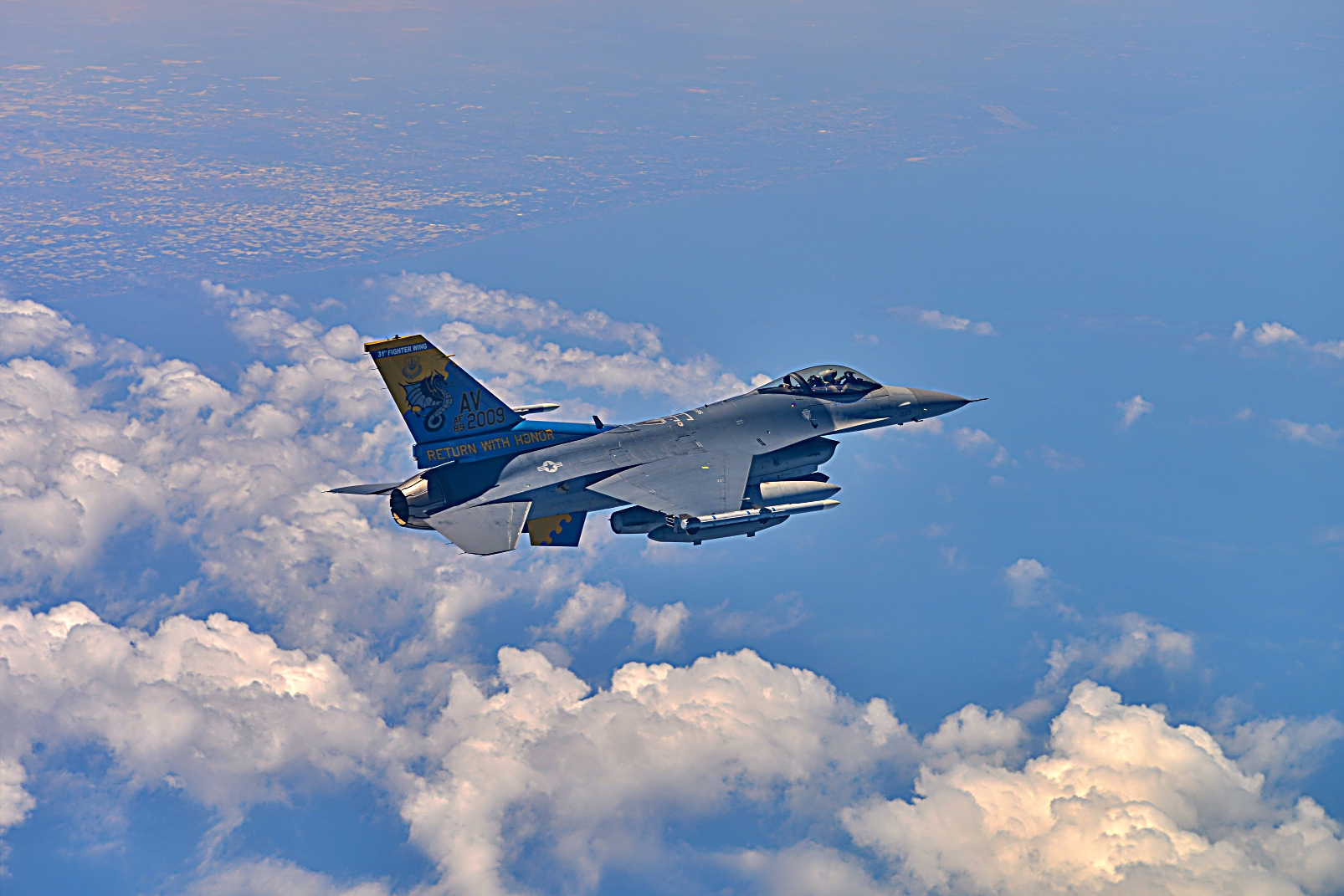 이탈리아 Aviano 공군기지에 배치되어 있는 미국 공군 31 작전군 사령관 Joseph Miranda 대령이 2025년 7월 18일 이탈리아 상공에서 510 전투일반비행대에 배속된 F-16 Fighting Falcon을 조종하고 있다. 31 작전군은 F-16 전투기를 운용하는 510 및 555 전투 비행대대, HH-60W를 운용하는 56 구조 비행대대와 Guardian Angel로 구성된 57 구조 비행대대, 606 공중 통제 비행대대 및 31 작전 지원 비행대대를 통해 전 세계 공중 작전을 수행하고 지원하는 임무를 맡아 전투 준비 태세를 유지한다.
