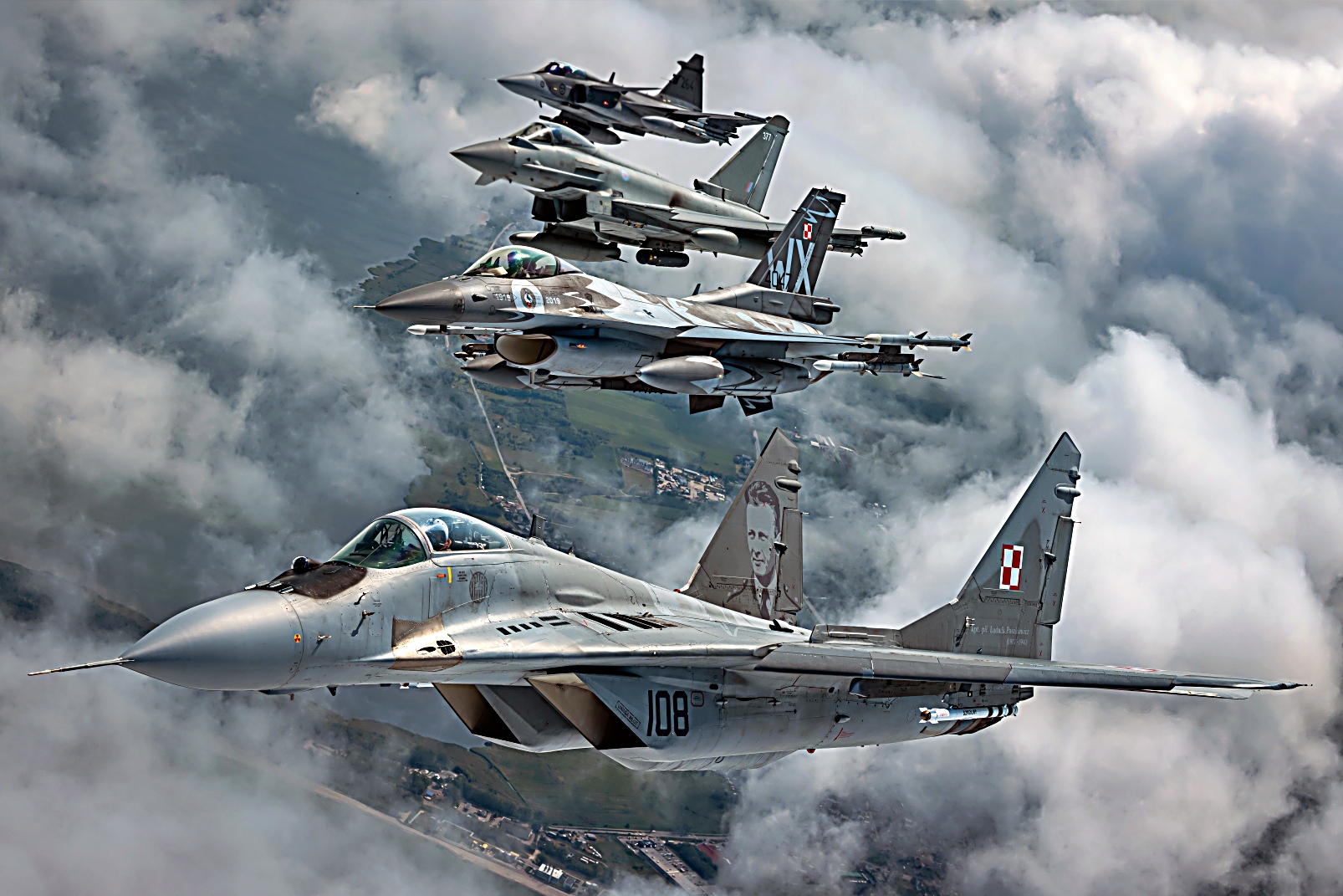 폴란드의 MIG-29, 폴란드의 F-16, 영국 공군의 타이푼, 그리고 스웨덴의 그리펜이 2025년 6월 11일 공중 전투 임무 중이다.