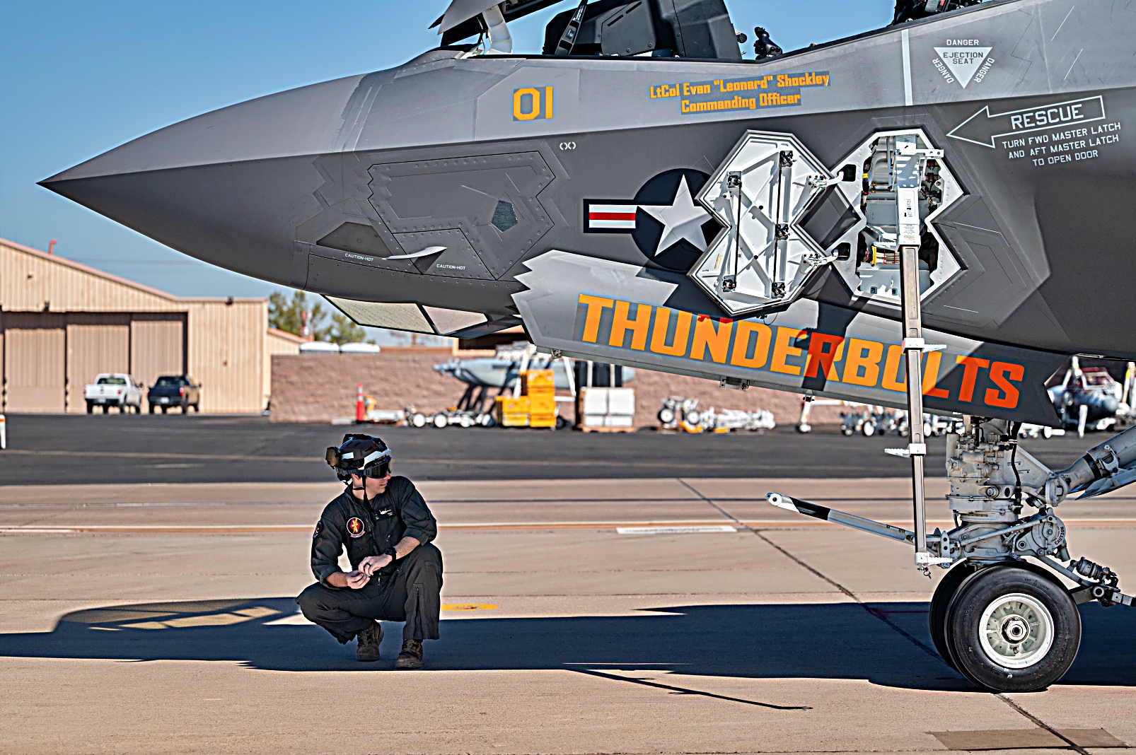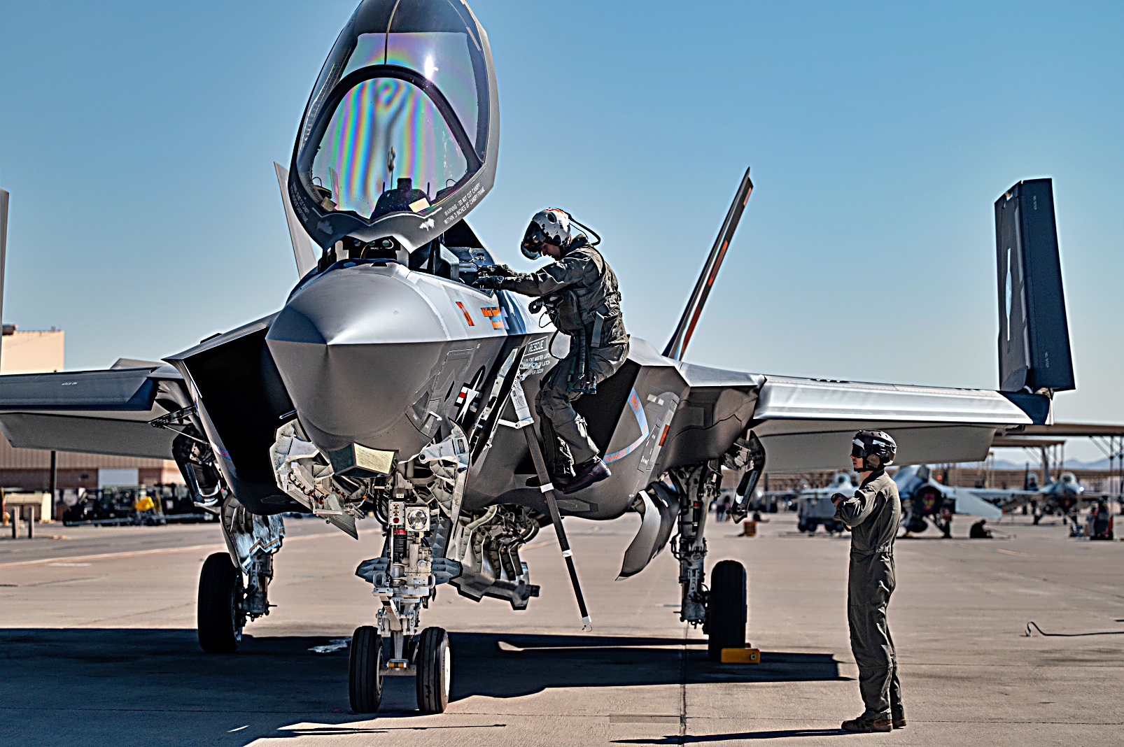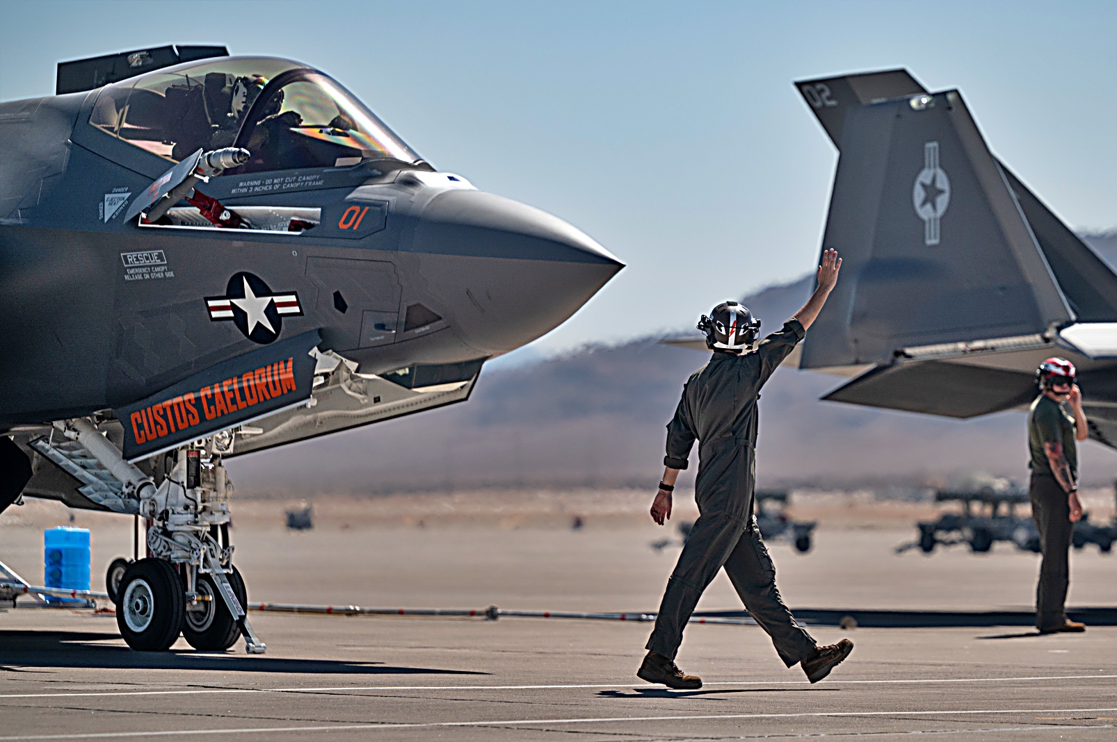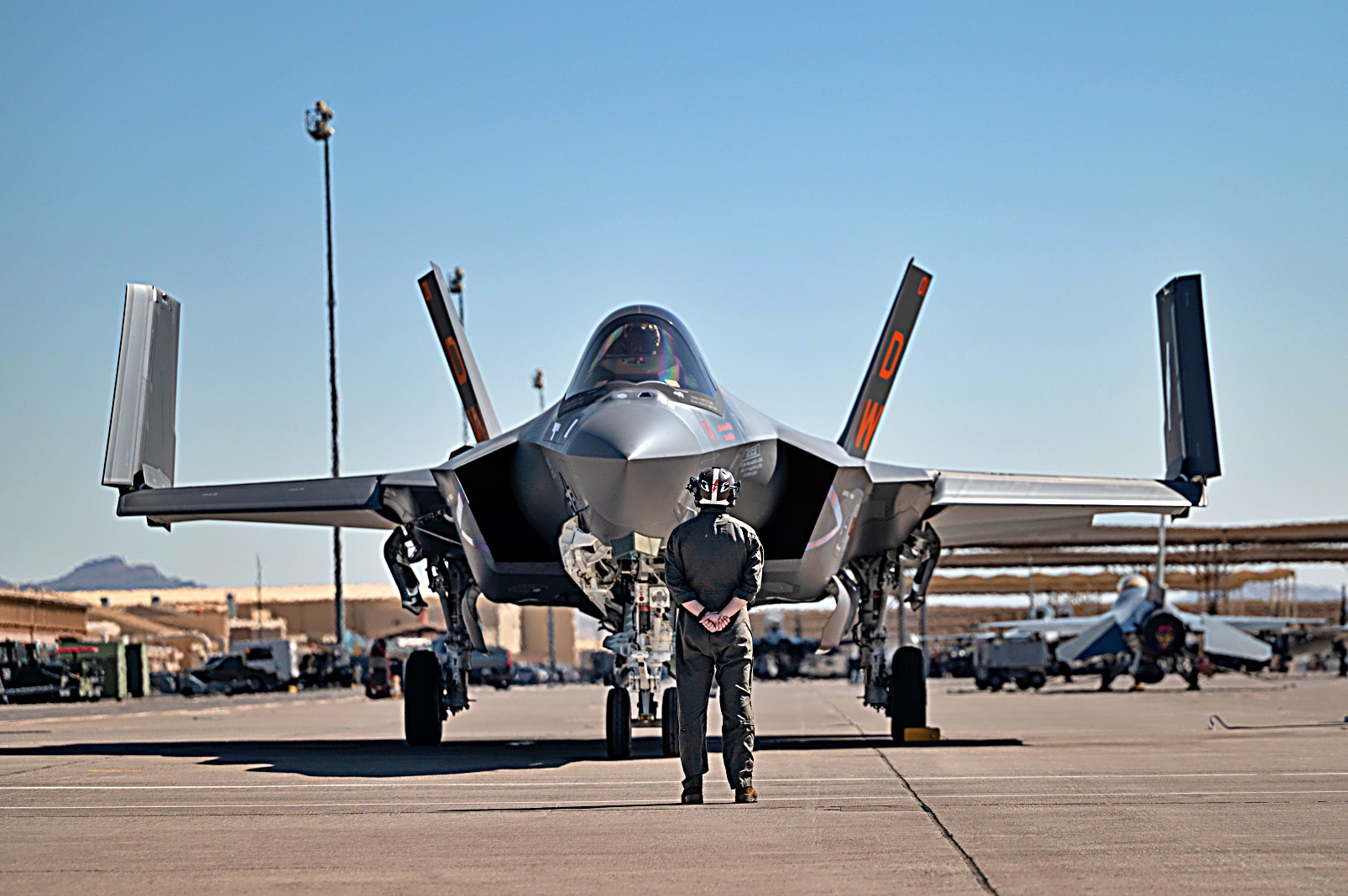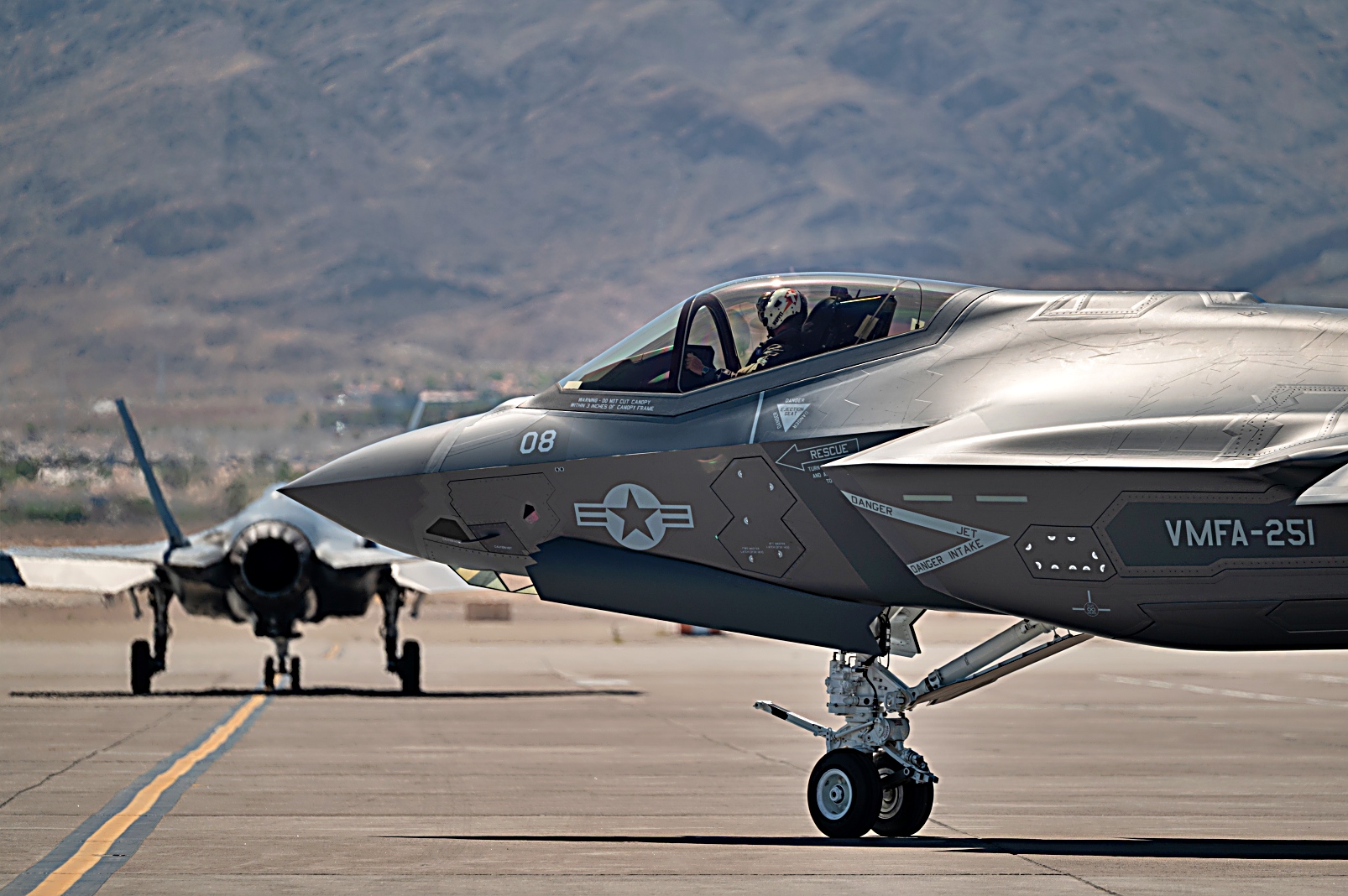 노스캐롤라이나주 Cherry Point 해병대 항공기지에 주둔하는 미국 해병대 2 해병항공단 VMFA-251 해병 전투 공격 비행대대 소속 F-35C Lightning II 공격기가 2025년 7월 22일 네바다주 넬리스 공군기지에서 진행된 Red Flag-Nellis 25-3 훈련에서 작전 지원 을 위해 출격하고 있다.