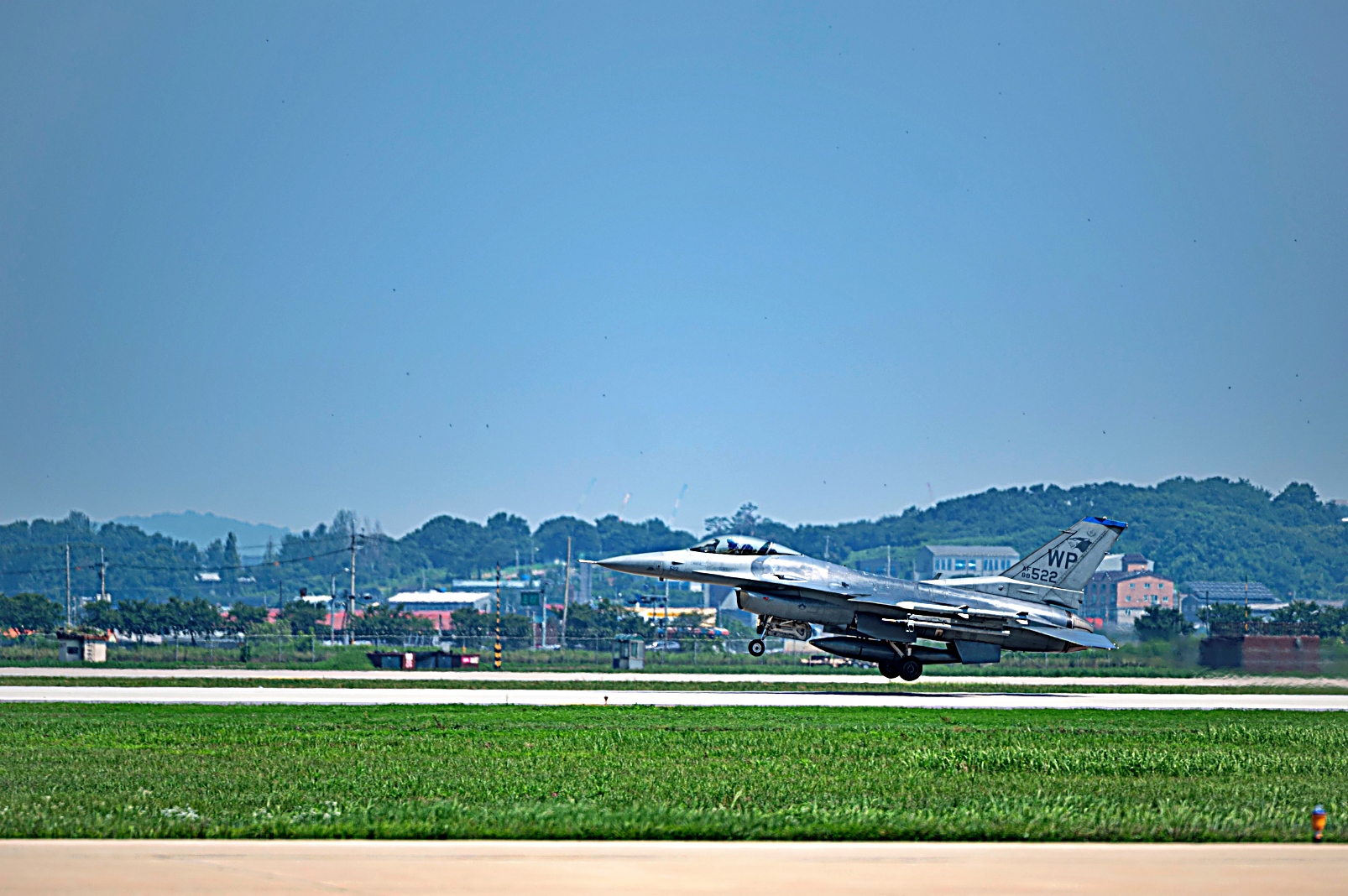 2025년 7월 28일, 대한민국 오산 공군기지에서 미국 공군 F-16 Fighting Falcon 전투기가 착륙 후 활주로에서 이동하고 있습니다. 이 전투기는 주한 미국 공군의 'Super Squadron Test Phase II' 의 일환으로 군산 공군기지에서 오산기지로 임시 재배치된 여러 대 중 하나입니다. 이 작전은 한반도에서의 전투기 작전을 통합하고 전투력을 강화하기 위해 진행되고 있습니다.
