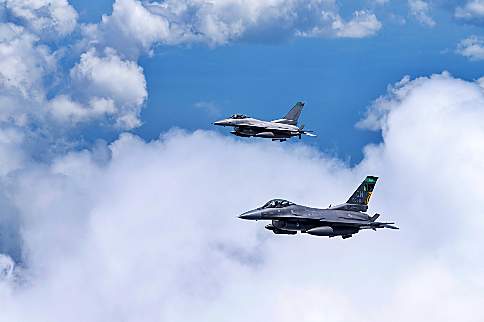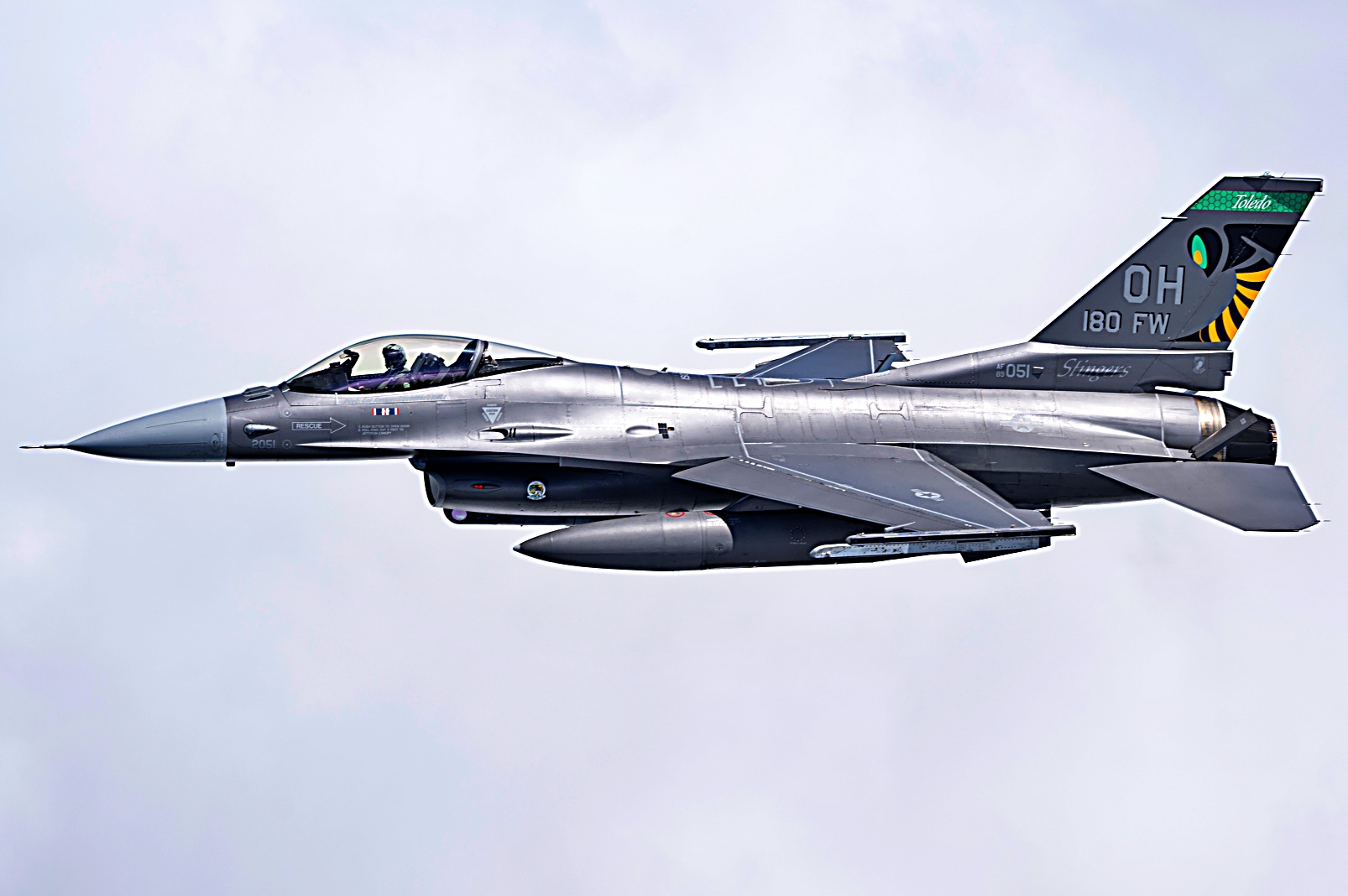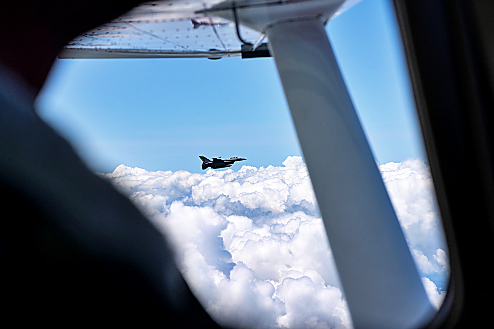 미국 오하이오 주 방위공군 제180전투비행단 예하 제112 전투비행대대소속 F-16 전투기가 2025년 7월 1일 미시간 북부 상공에서 ‘Fertile Keynote’ 훈련 중 비행하고 있다. 저속 항공기 요격 훈련을 위해 주 방위군 인력은 민간 항공 순찰대 조종사와 함께 시뮬레이션된 항공 공간 침범 및 긴급 상황 시나리오에서 협업했다.