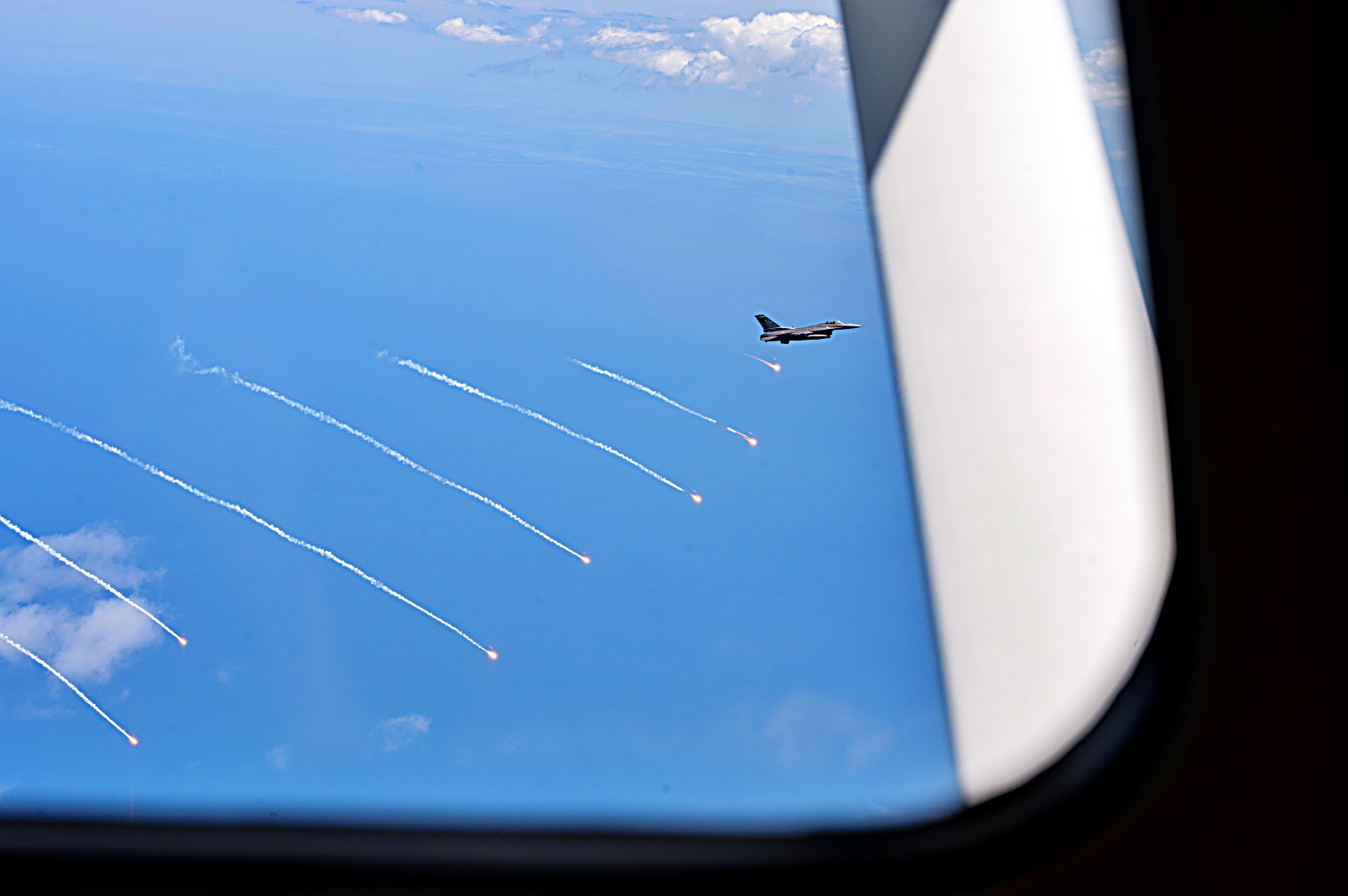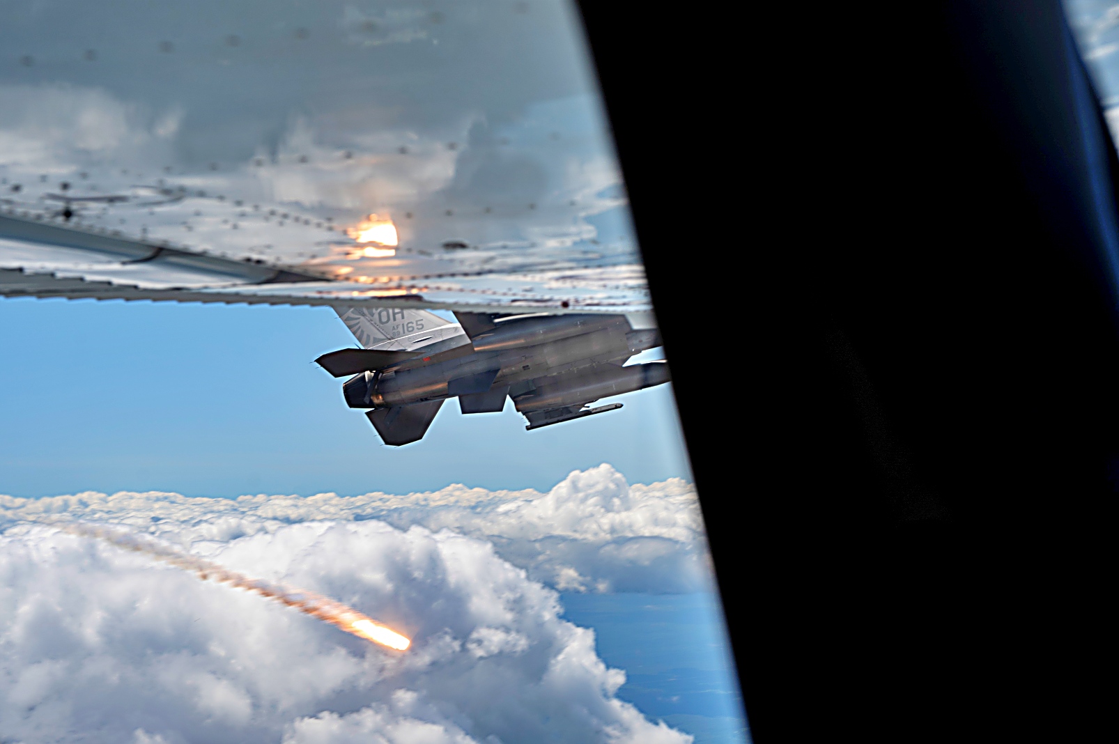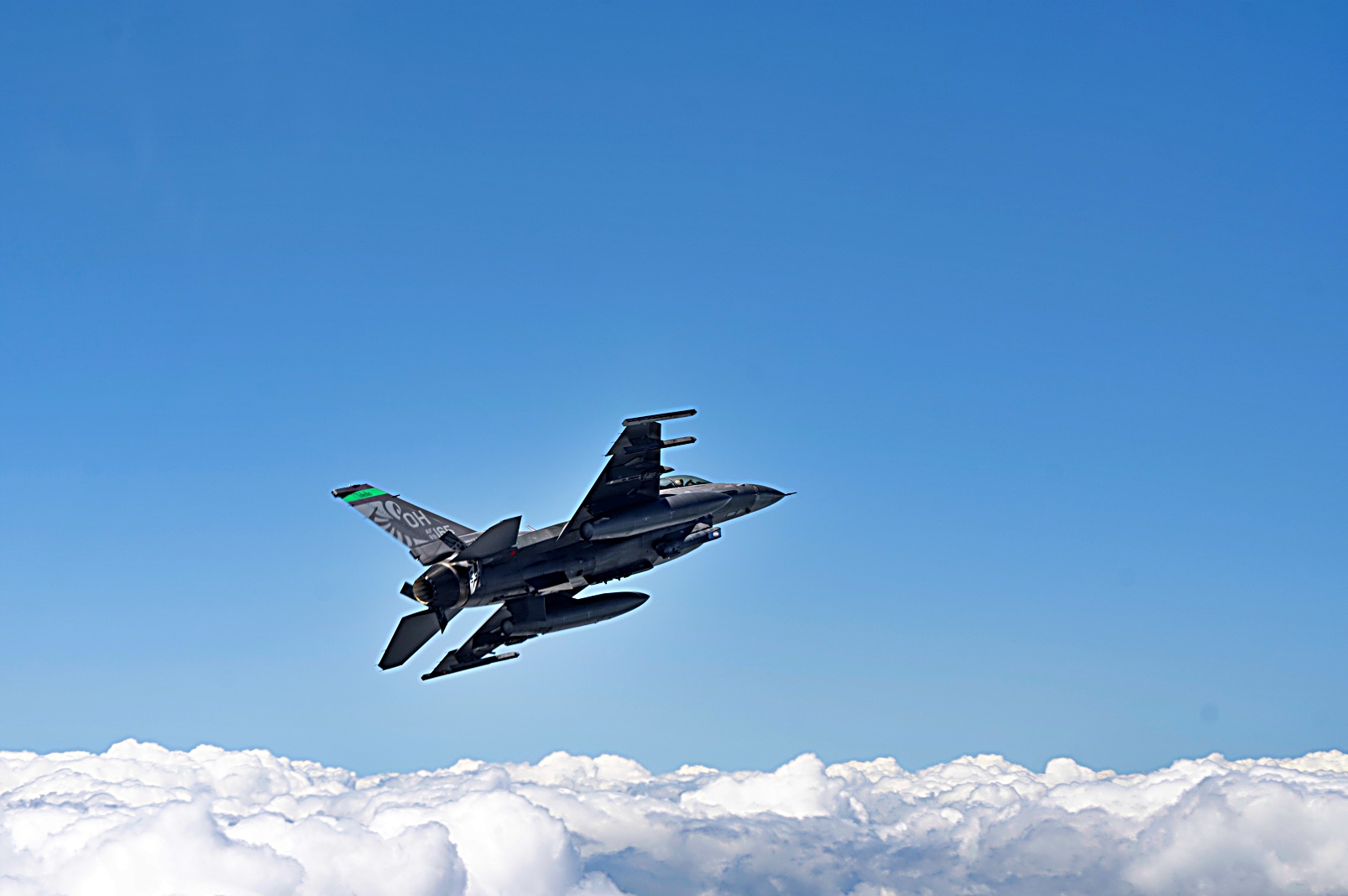 미국 오하이오 주 방위공군 제180전투비행단 예하 제112 전투비행대대소속 F-16 전투기가 2025년 7월 1일 미시간 북부 상공에서 ‘Fertile Keynote’ 훈련 중 비행하고 있다. 저속 항공기 요격 훈련을 위해 주 방위군 인력은 민간 항공 순찰대 조종사와 함께 시뮬레이션된 항공 공간 침범 및 긴급 상황 시나리오에서 협업했다.