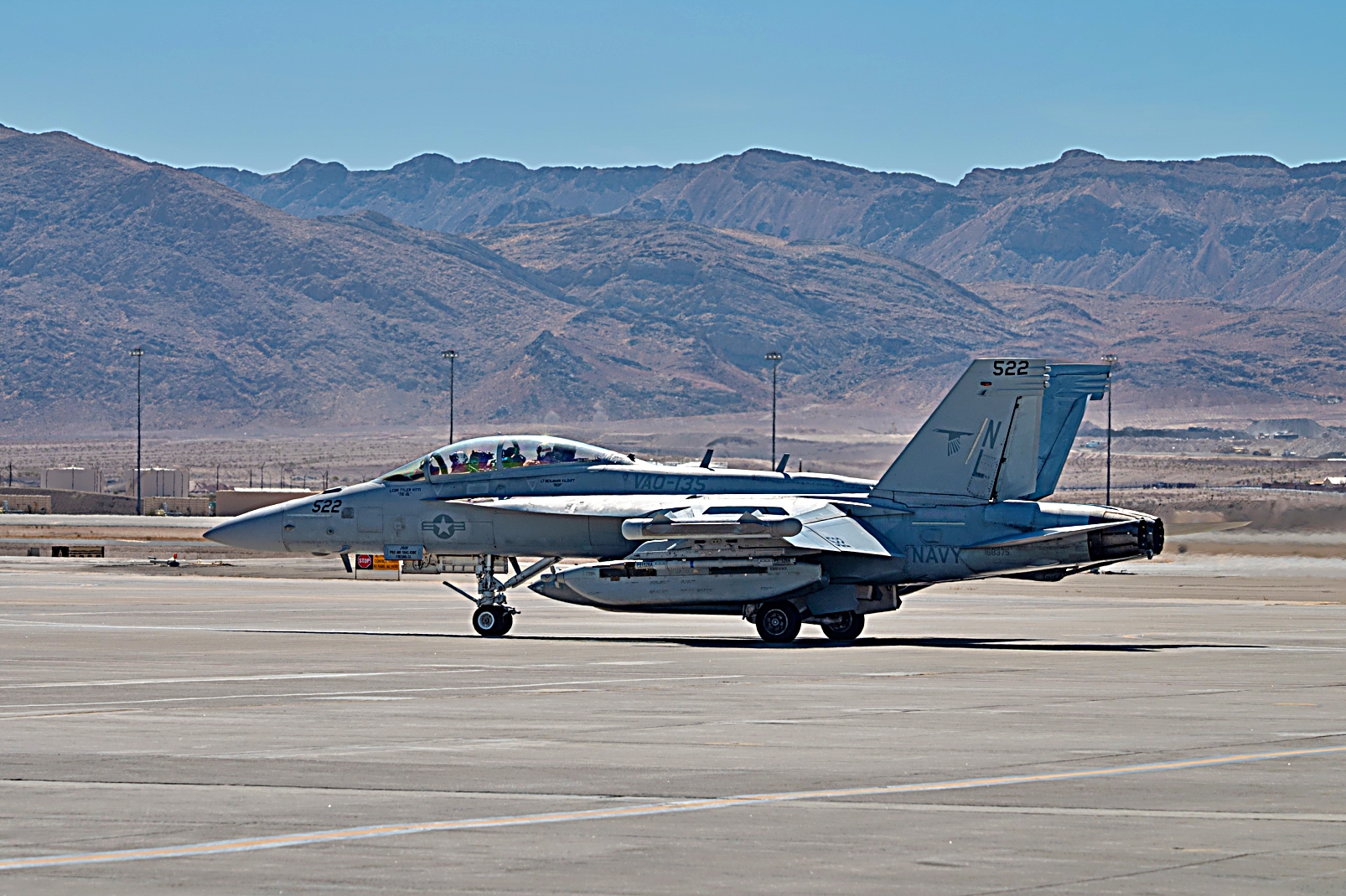 Red Flag-Nellis 25-3에 참가한 워싱턴 주 Whidbey Island 해군 항공 기지 VAQ-135 전자 공격 대대에 배속된 미국 해군 EA-18G Growler 전자전 공격기와 제4 전투비행단 소속 F-15E Strike Eagle 전폭기 가 2025년 7월 22일 네바다 주 Nellis 공군 기지에서 이륙 준비를 하는 가운데 유타주 Hill 공군 기지에 소속된 미국 공군 F-35A Lightning II 공격기가 이륙하고 있다.