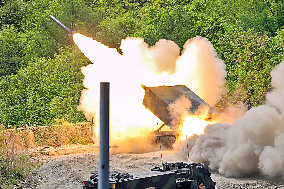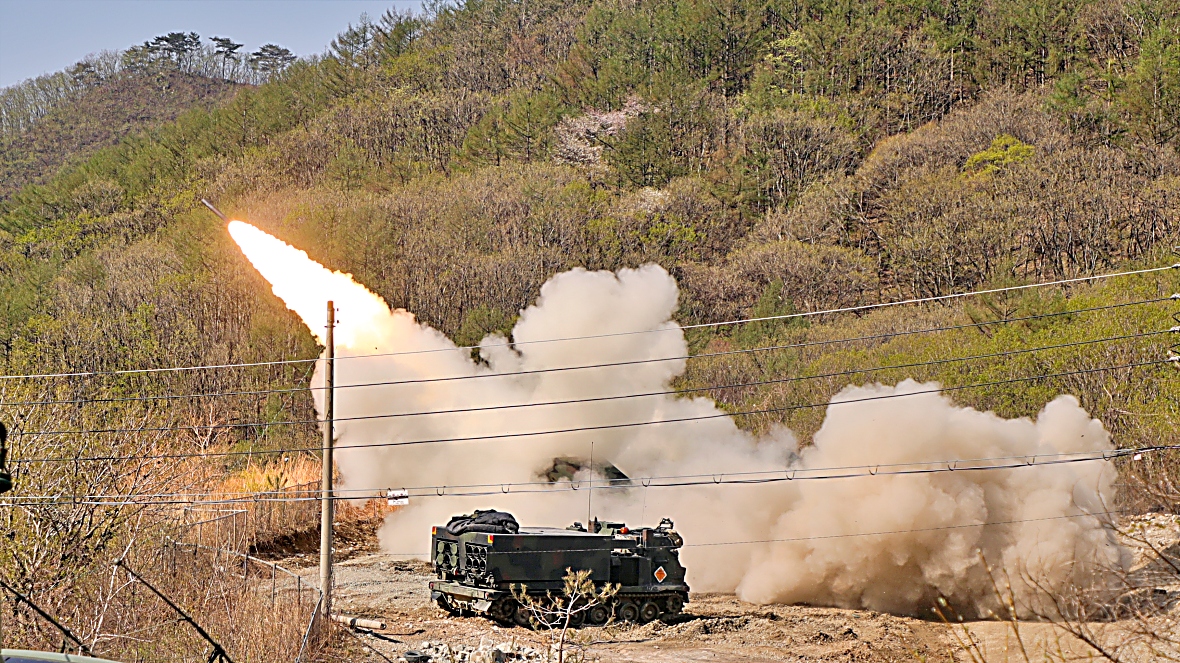 대한민국 육군 화력여단과 제1100대대와 제1야전포병여단 제2000야전포병대대 소속 M270 다연장 로켓 시스템(MLRS)들이 2025년 4월 24일 한국 포천의 Rocket Valley 사격훈련장에서 미국 육군 제2보병사단/