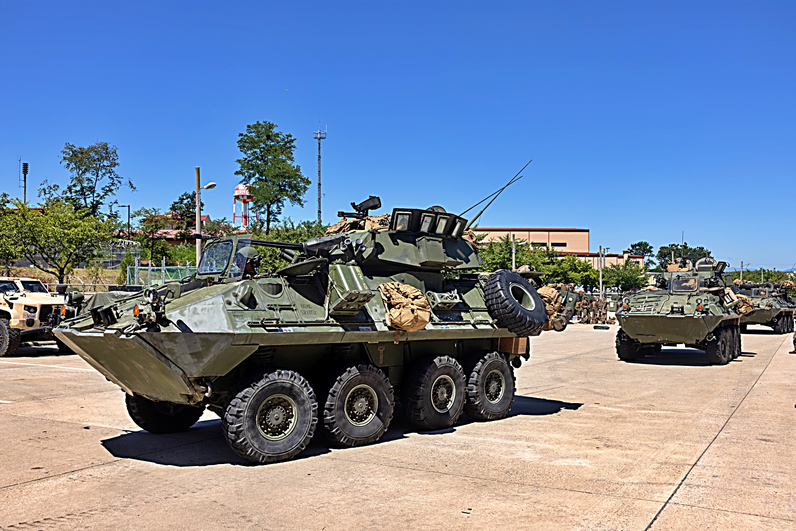 미국 해병대 제1해병사단 제3경장갑정찰대대 소속 해병대원들이 제3해병사단 제4해병연대 소속으로 인도태평양 지역에서 부대 배치 프로그램(Unit Deployment Program)의 일환으로 전방 배치 중인 가운데, 2025년 7월 28일 한국 포항 근처에서 진행된 한국 해병대 훈련 프로그램 25.2(Korean Marine Exercise Program 25.2)에서 LCA-25 경장갑차를 타고 이동하고 있다.