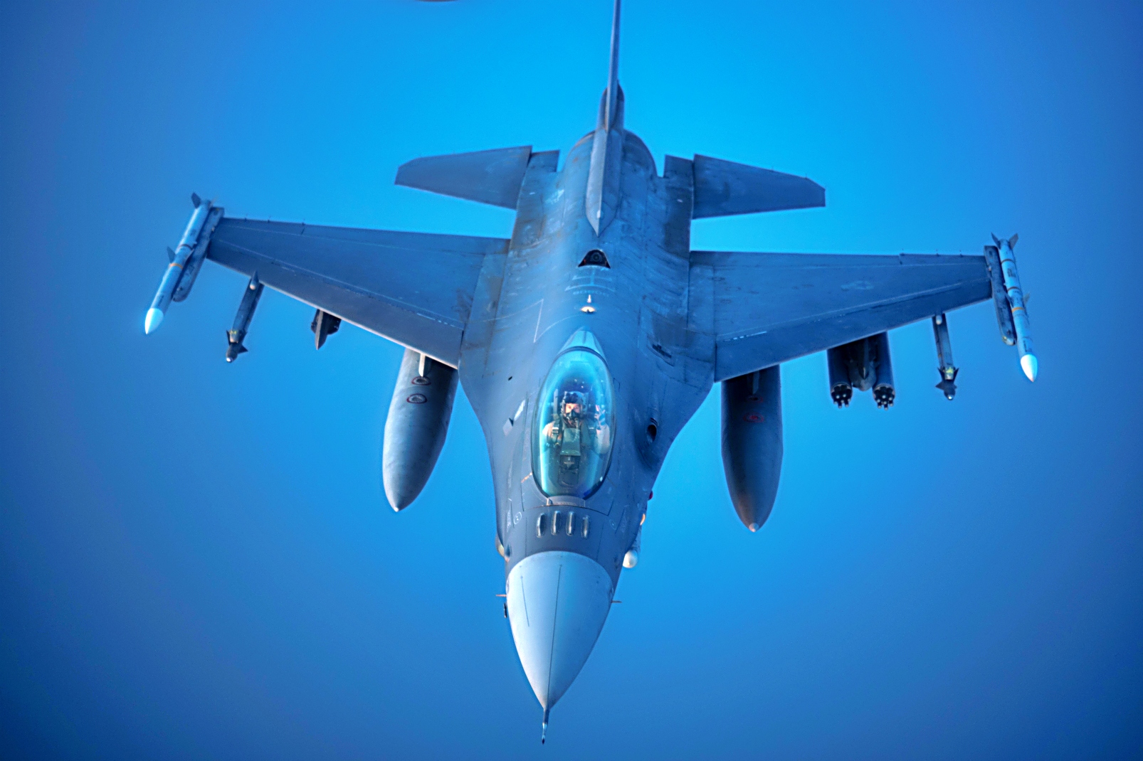 2025년 7월 27일, 미국 공군 F-16C Fighting Falcon 전투기가 미국 중앙사령부 작전 지역 상공에서 KC-135 Stratotanker로부터 공중 급유를 받으며 나란히 비행하고 있다.