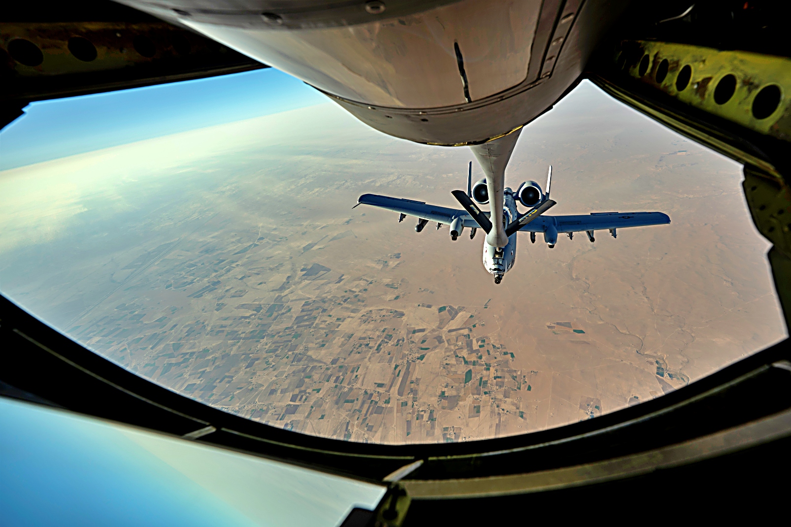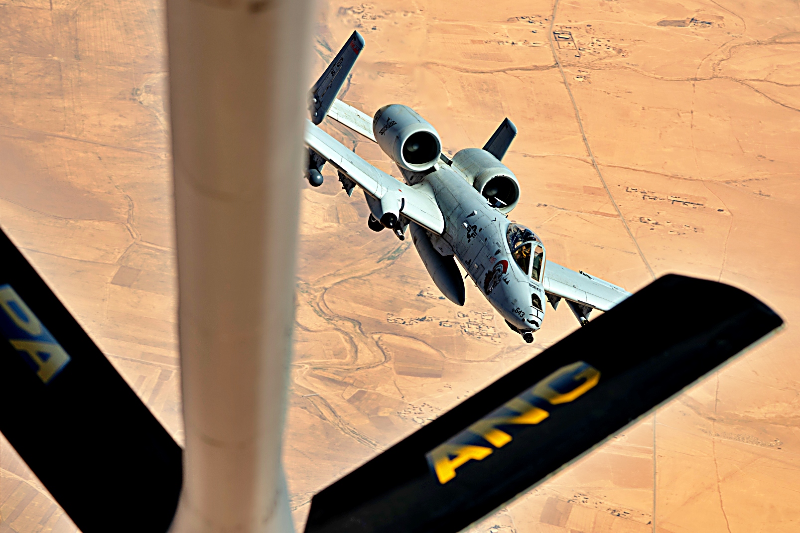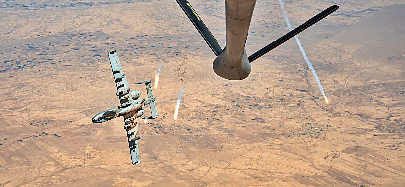 2025년 7월 23일, 미국 중앙사령부 작전 지역 상공에서 미국 공군 A-10 Thunderbolt II 공격기가 KC-135 Stratotanker와 공중 급유를 받으며 순찰 비행을 실시하고 있다. A-10은 전투 지역 근처에서 장시간 체공할 수 있으며, 낮은 고도와 시야 조건에서도 작전을 수행할 수 있다.