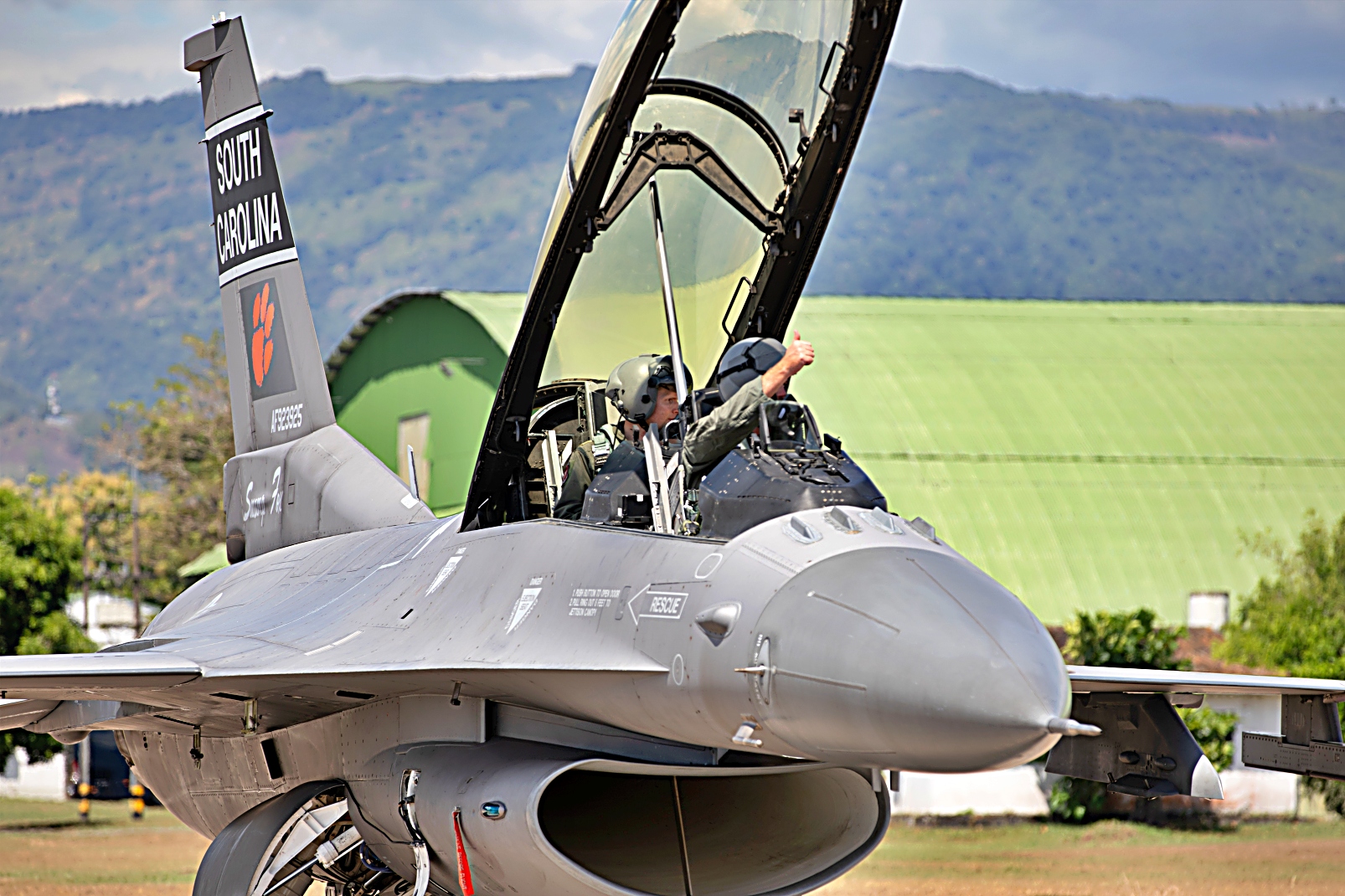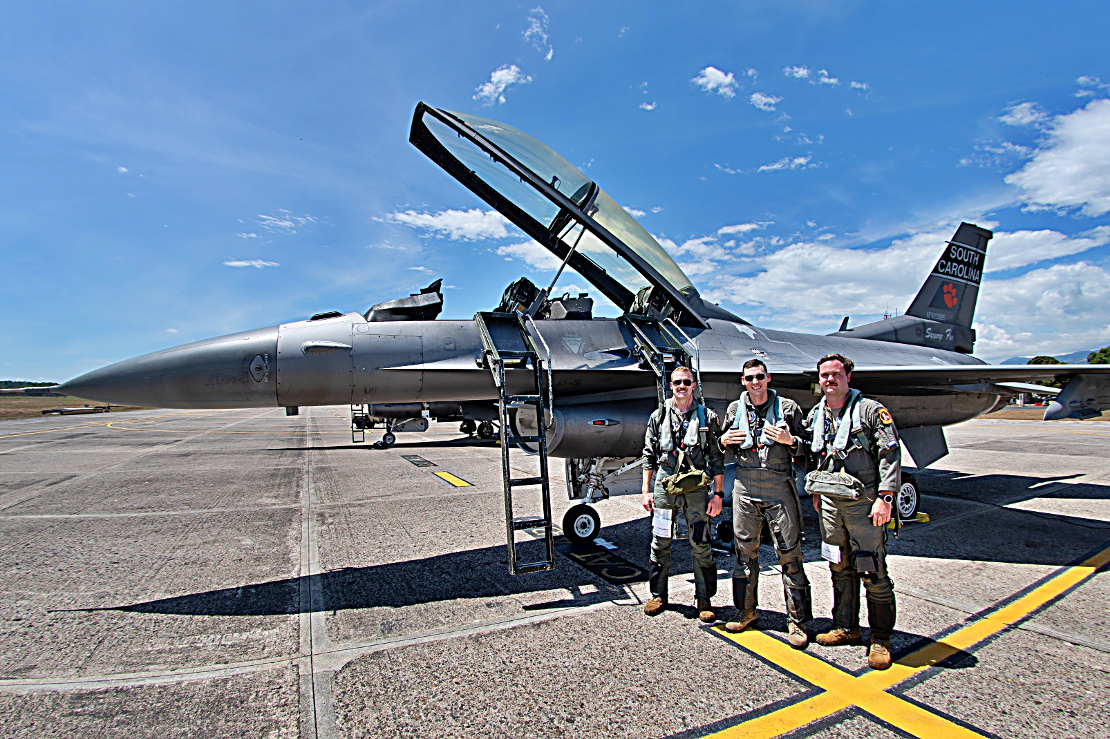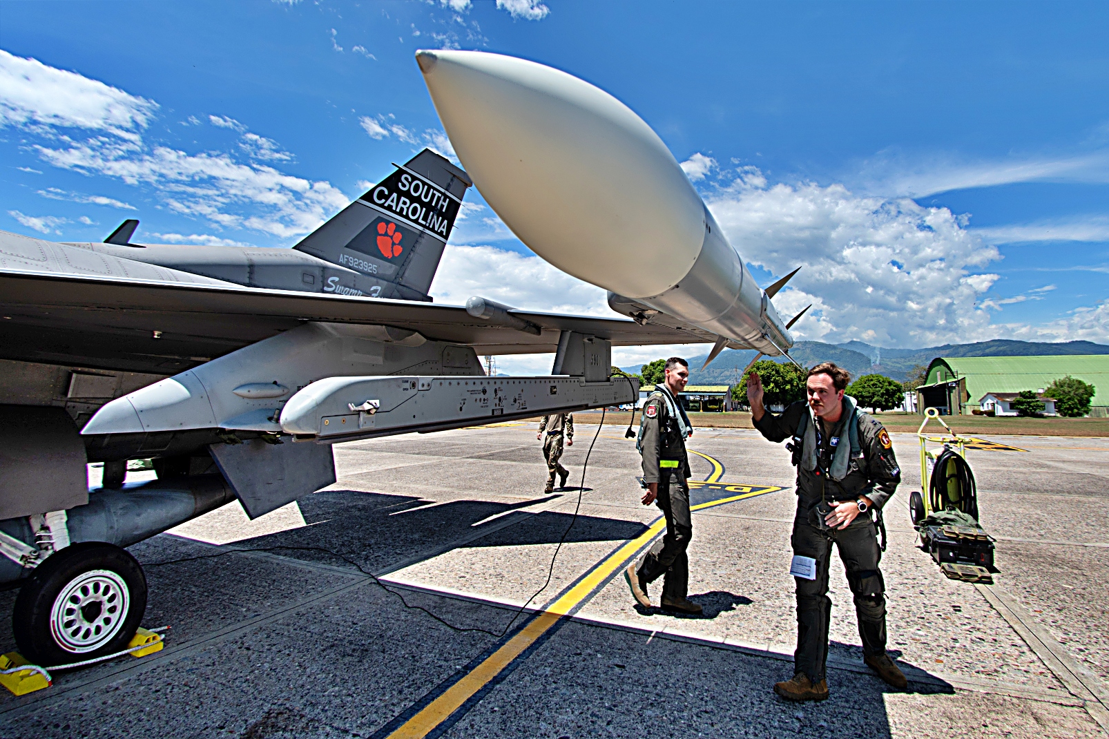 7월 30일 콜롬비아 Palanquero 공군기지에서 다국적 훈련 'Relámpago de los Andes' 25이 진행중인 가운데 미국 공군 사우스캐롤라이나 주방위군 제169 전투비행단의 F-16D 전투기에 콜롬비아 항공우주군 제111 전투비행대대 조종사가 탑승하여 이륙을 준비하고 있다.