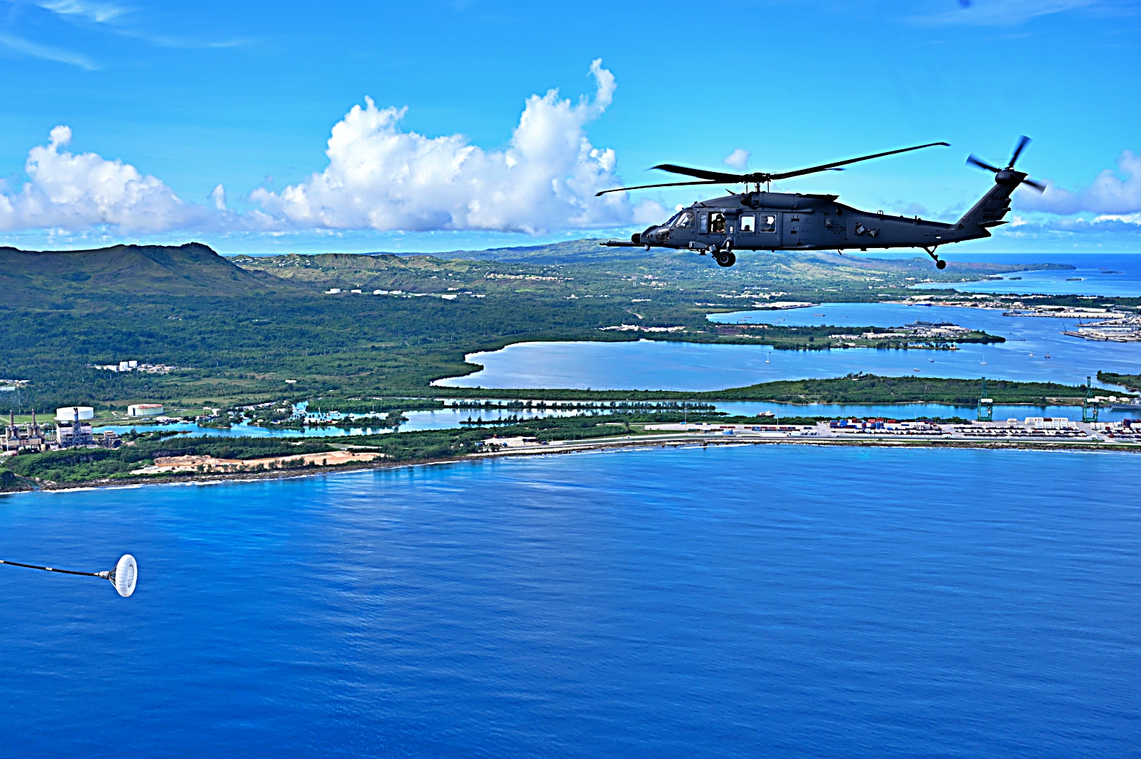 HC-130J Combat King II 특수작전 수송기가 2025년 7월 20일 북마리아나 제도 사이판과 로타 주변에서 진행된 ‘Resolute Force Pacific’ 훈련 중 563 구조비행대의 HH-60W Jolly Green II 헬리콥터 2대에 공중 급유를 실시하고 있다. REFORPAC은 PACAF 역사상 최대 규모의 비상 대응 훈련으로, 군인들에게 스트레스 상황에서도 준비 태세를 유지하고 임무를 수행할 수 있도록 훈련한다.
