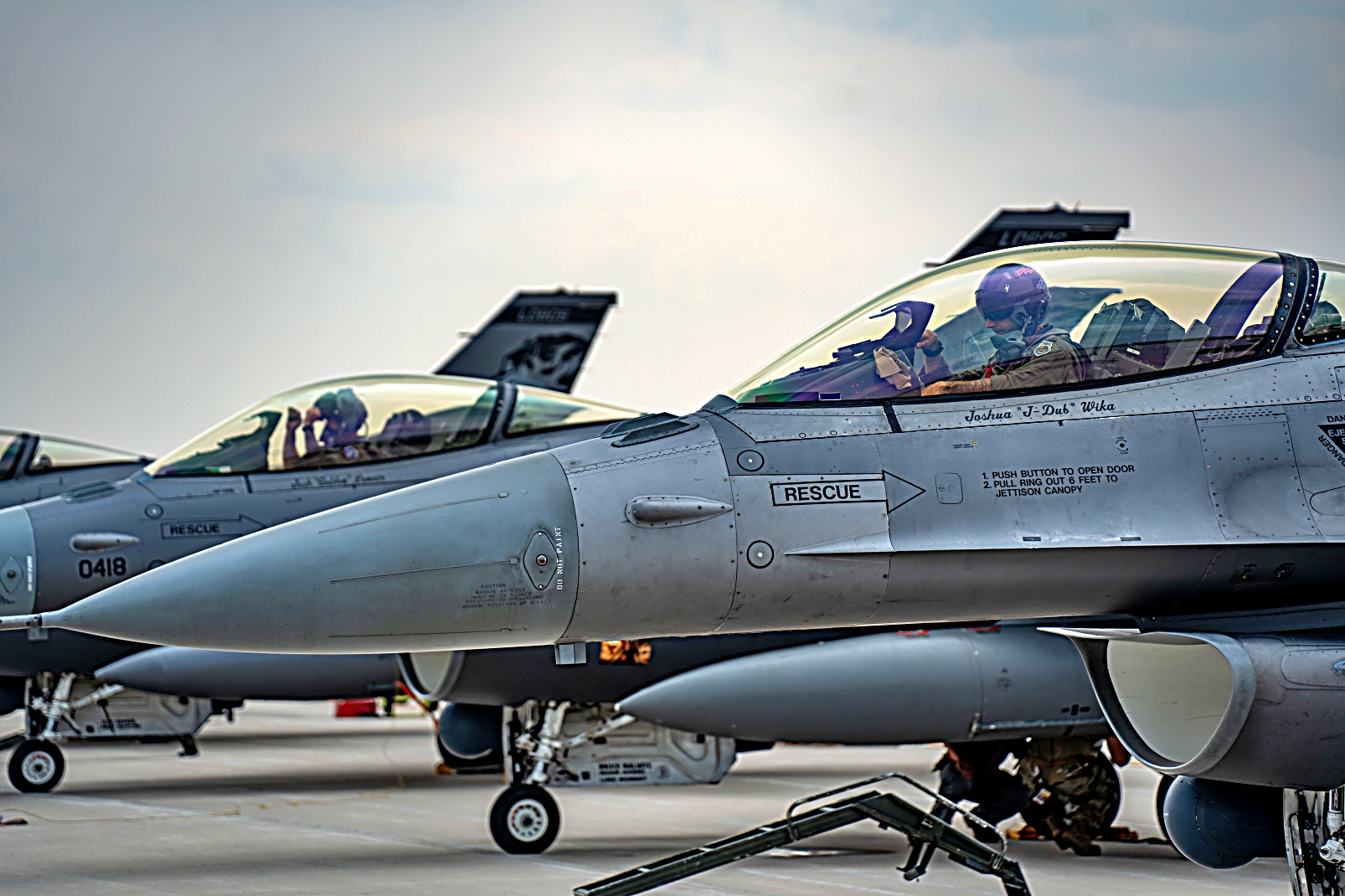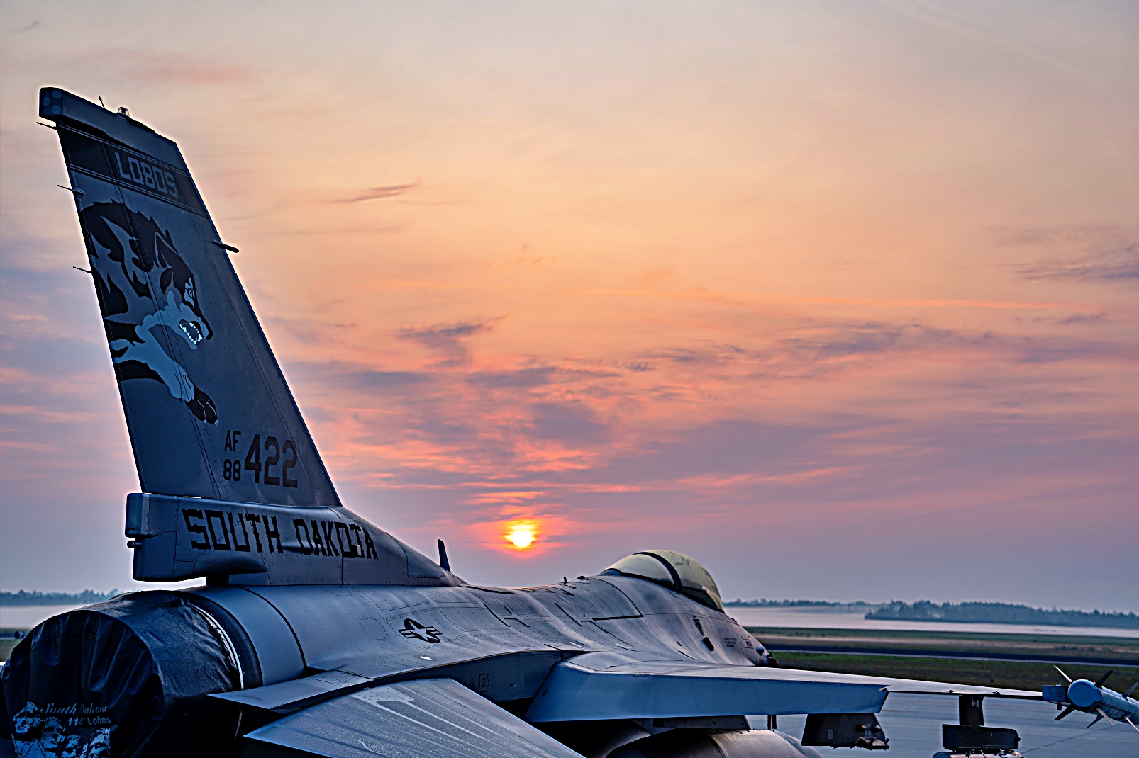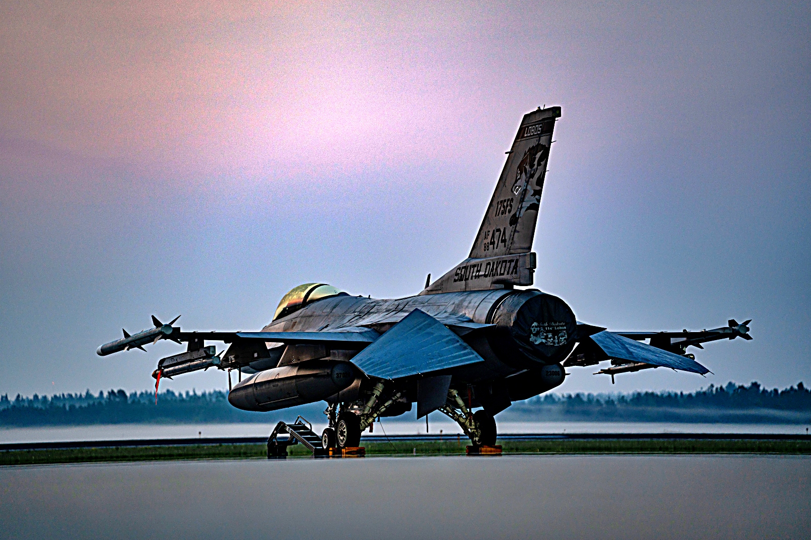 미국 사우스 다코타 주방위공군 제114 전투비행단 제 175 전투비행대 소속 F-16 Fighting Falcon 전투기들이 2025년 8월 4일 미시간주 Alpena 전투 준비 훈련 센터에서 진행된 ‘ Northern Strike 25-2 훈련에 참가하여 이른 아침부터 출격을 준비하고 있다.
