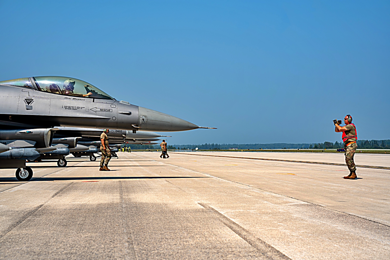 미국 사우스 다코타 주방위공군 제114 전투비행단 제 175 전투비행대 소속 F-16 Fighting Falcon 전투기들이 2025년 8월 4일부터 7일사이 미시간주 Alpena 전투 준비 훈련 센터에서 진행된 ‘ Northern Strike 25-2 훈련에 참가하여 임무비행을 위해 출격하는 모습들이다.