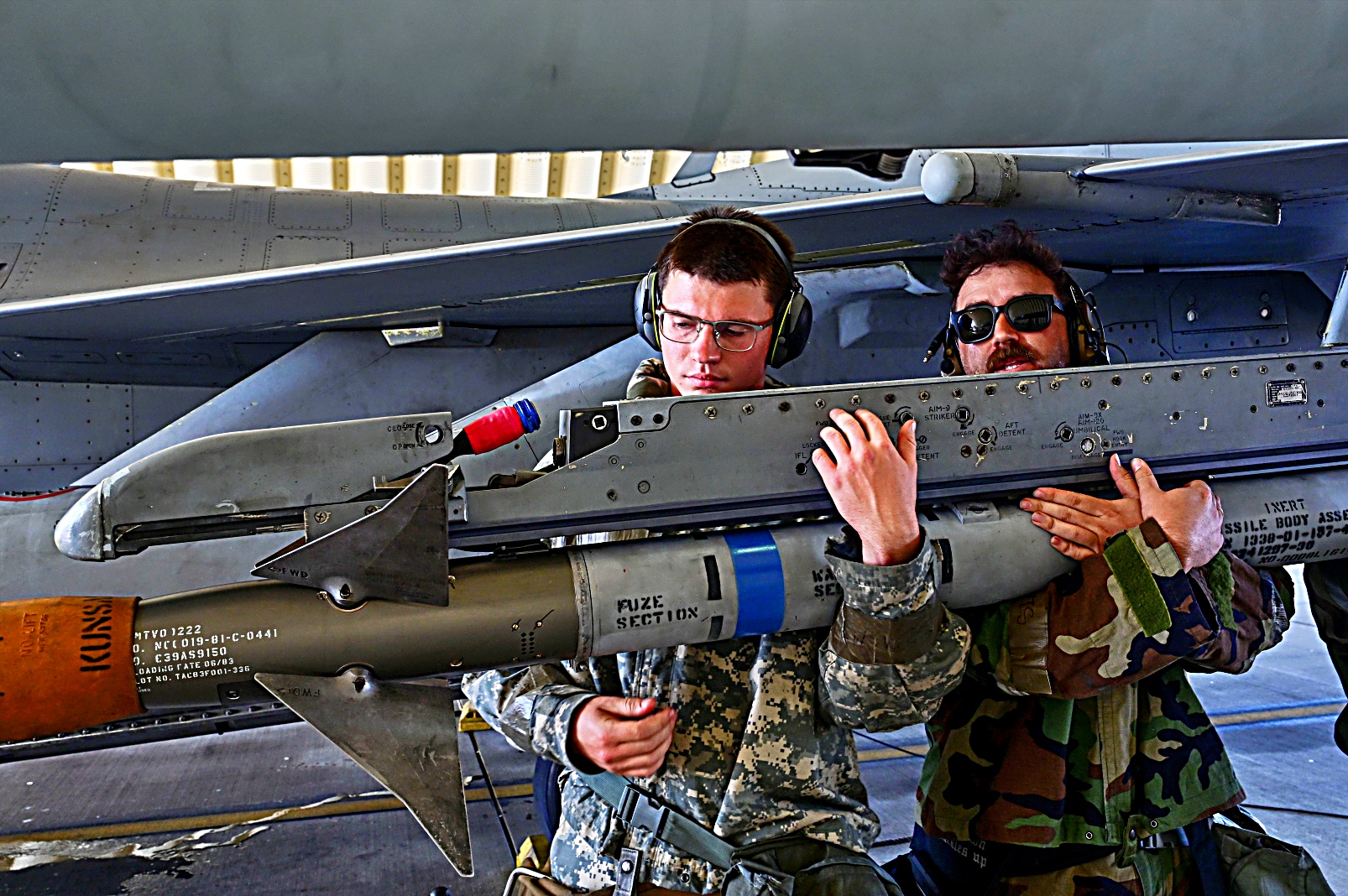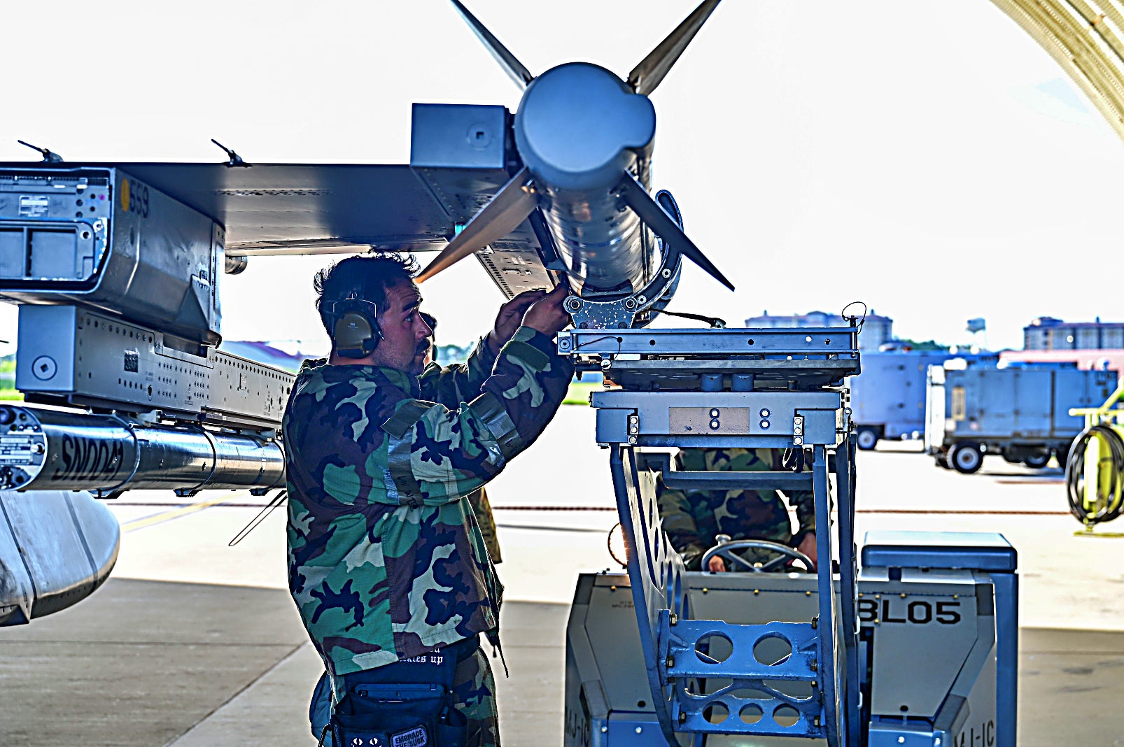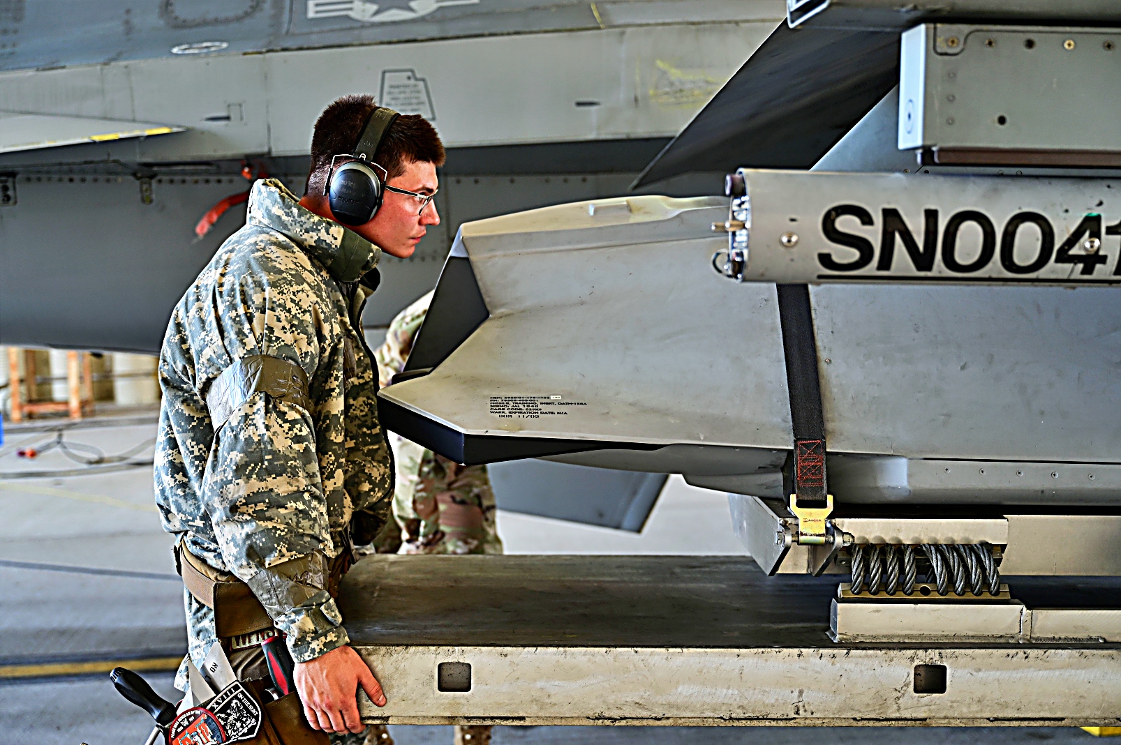 2025년 8월 7일 대한민국 군산 공군기지에서 Wolf Pack 공군 병사들이 Beverly Sentinel 25-3 훈련중 F-16 Fighting Falcon 전투기에 AIM-120 첨단 중거리 공대공 미사일 (advanced medium-range air-to-air missile (AMRAAM)와 AGM-158 합동 공대지 장거리 순항 미사일 Joint Air-to-Surface Standoff Missile (JASSM)을 장착하고 있다.