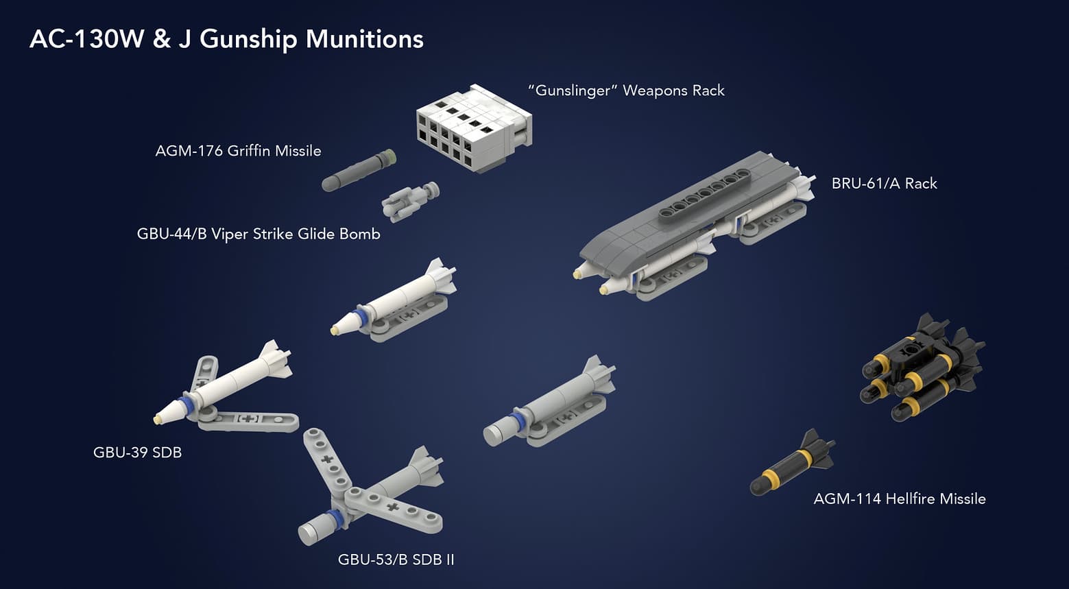 날개 장착형 AGM-114 Hellfire 미사일 (AC-130J 전용), GBU-39 소형 직경 폭탄 (SDB), 및/또는 GBU-53/B SDB II (BRU-61/A 랙당 하드포인트당 4발)