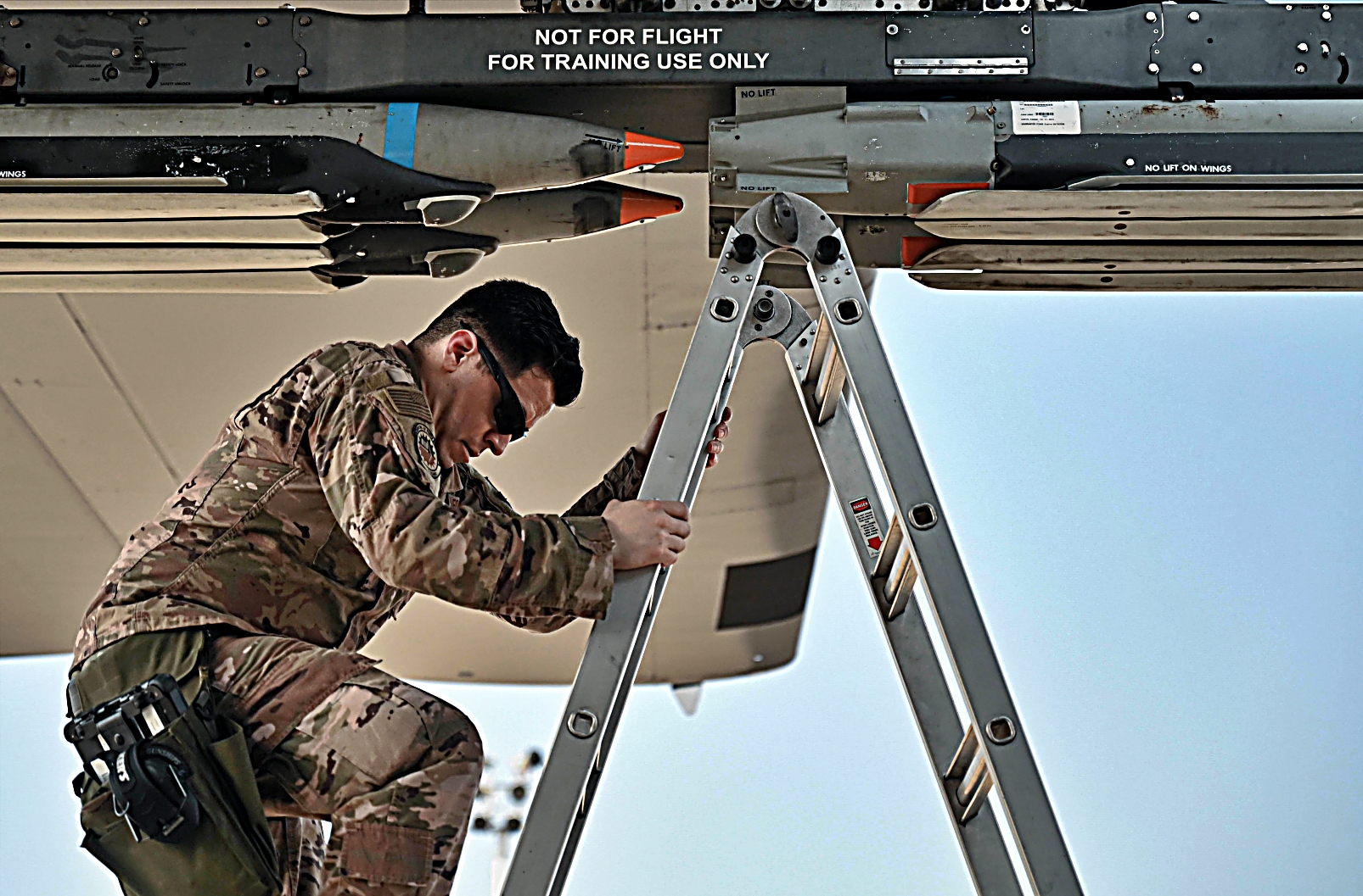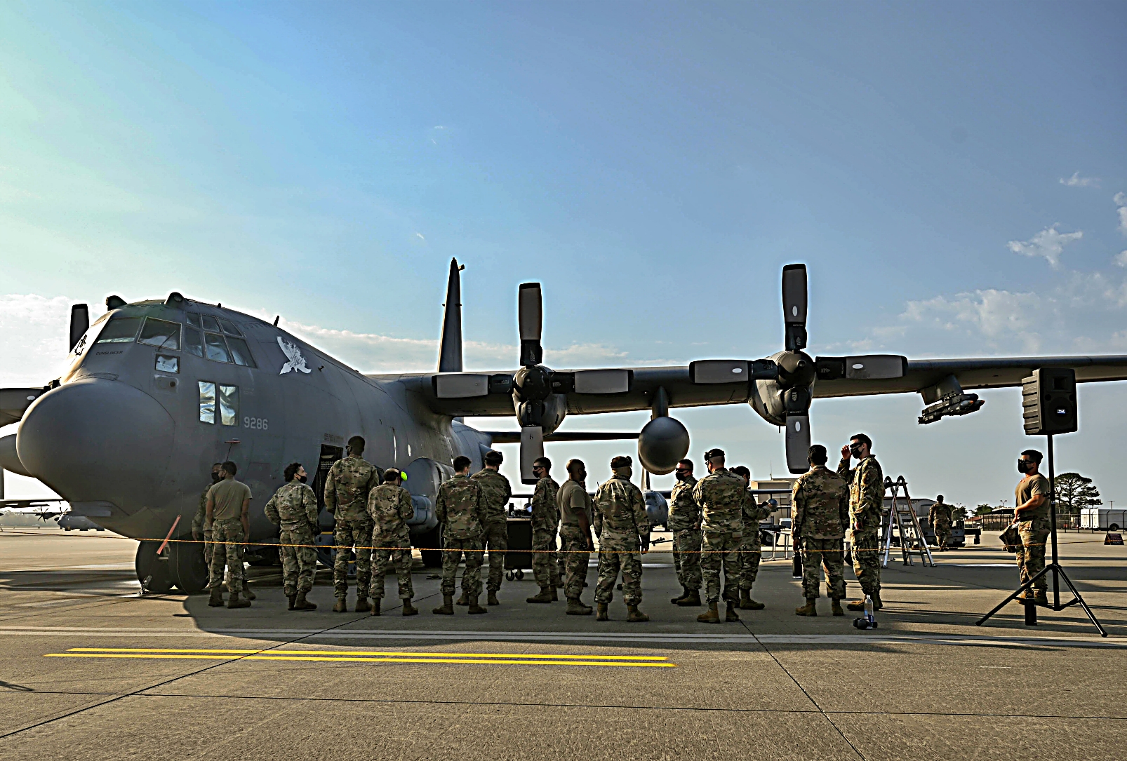 2018년 7월 23일 서남아시아의 미공개 장소에서 16 특수 작전 비행대대 소속 유지보수 요원이 AC-130W Stinger II에 무장을 장착하며 임무 전 이륙 준비 및 점검 중이다.