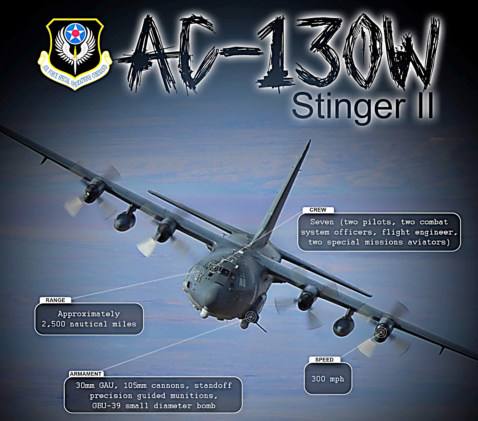 AC-130W Stinger II 건쉽의 주요 임무는 근접 항공 지원, 항공 차단 및 무장 정찰이다. 고도로 개조된 AC-130W Stinger II은 개선된 항법, 위협 탐지, 대응 조치 및 통신 시스템을 갖추고 정밀 타격 패키지로 개조되어 지상 부대에 신속하고 지속적인 직접 화력 플랫폼을 제공하며, 정밀 저출력 탄약을 투하할 수 있어 근접 항공 지원 및 도시 작전에 이상적으로 적합하다.
