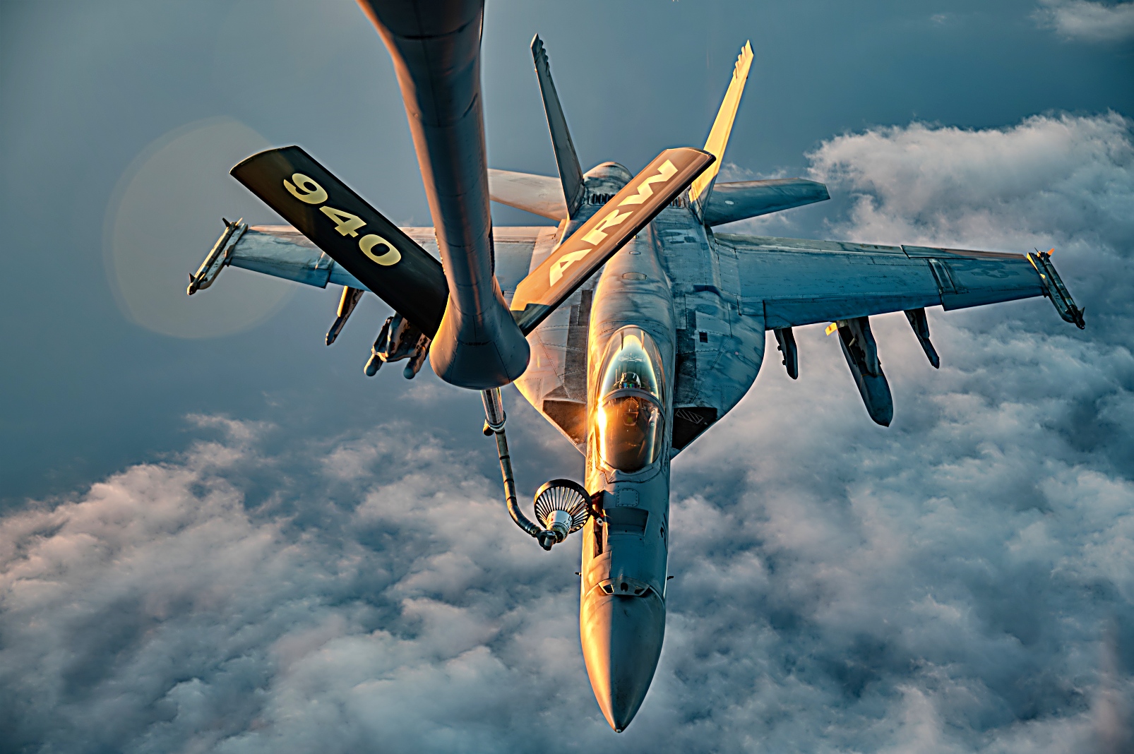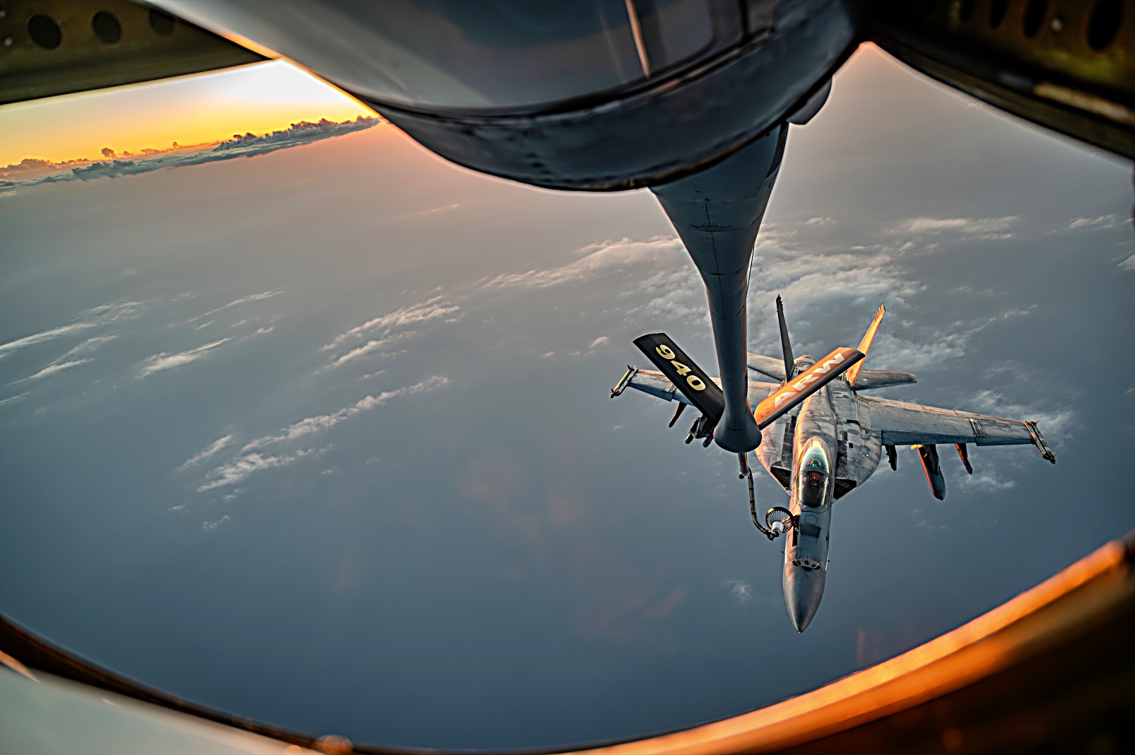 미 해군 VFA-143 "Pukin Dogs," 타격전투비행대 소속 F/A-18E Super Hornet 전폭기가 지난 3월 26일 미 중앙사령부 관할의 중동 하늘에서 공중급유를 받으며 해상안보와 안정을 지원하는 순찰 비행을 수행하고 있다.