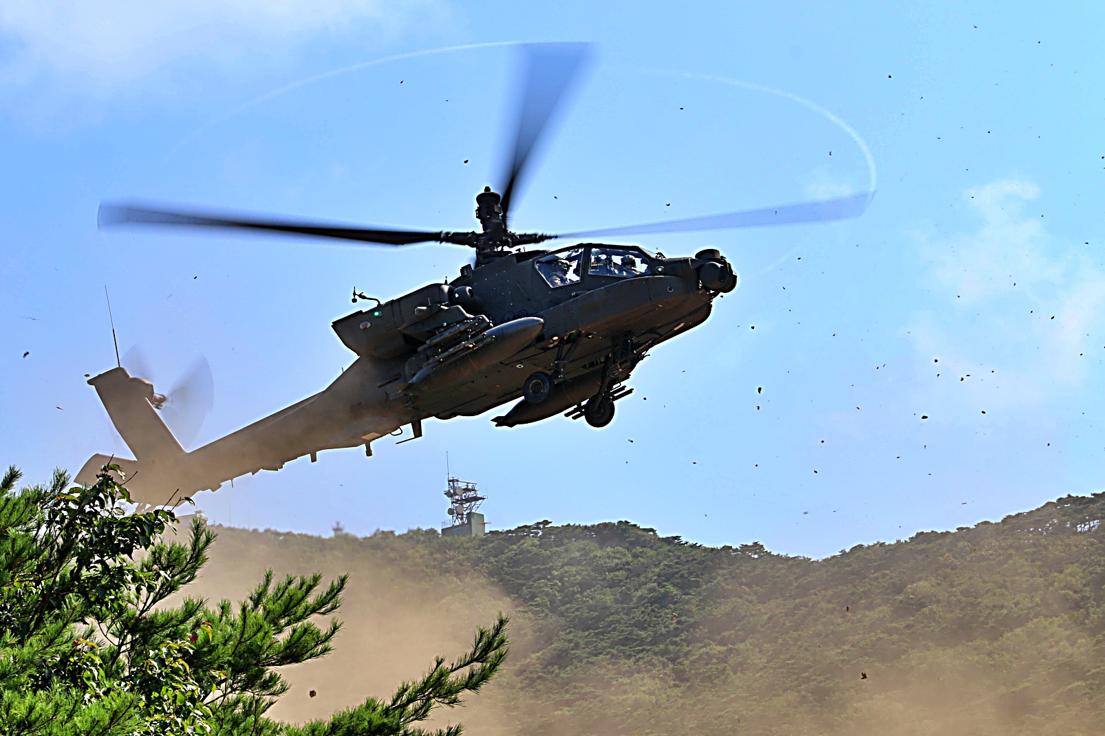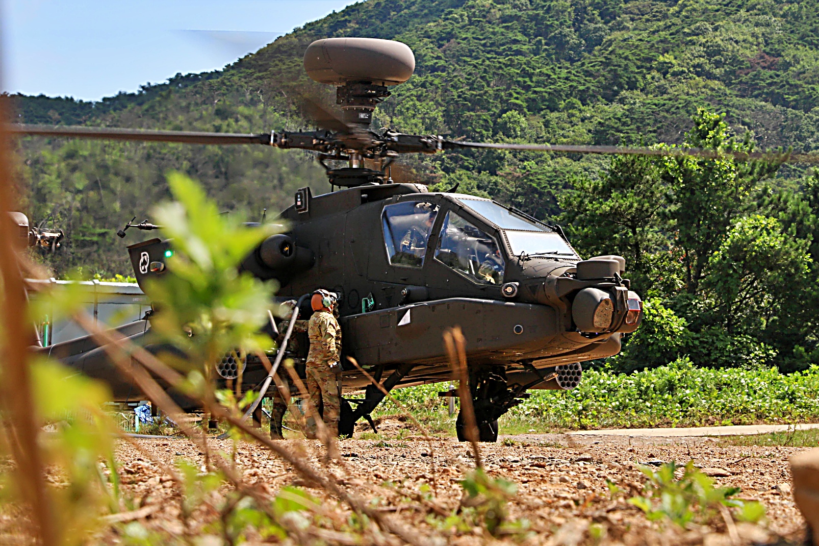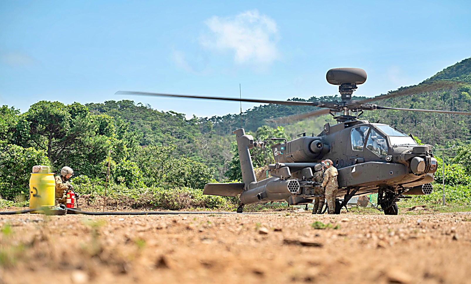 2025년 8월 21일, 주한 미육군 제2보병사단/한미 연합사단 소속 제2전투항공여단 제2일반지원항공대대 제3대대에 배속된 CH-47F Chinook 수송헬기가 2025년 8월 21일 제부도에서 진행된 Ulchi Freedom Shield 25 훈련 중 AH-64E Apache 공격헬리콥터의 연료 보충 작전을 수행하며 전투준비태세를 갖추었다.