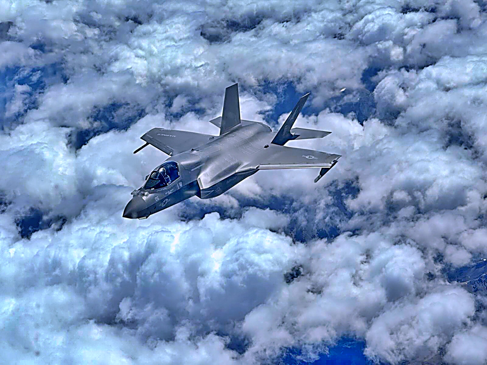 미국 해병대 제2해병항공단 제31해병항공군 VFMA-533 해병전투공격비행대 "Hawks" 소속 F-35B Lightning II 공격기가 2025년 8월 8일 알래스카의 Elmendorf-Richardson 합동 기지에서 열리는 ARCTIC EDGE 2025(AE25) 훈련에 참가하기 위해 공중급유를 받으며 비행하고 있다.