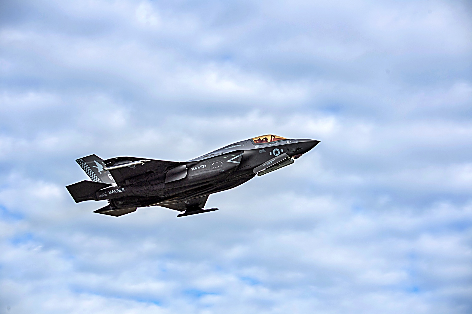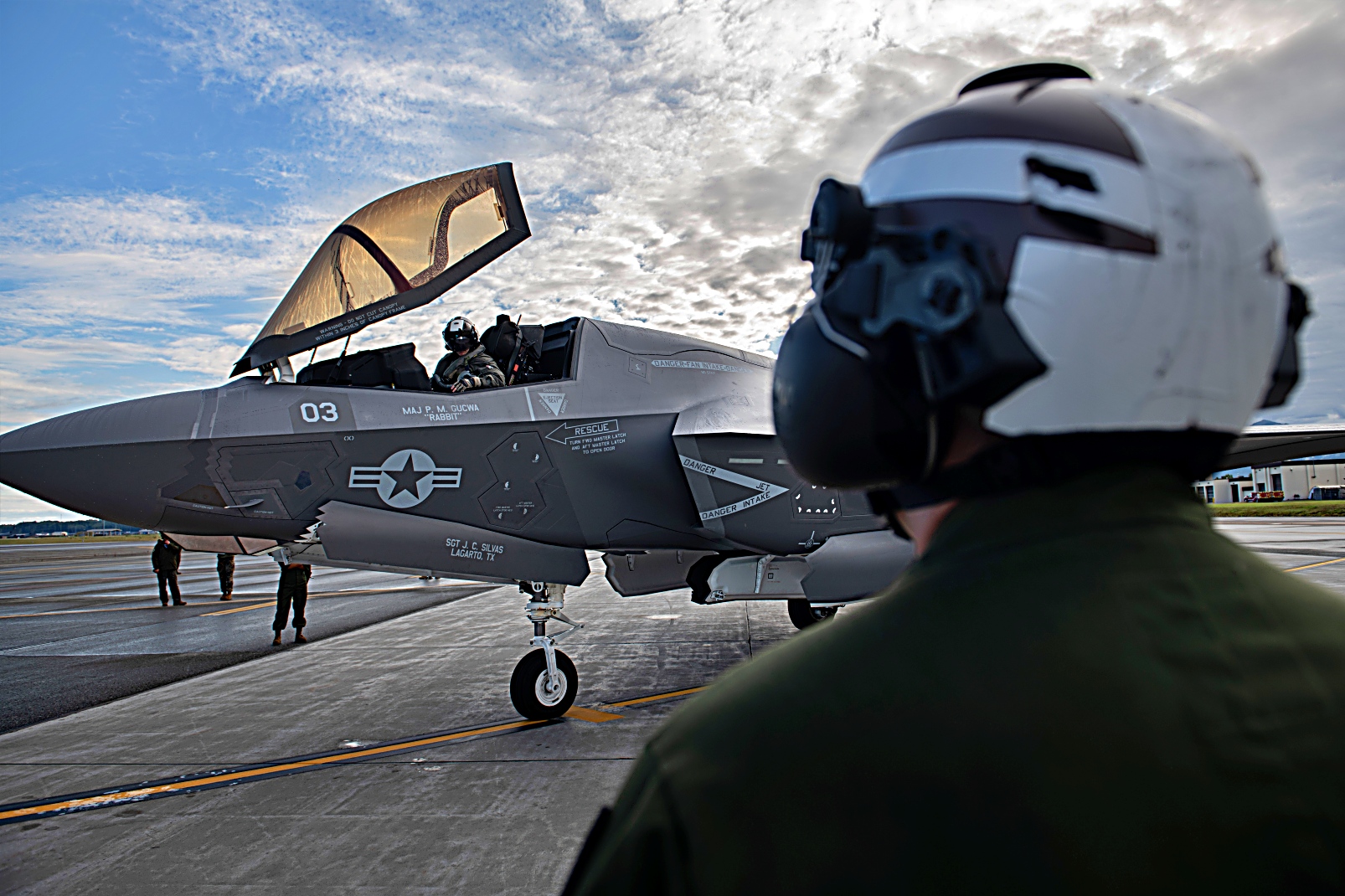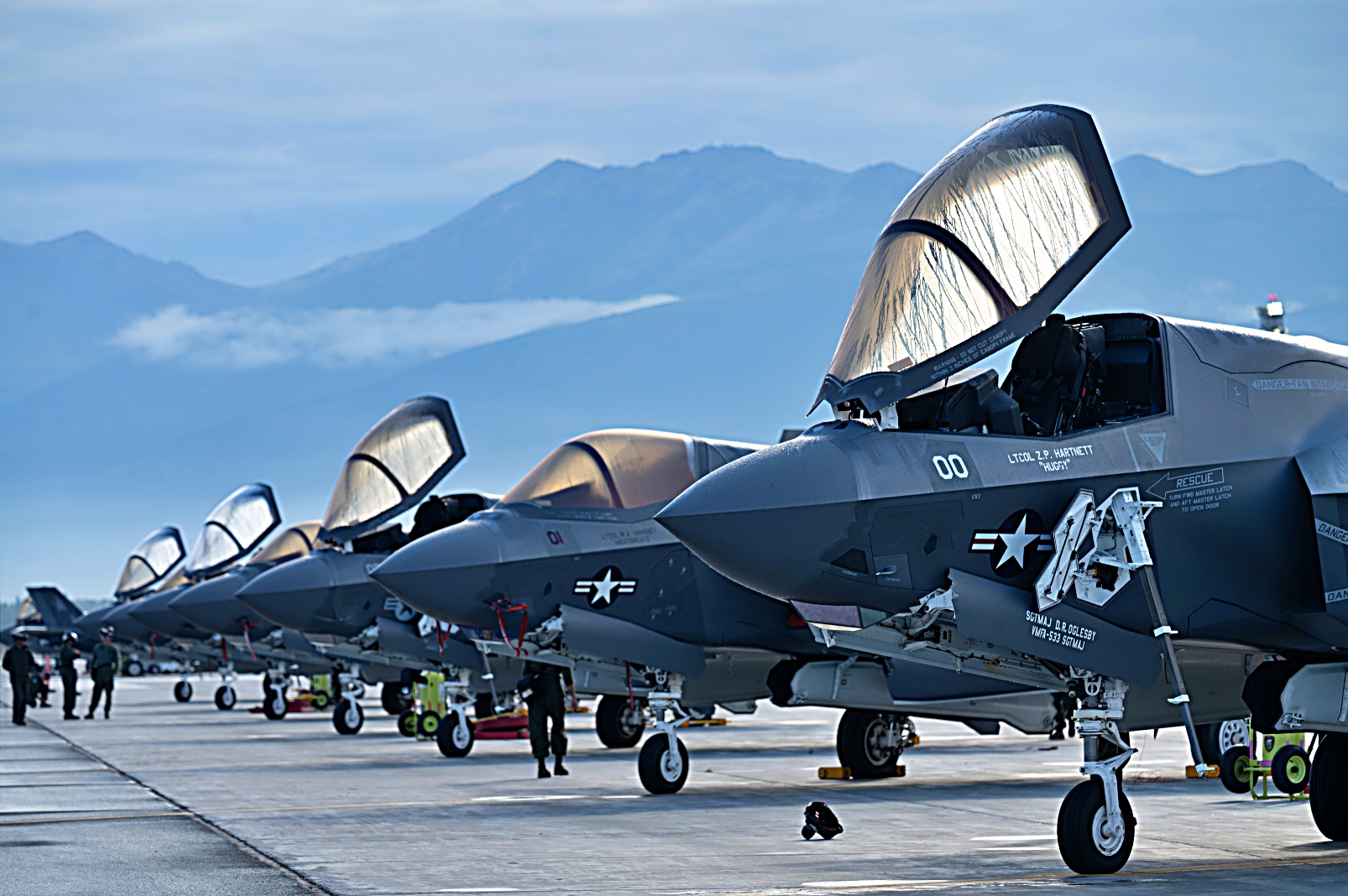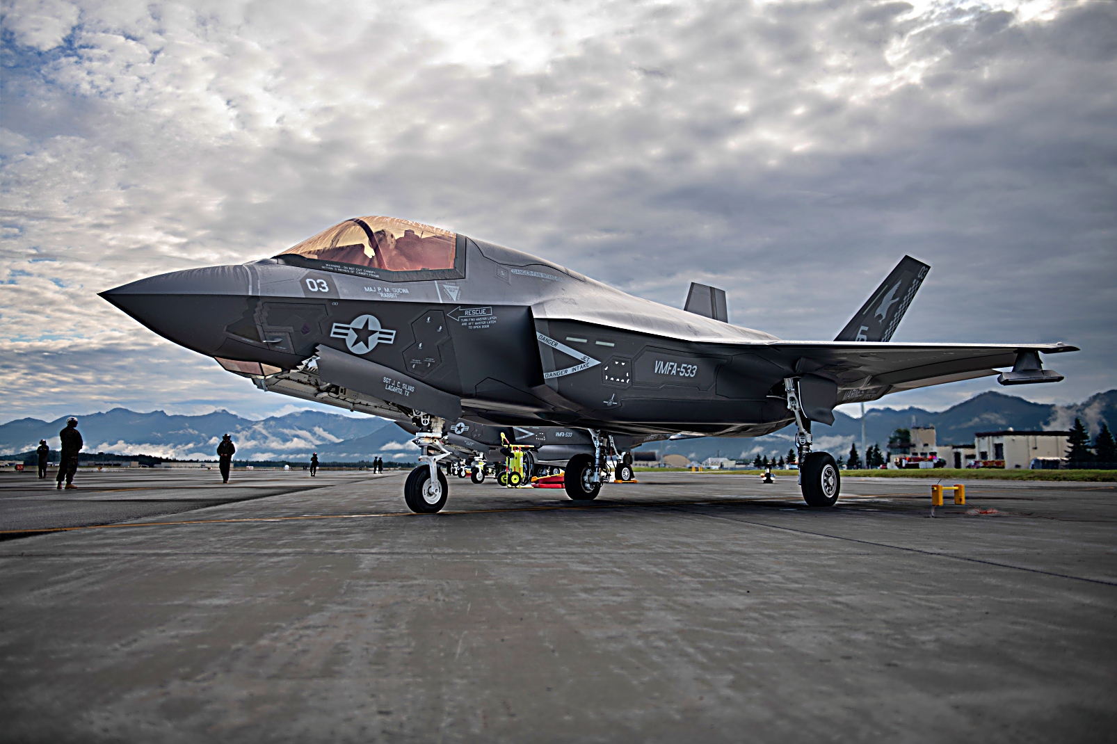 미 해병대 VMFA-533 전투 공격 비행대대 소속 F-35B Lightning II 공격기가 2025년 8월 20일 알래스카 Elmendorf-Richardson 합동 기지에서 진행되는 ‘ Northern Edge 2025’ 훈련 지원을 위해 출격 준비를 하고 이륙하고 있다.