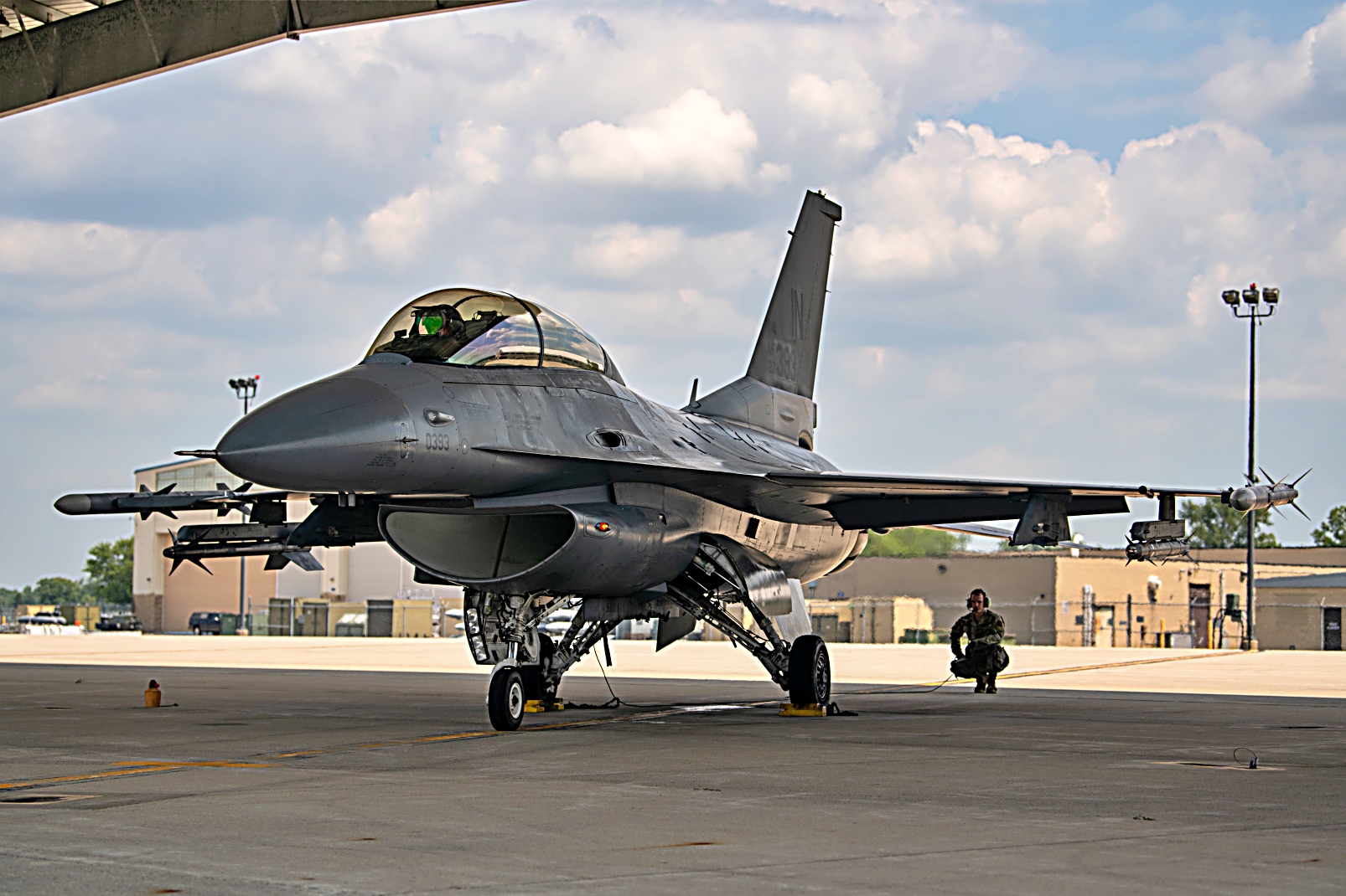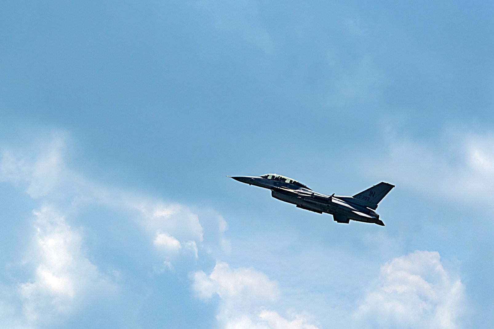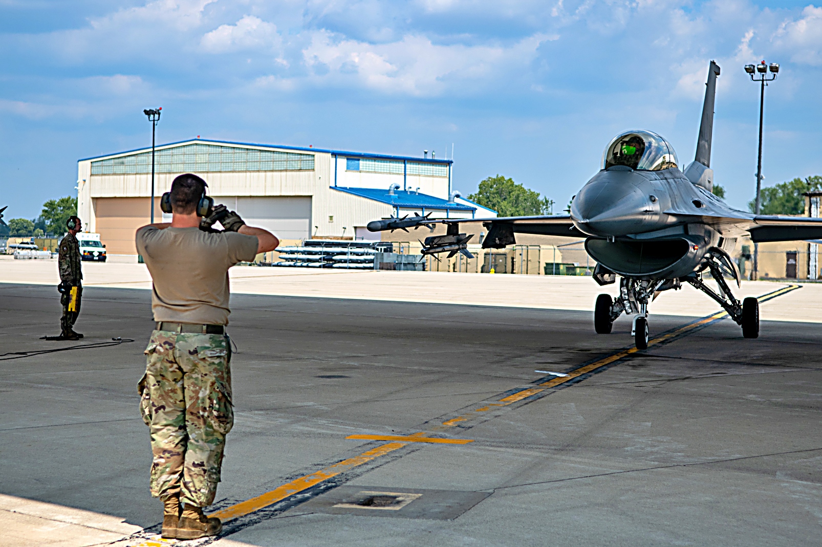 미국 공군 인디애나 주 방위군 공군 부참모장 Michael Stohler소장이 2025년 8월 15일 인디애나주 Fort Wayne에 위치한 122 전투비행단에서 F-16D Fighting Falcon 전투기로 마지막 비행 "fini-flight”를 실시했다.