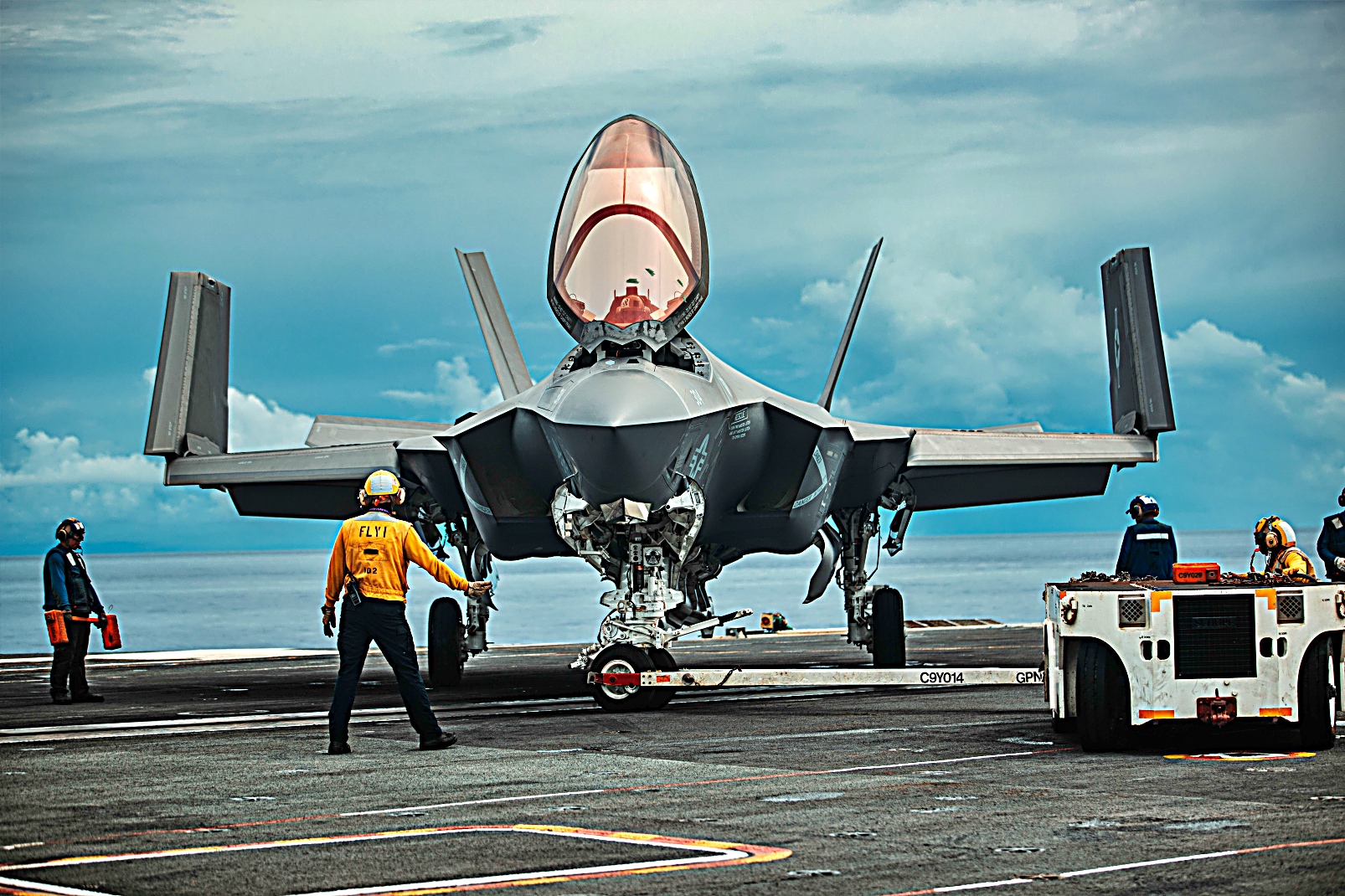 미 해군 타격전투비행대 VFA-147 "Argonauts,"소속 F-35C Lightning II 공격기가 8월 14일 필리핀해를 항진중인 미 해군 Nimitz급 항공모함 USS George Washington (CVN 73)의 비행갑판에서 이동을 준비하고 있는 가운데 F/A-18E Super Hornet, attached to 타격전투비행대 VFA-195 소속 F/A-18E Super Hornet 전폭기는 캐터펄트에서 이함을 준비하고 있다.