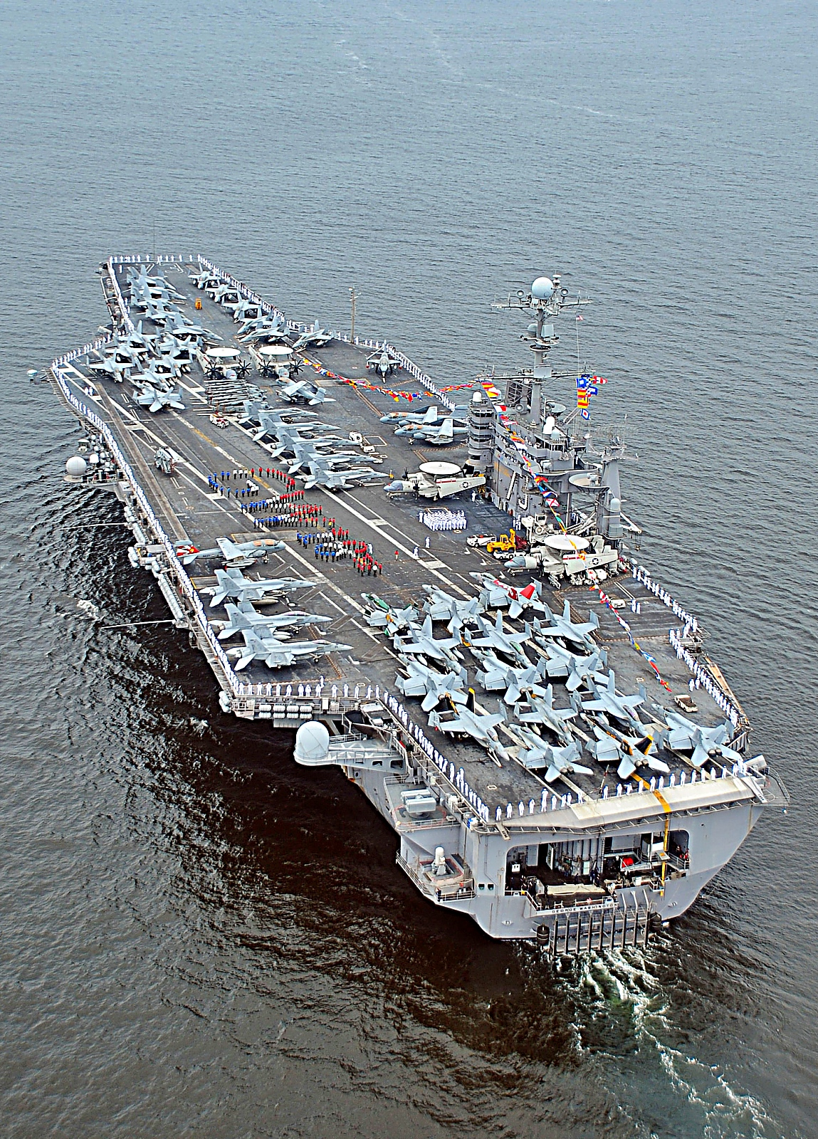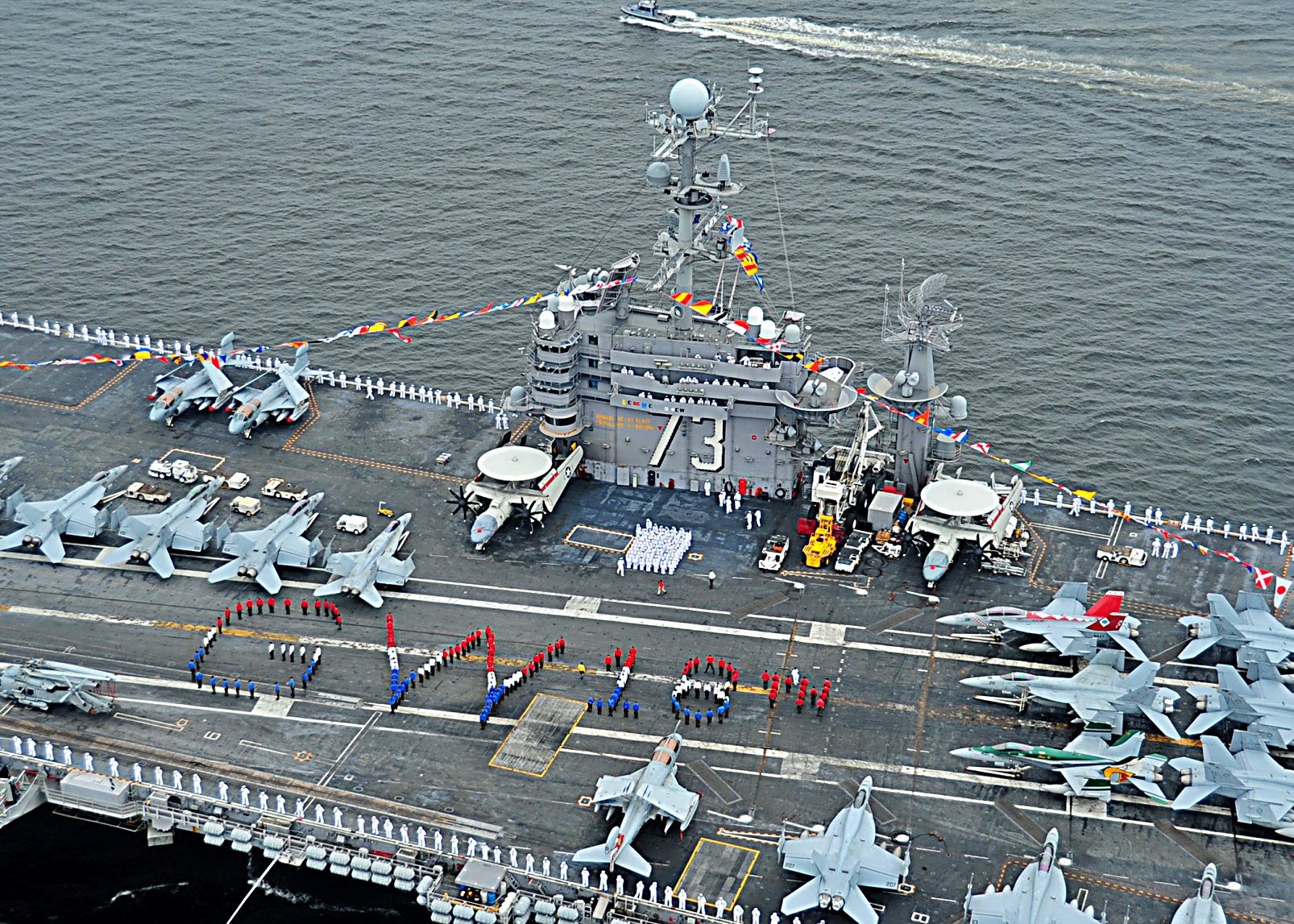 2010년 7월 3일 USS George Washington에 승선한 해군 병사들이 비행갑판에 George Washington이라는 글자를 새기며, 함정이 18년간의 해군 복무를 기념하기 위해 항구에 입항하는 모습을 보여주고 있다. 조지 워싱턴은 해군의 유일한 영구 전진 배치 항공모함으로, 2010년 여름 순찰 중 일본 요코스카에 머물며 7월 4일을 독립 기념일을 축하했다.