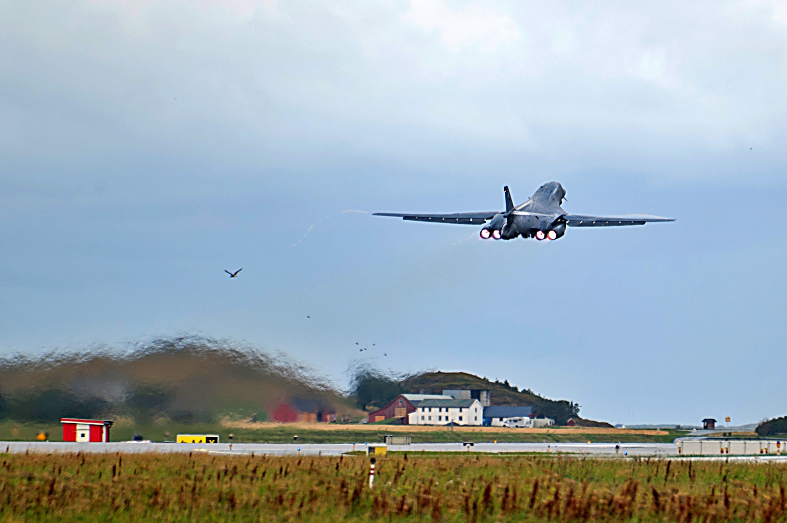 미 공군 제345 전방 폭격대대 소속 미국 공군 B-1B Lancer 폭격기가 2025년 8월 21일 노르웨이 Ørland 공군기지에서 Bomber Task Force Europe 지원을 위해 이륙하고 있다. 미국 전략폭격기는 NATO 동맹국의 지도