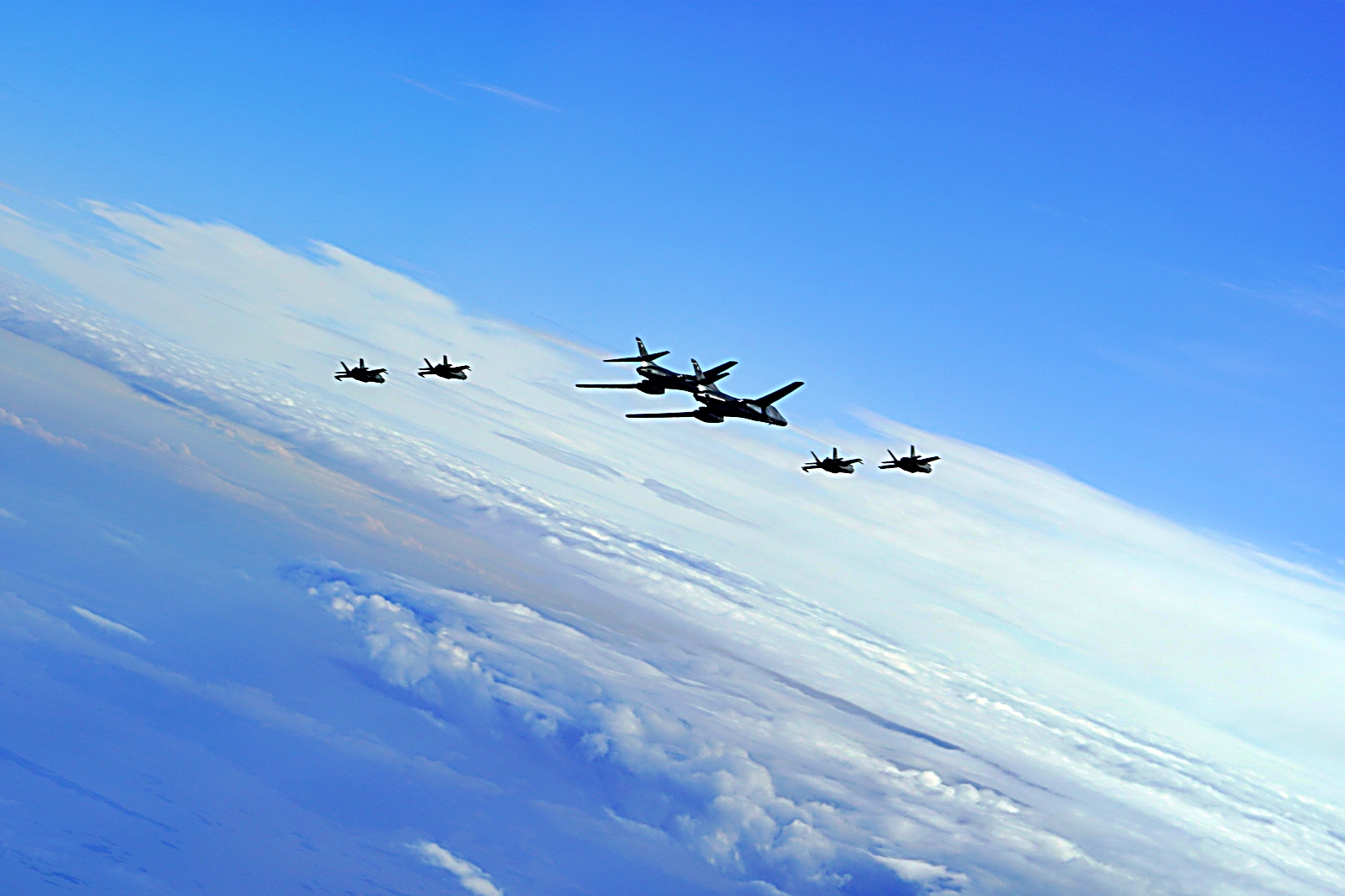 미국 공군 제345원정폭격대대에 소속된 B-1B Lancer 폭격기와 노르웨이 왕립 공군 F-35 공격기 4대가 2025년 8월 21일 ‘Bomber Task Force Europe’ 작전 배치 중 노르웨이 하늘에서 연합훈련을 실시하고 있다.