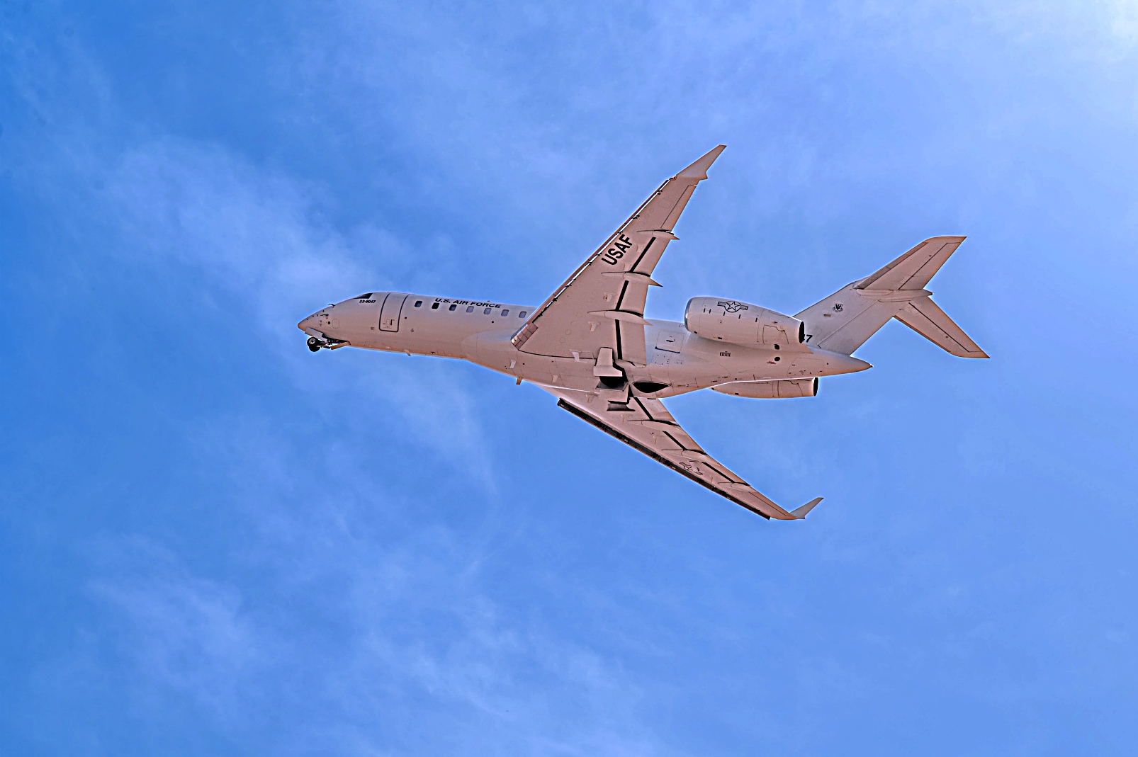 2025년 8월 19일, E-11A 전장 공중 통신 노드(Battlefield Airborne Communications Node)를 장착한 통신중계기가 이륙하고 있다. E-11A는 BACN을 이용하여 항공기가 위성과 유사한 기능을 수행하며 AOR 전역에 걸쳐 공중 지휘 및 통제 능력을 확장하는 통신 플랫폼을 제공한다.
