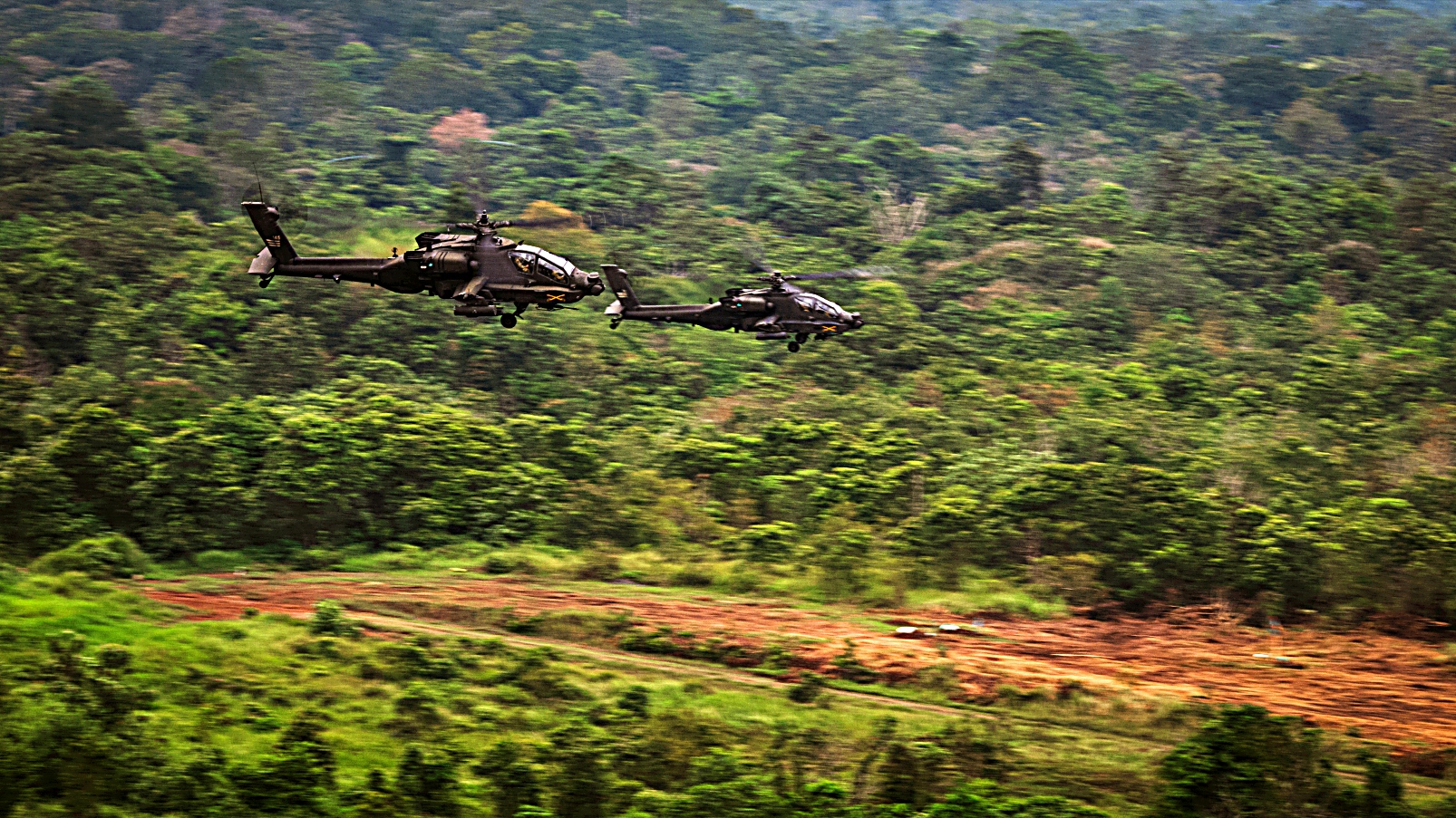 미국 와싱톤주 Lewis-McChord 합동기지에 배치되어 있는 육군 제16전투항공여단 제6기병연대 제4대대에 소속된 AH-64E Apache Guardian 공격헬리콥터가 2025년 8월 31일, 인도네시아 Baturaja에서 열린 Super Garuda Shield 25 합동 지상 타격 예행연습중 미 육군, 인도네시아 국군, 호주 국방군, 일본 자위대와 함께 사격 위치로 진입하고 있다.