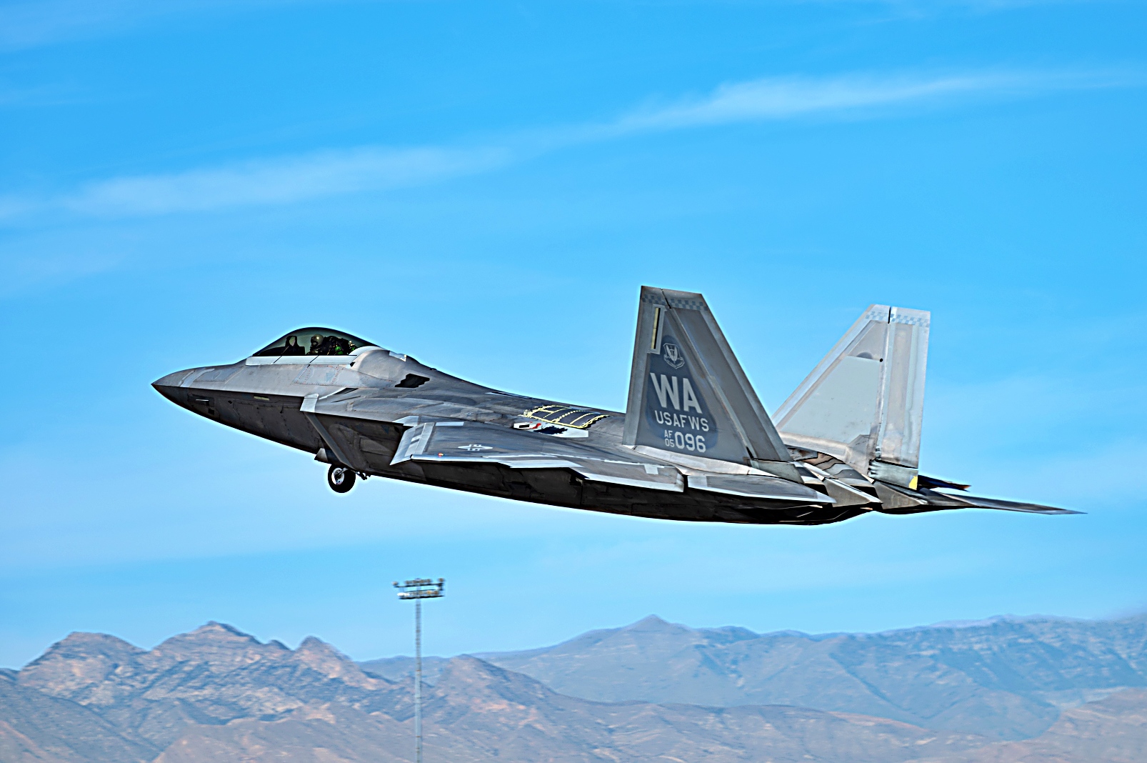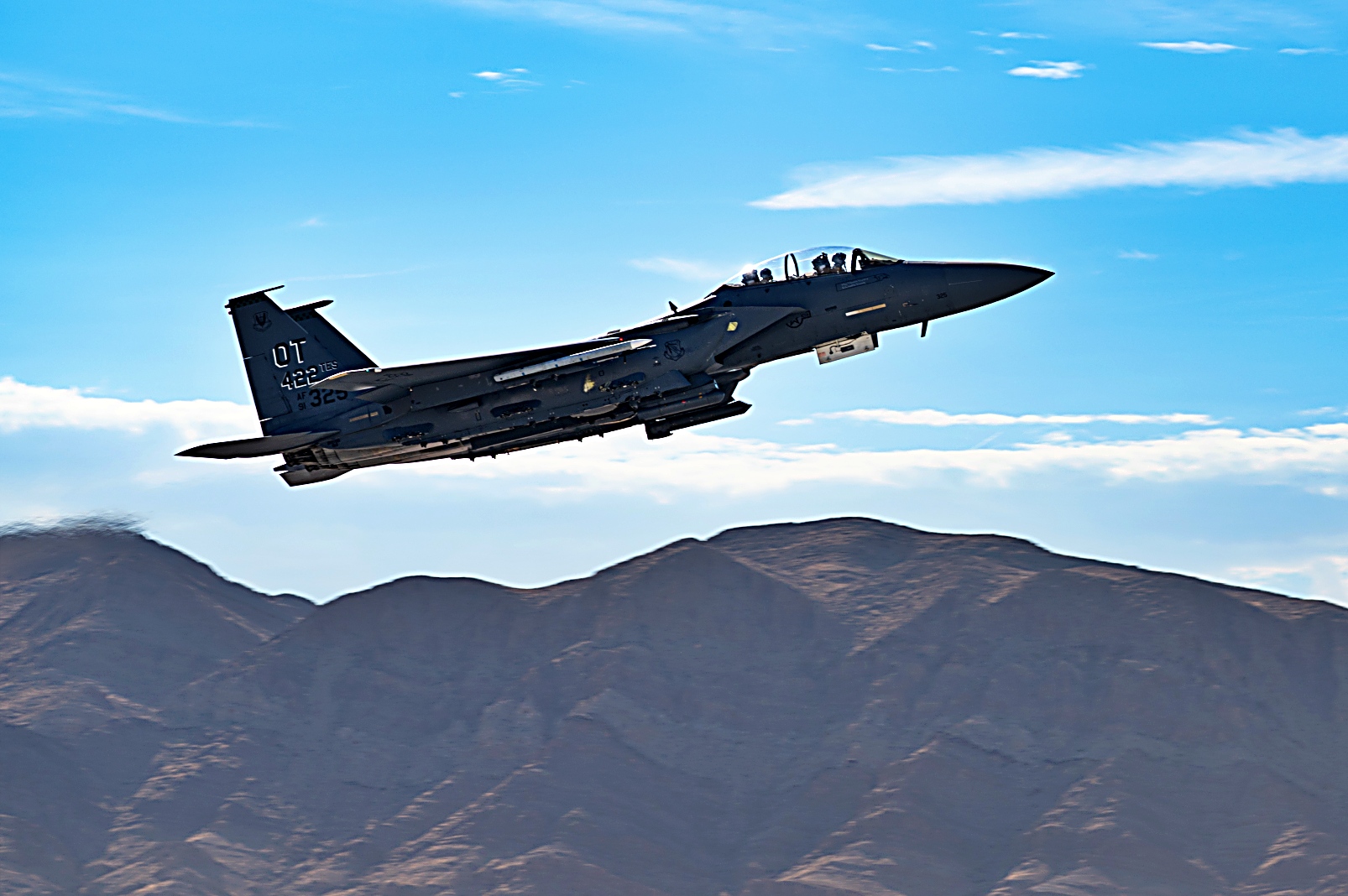 2025년 8월 21일, 미국 공군 무기학교(USAFWS) 예하 제433 무기비행대대 소속 미 공군 F-22 Raptor 스텔스 전투기와 제422 시험평가비행대대 소속 F-15E Strike Eagle 전폭기가 네바다주 Nellis 공군기지에서 훈련 임무를 위해 이륙하고 있다.