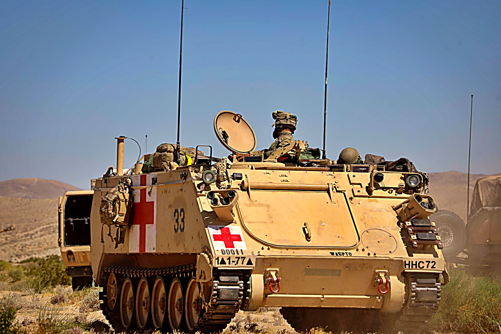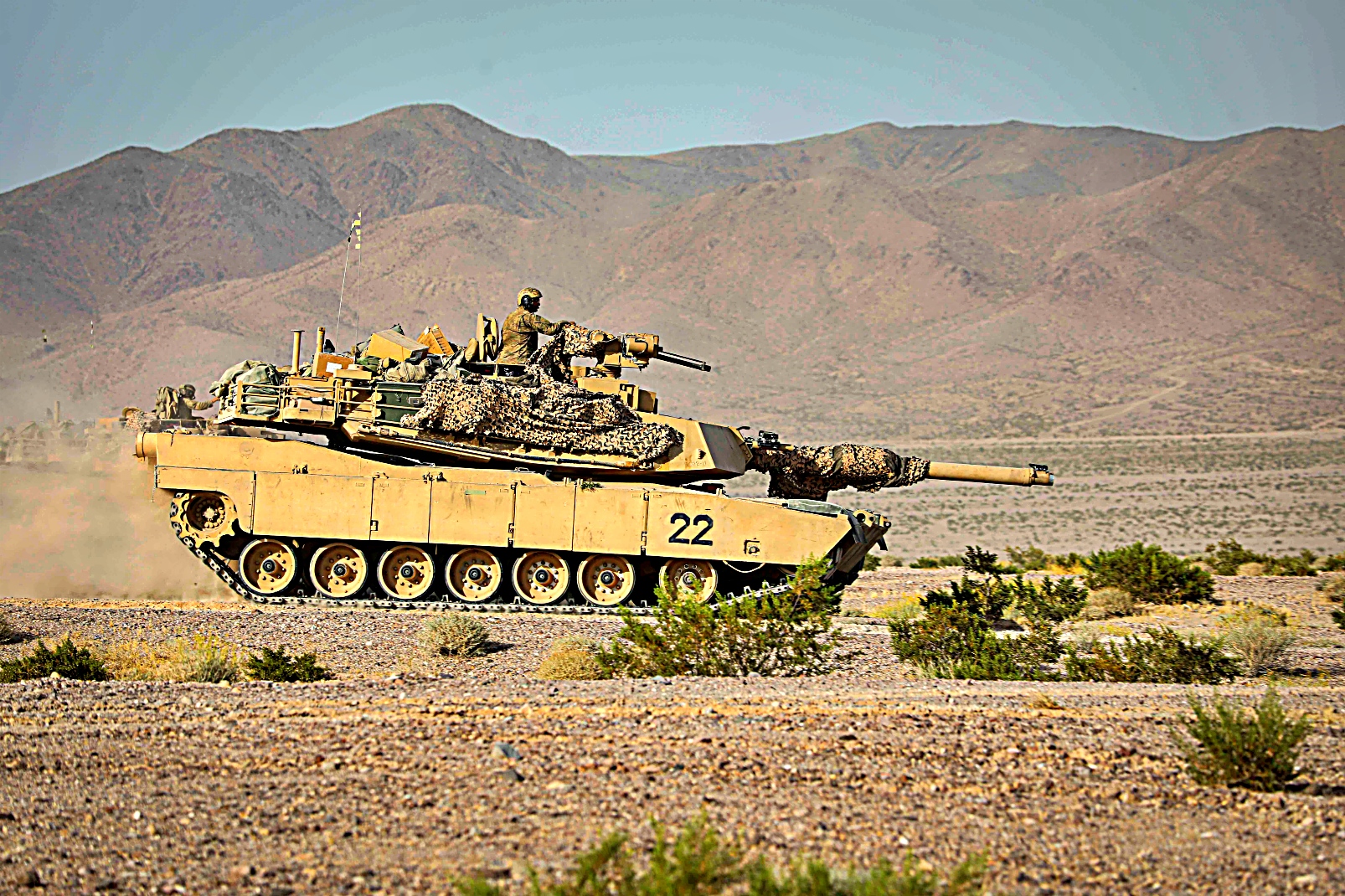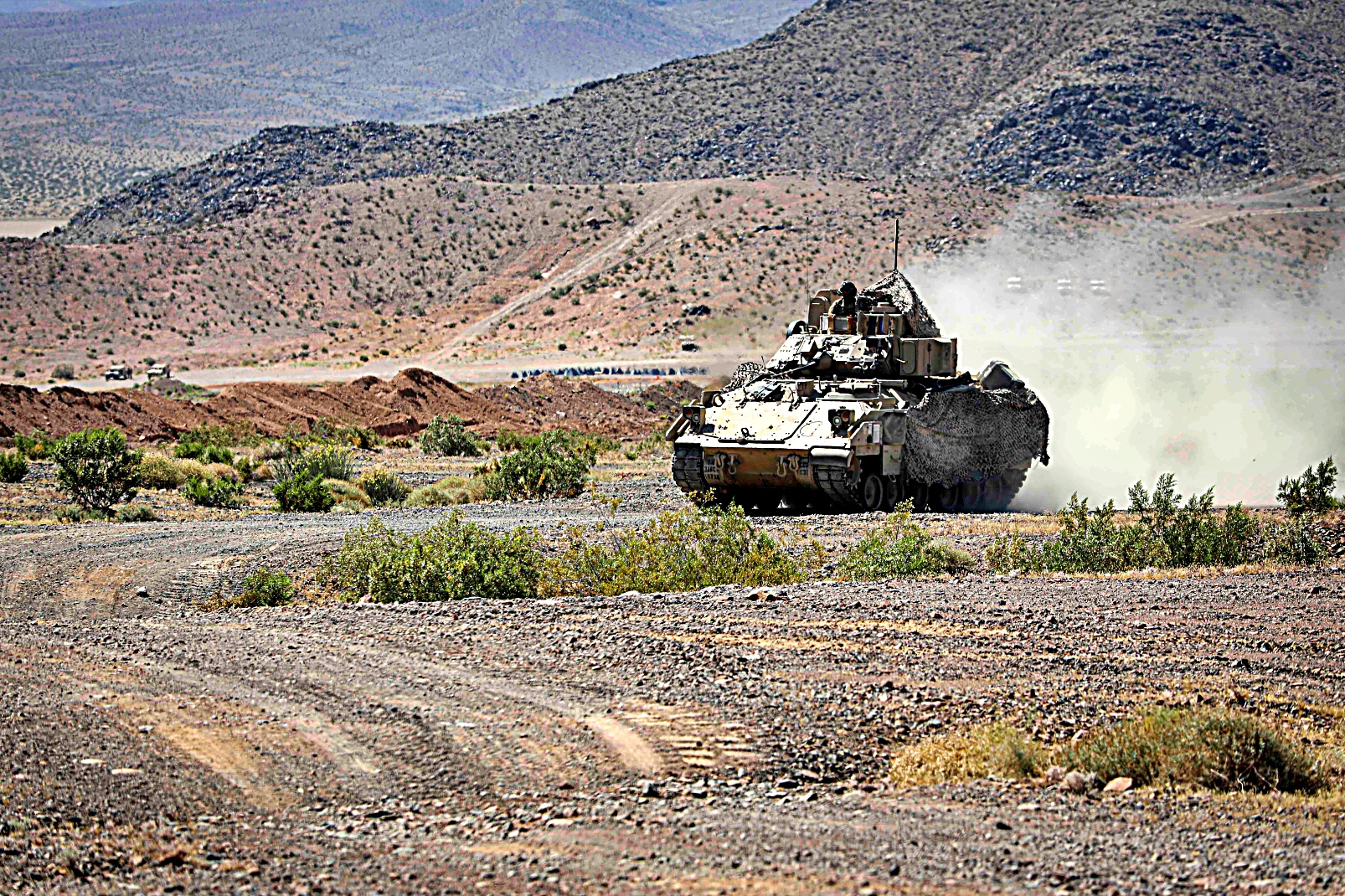 2024년 6월 3일, 캘리포니아주 Fort Irwin 소재 미 육군 National Training Center에서 진행된 24-08 순환훈련 중, 제1기갑사단 제3기갑여단전투단 제67기갑연대 제1대대 소속 M1 Abrams 전차와 M2A3 보병전투장갑차, 제2여단공병대대 ABV 및 제77기갑연대 제1대대 M113A3 장갑들이 거친 사막지형을 기동하고 있다.