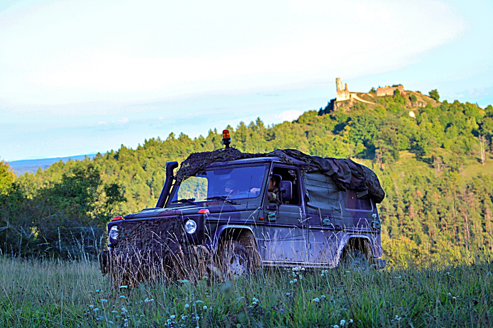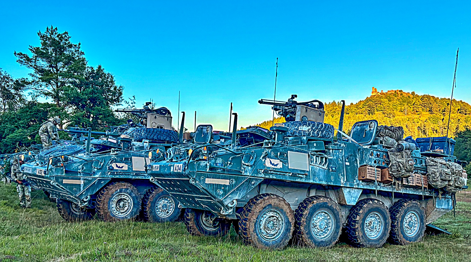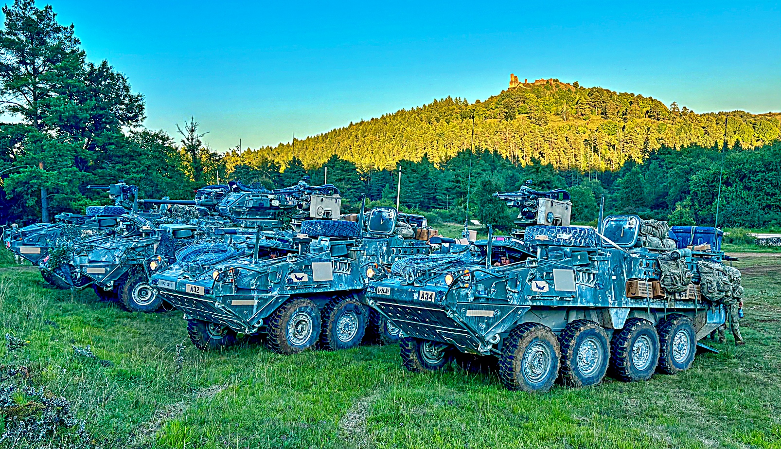 2025년 9월 6일, 독일 Hohenfels 소재 합동다국적훈련센터(JMRC) 산악 지형에서 제2기병연대 제1기병대대 병사들이 호송 보안 작전을 수행한 후 새로운 지휘소 위치를 구축하고 있다. 제2기병연대 전 부대는 방어 진지를 확보하며 적의 공격을 격퇴할 교전 지역을 준비 중이다.