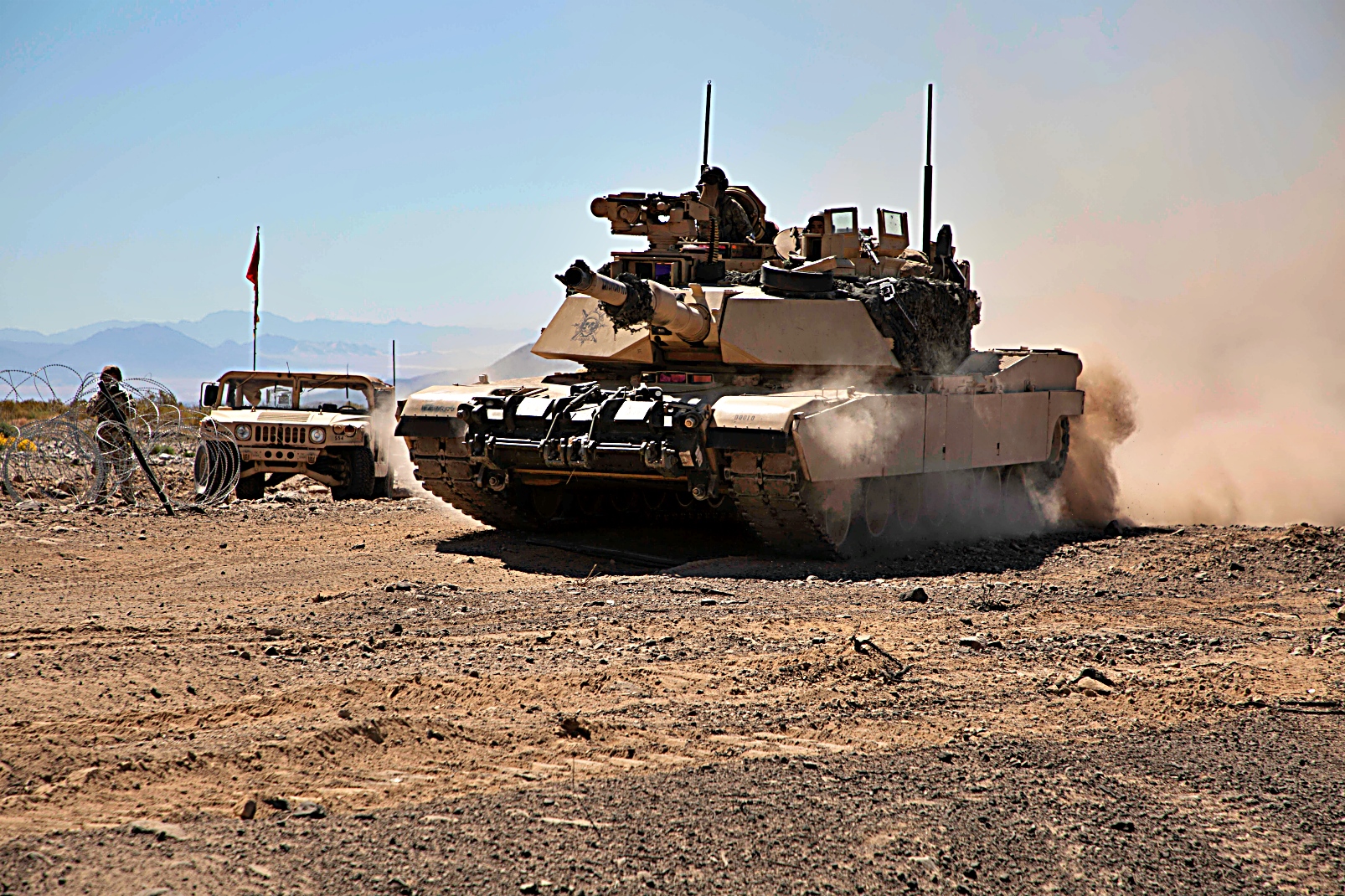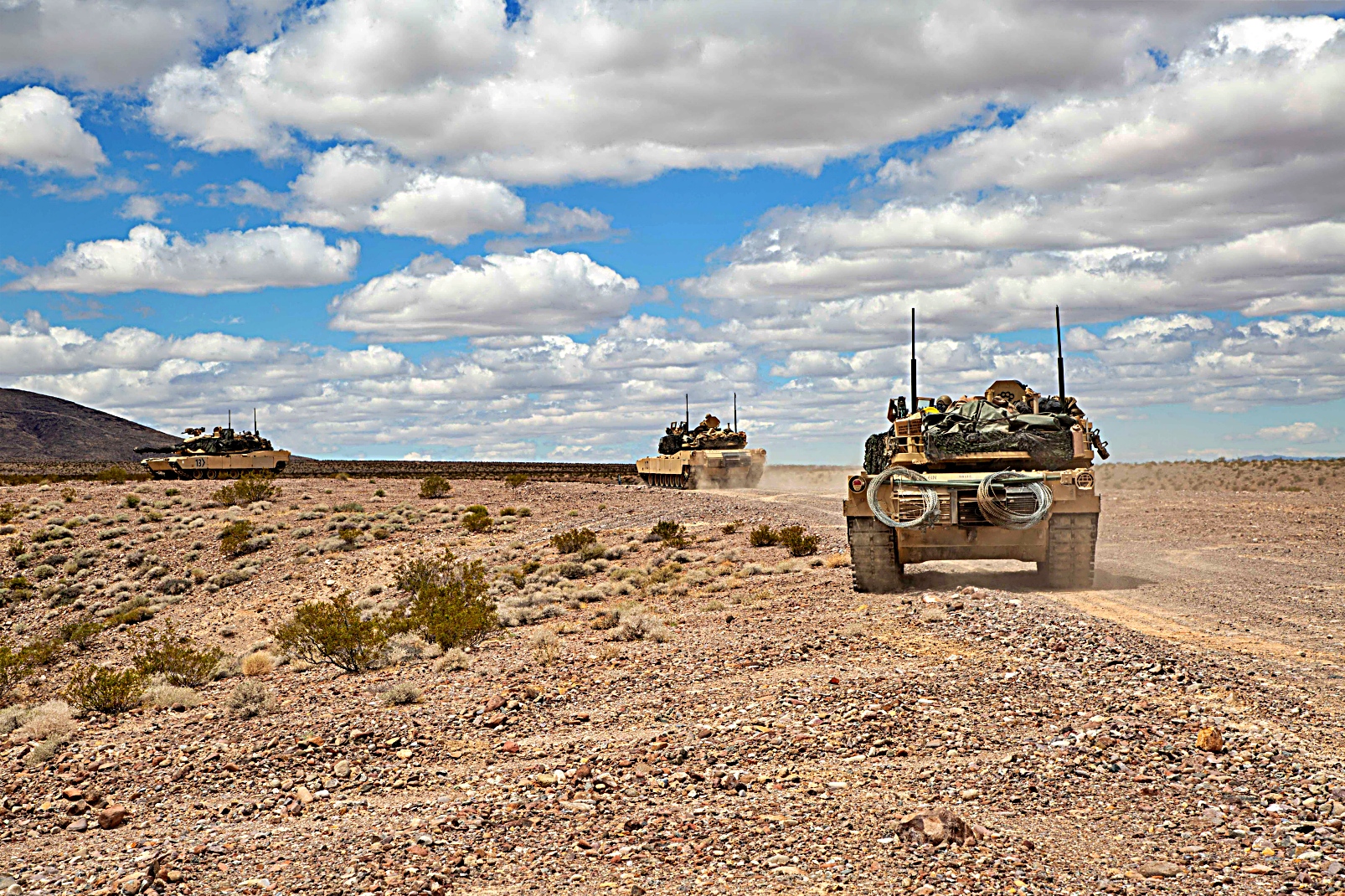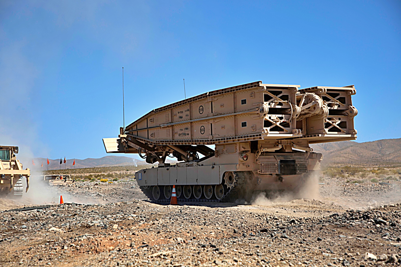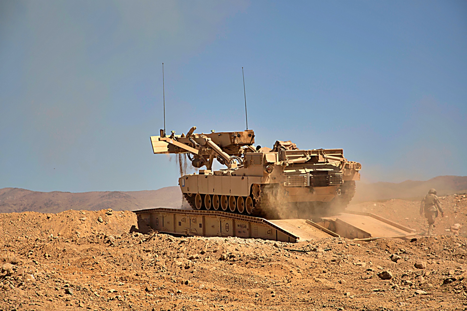 2025년 4월 27일과 5월 8일, 캘리포니아주 Fort Irwin 소재 National Training Center에서 진행된 Rotation 25-07 훈련 중, 제1기갑사단 제2전투여단 제40공병대대 소속 불도저와 제1기갑사단 제2여단 전투단 제40여단 공병대대 소속 합동돌격교량 Joint Assault Bridge 를 이용해 돌파 작전을 수행하는 가운데 제1기갑사단 제2여단전투단 제6보병사단 제1대대 소속 M1 Abrams 전차가 기동하고 있다.