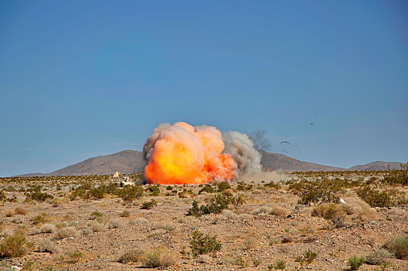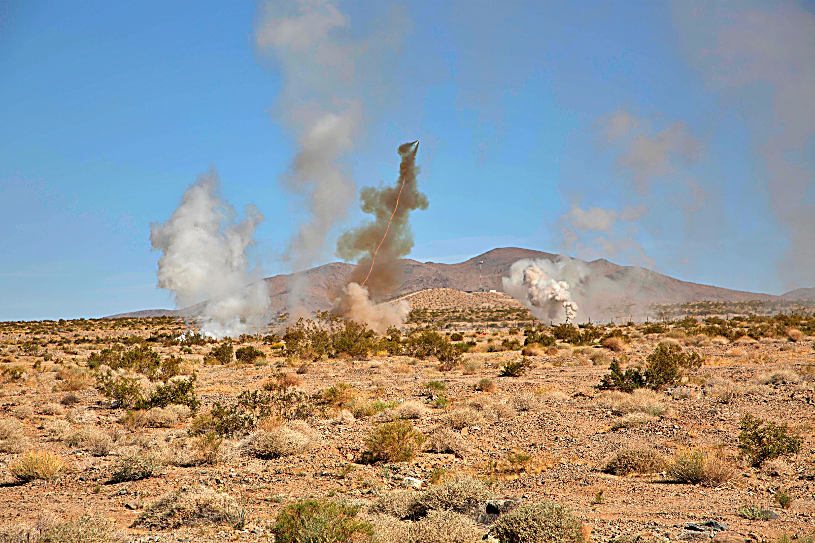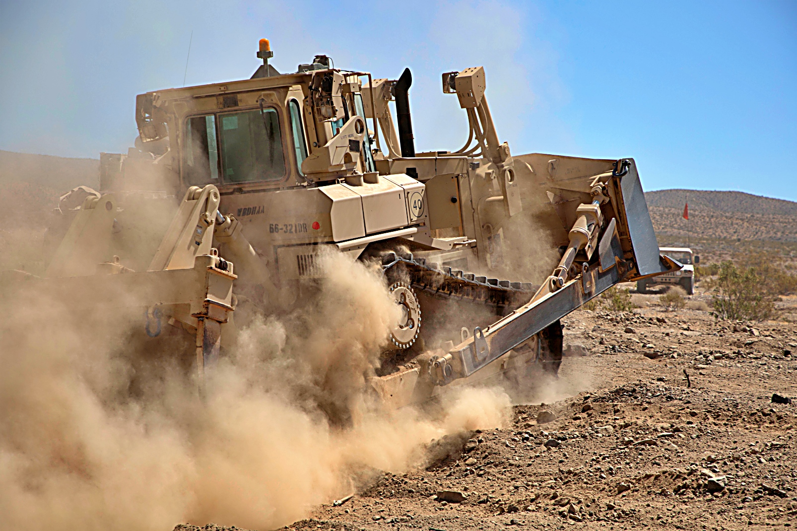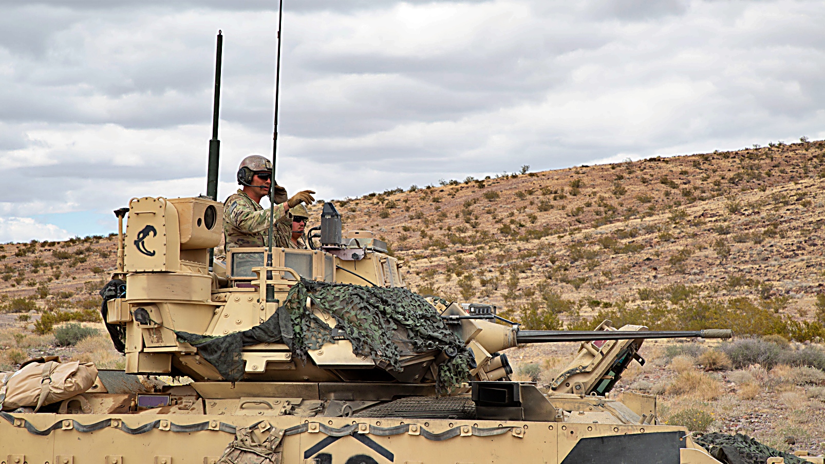 2025년 4월 27일과 5월 8일, 캘리포니아주 Fort Irwin 소재 National Training Center에서 진행된 Rotation 25-07 훈련 중, 제1기갑사단 제2전투여단 제40공병대대 소속 불도저와 제1기갑사단 제2여단 전투단 제40여단 공병대대 소속 합동돌격교량 Joint Assault Bridge 를 이용해 돌파 작전을 수행하는 가운데 제1기갑사단 제2여단전투단 제6보병사단 제1대대 소속 M1 Abrams 전차가 기동하고 있다.