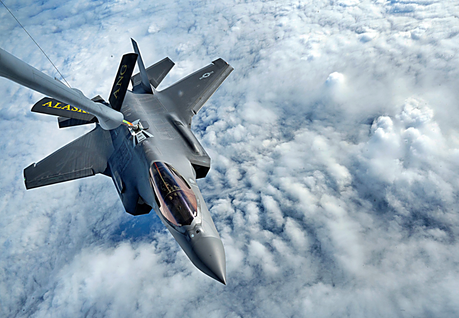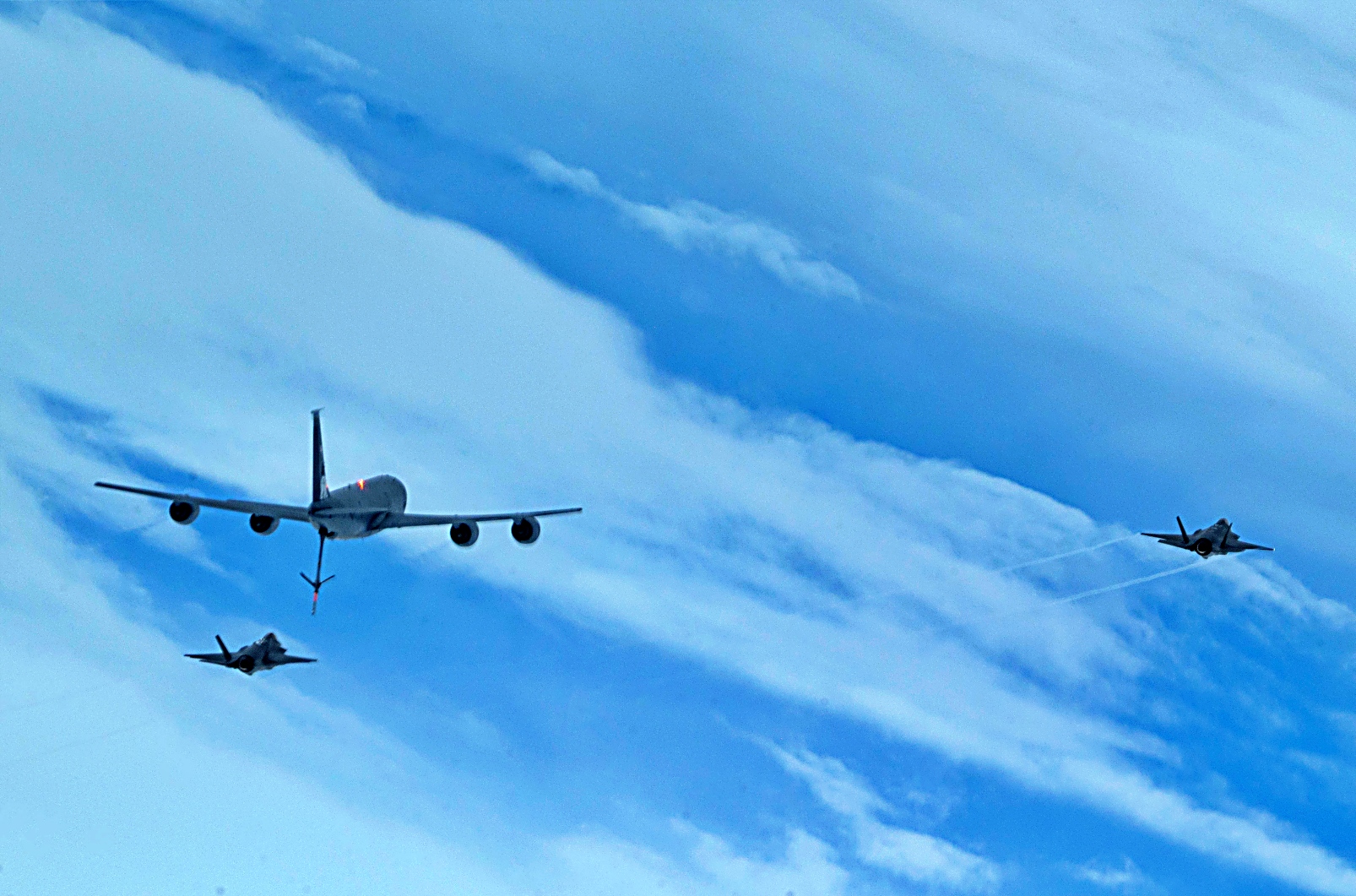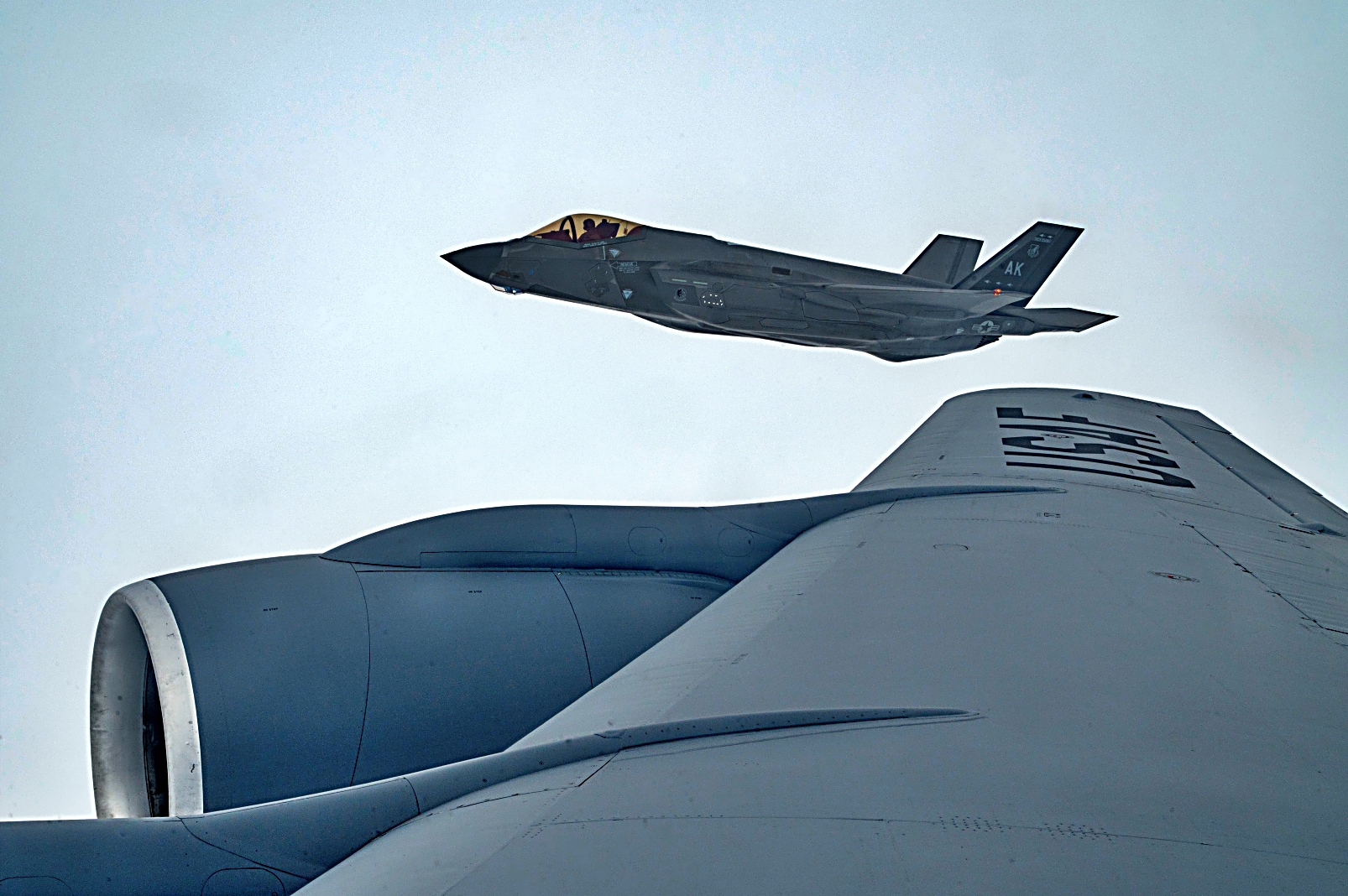 2025년 9월 3일, 알래스카 베링해 상공에서 Eielson 공군기지에서 이륙한 알래스카 주방위군 제168비행단 소속 미 공군 KC-135 Stratotanker를 선두로 미 공군 제354전투비행단 소속 F-35A Lightning II 공격기들이 편대를 이루어 비행하고 있다. KC-135는 F-35 전투기들이 알류샨 열도 (Aleutian Island chain)로 비행하여 캐나다 해군 호위함 HMCS Regina (FFH 334)와 합류하는 동안 공중급유를 수행했다. 이 합동 해상 작전은 미국과 캐나다 군 간의 원활한 상호운용성과 북미 대륙 및 북극에 대한 어떠한 위협도 방어하고 격퇴할 준비가 되어 있음을 보여주는 공동의 의지를 입증했다.