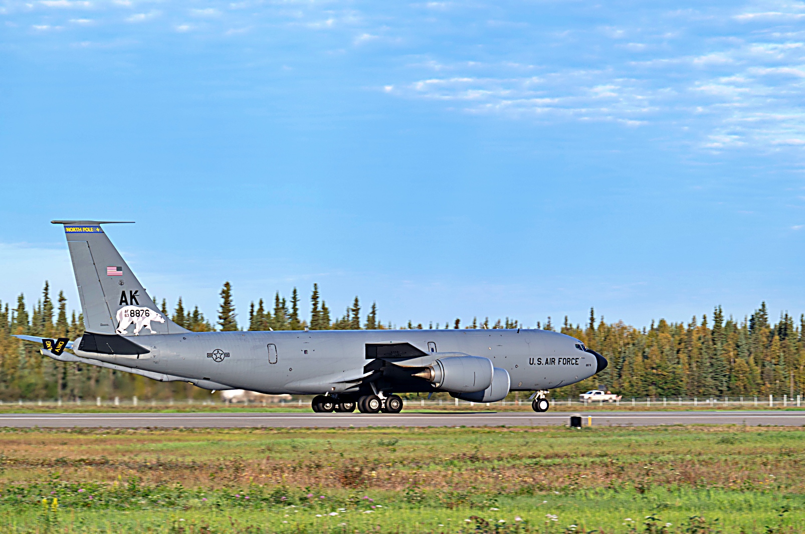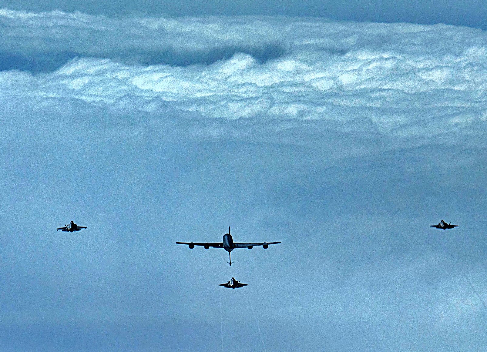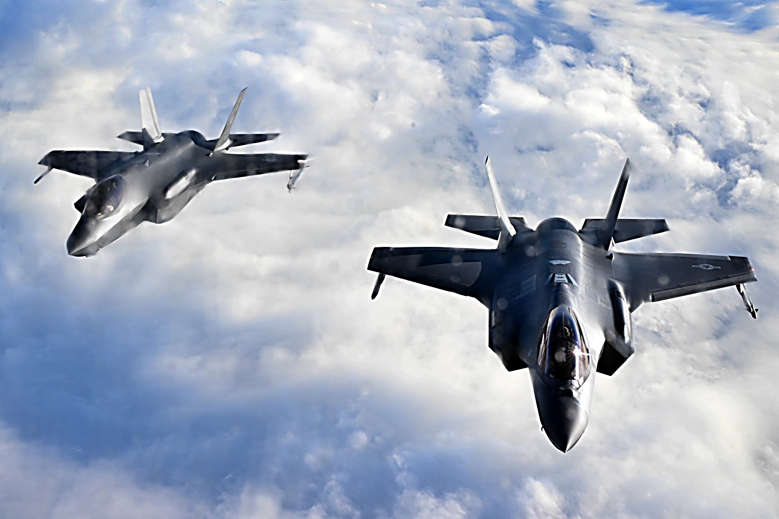 2025년 9월 3일, 알래스카 베링해 상공에서 Eielson 공군기지에서 이륙한 알래스카 주방위군 제168비행단 소속 미 공군 KC-135 Stratotanker를 선두로 미 공군 제354전투비행단 소속 F-35A Lightning II 공격기들이 편대를 이루어 비행하고 있다. KC-135는 F-35 전투기들이 알류샨 열도 (Aleutian Island chain)로 비행하여 캐나다 해군 호위함 HMCS Regina (FFH 334)와 합류하는 동안 공중급유를 수행했다. 이 합동 해상 작전은 미국과 캐나다 군 간의 원활한 상호운용성과 북미 대륙 및 북극에 대한 어떠한 위협도 방어하고 격퇴할 준비가 되어 있음을 보여주는 공동의 의지를 입증했다.
